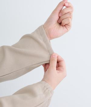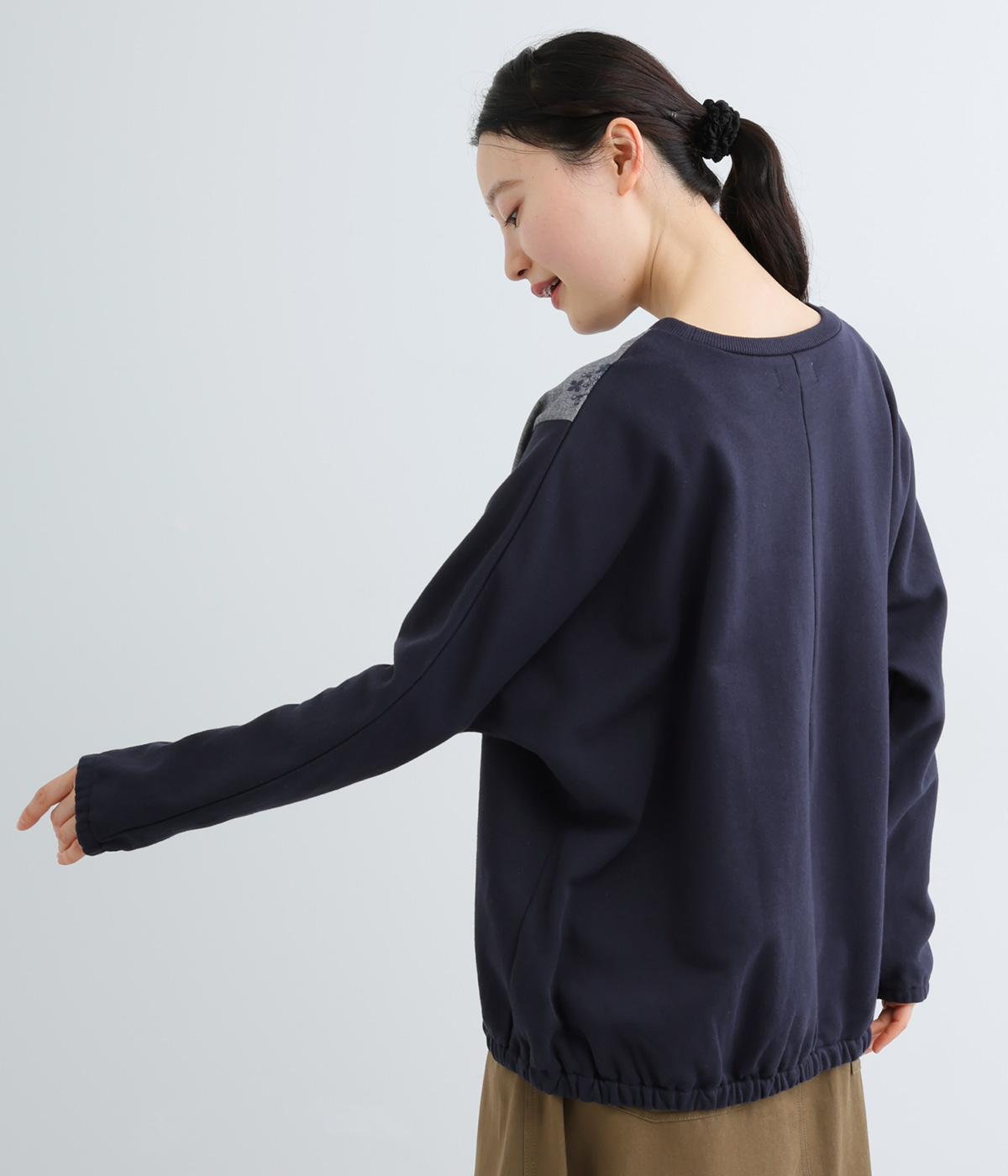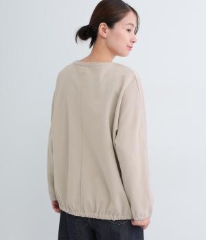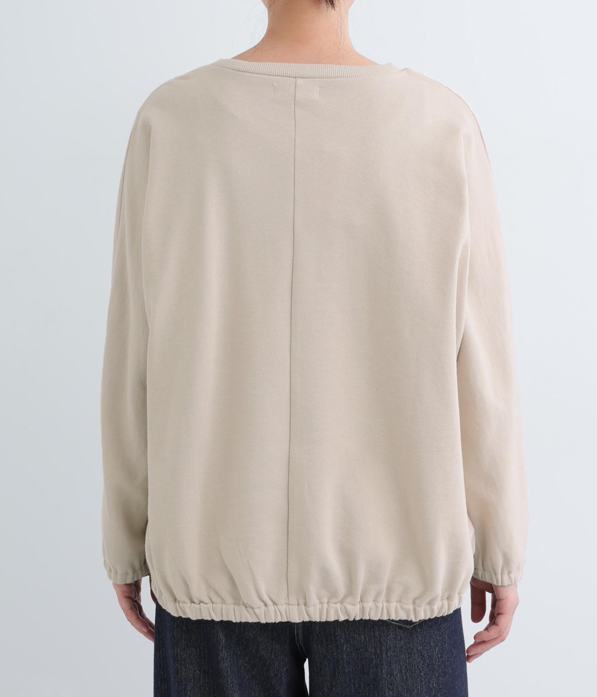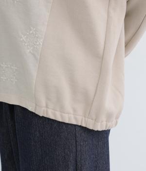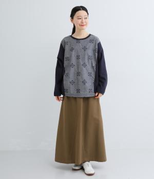 前身頃にはクラシカルな雰囲気の花柄刺しゅうをほどこし、プレーンな後身頃には裾にゴムを配してぽわんとしたシルエットを表現しました。定番のプルオーバーにデザイン性を持たせ、サッと着るだけでスタイリングが決まる一枚です。