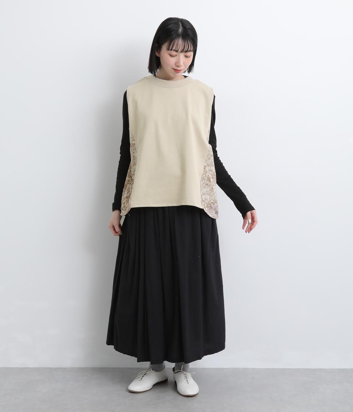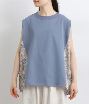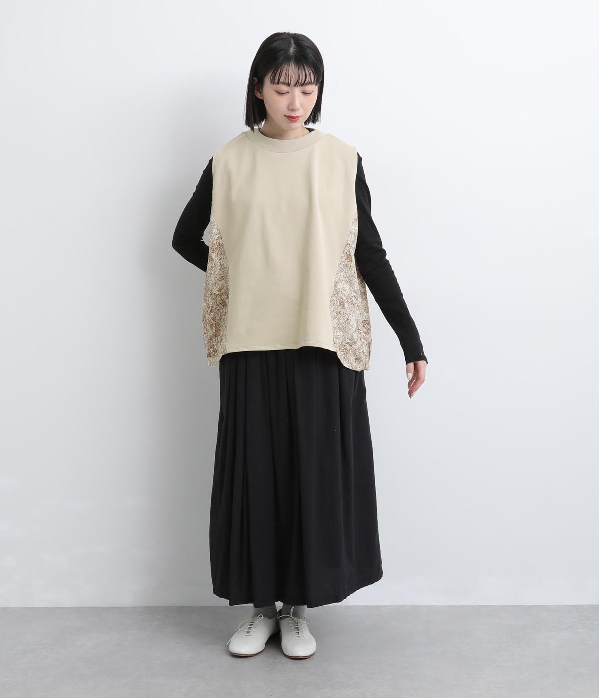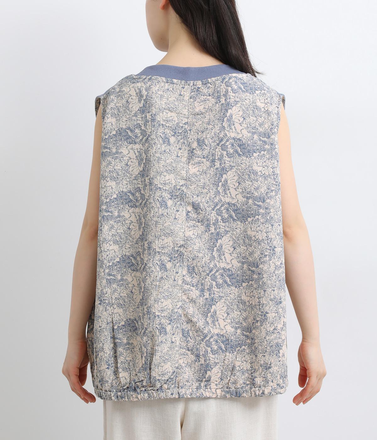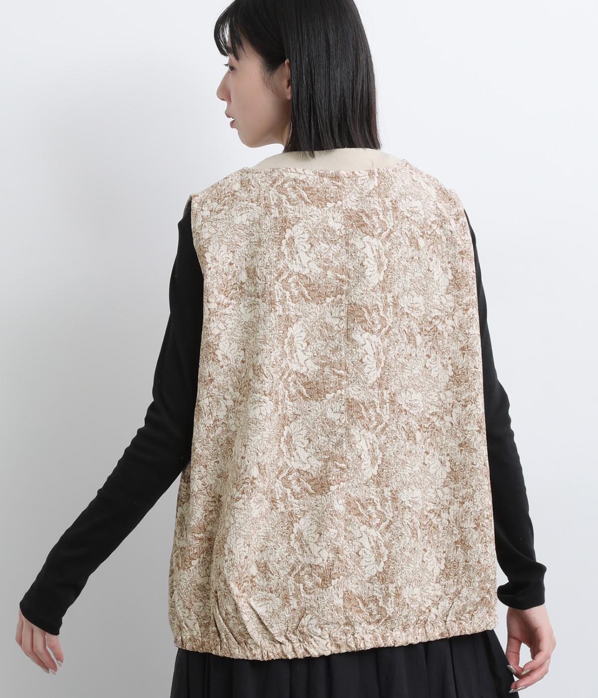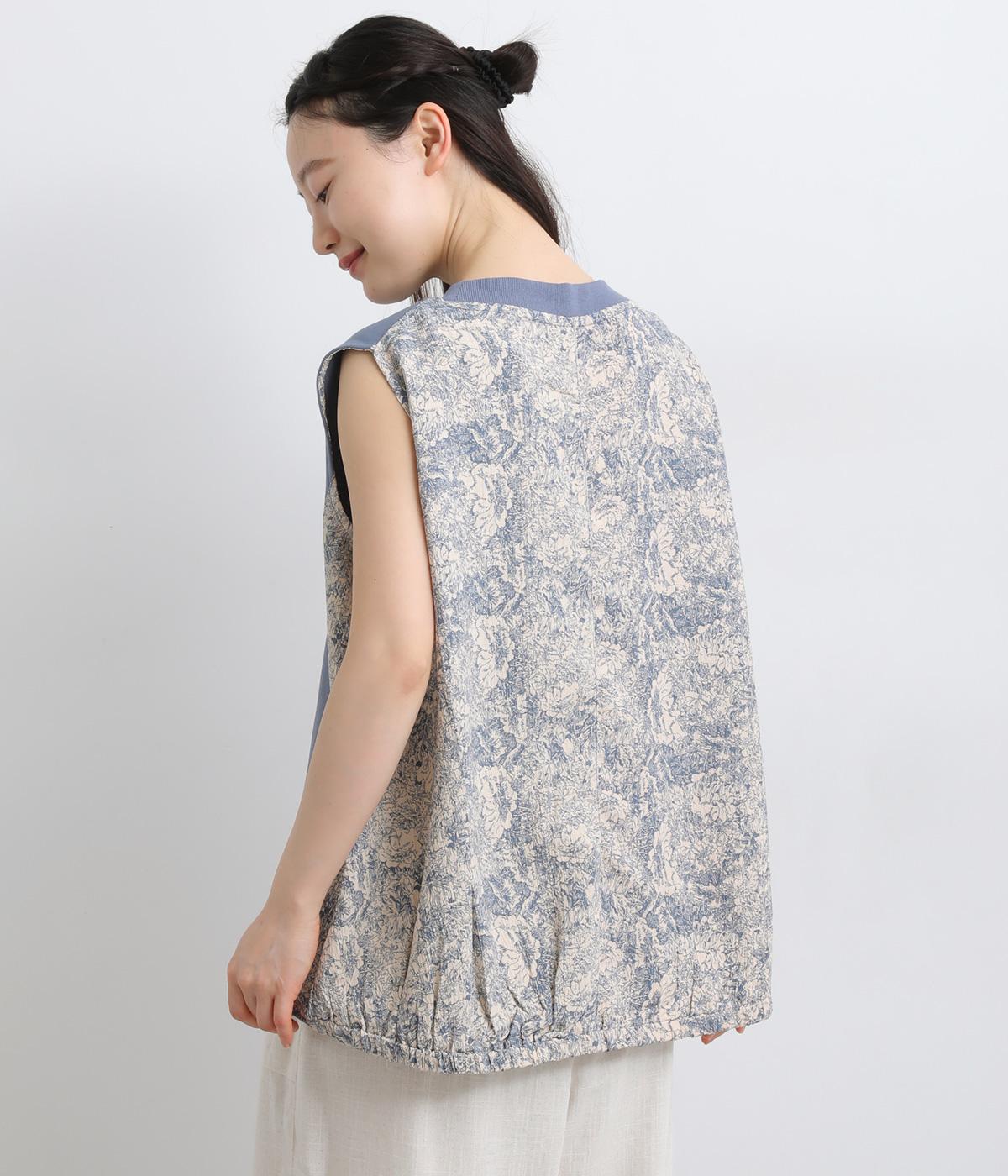 サイドから後ろにかけてビンテージ感ある花柄生地を配し、すっきりとしたシンプルさと華やかさを備えた異素材切り替えベスト。後ろ裾にゴムギャザーを入れてふんわりと包み込むようなシルエットを描きます。