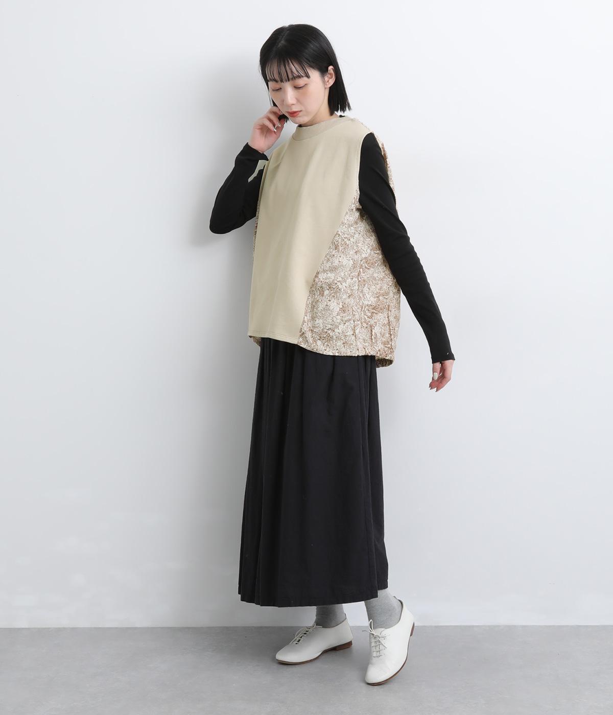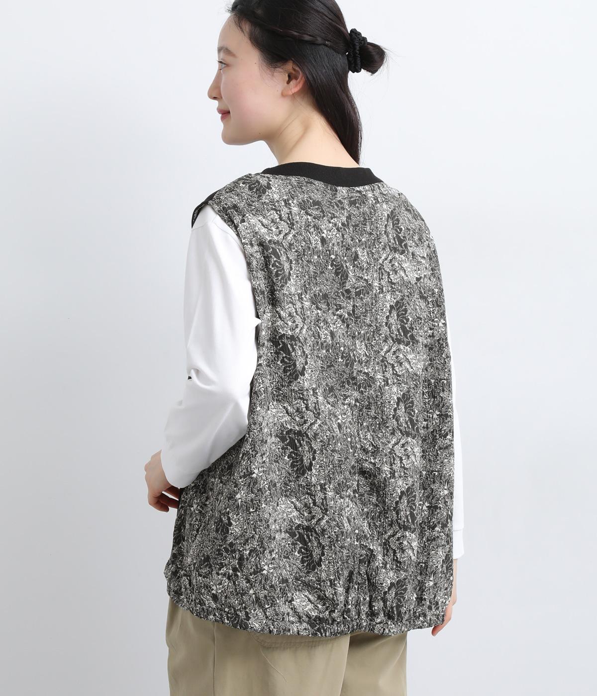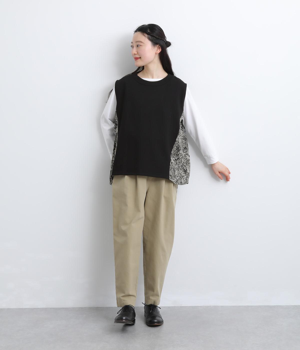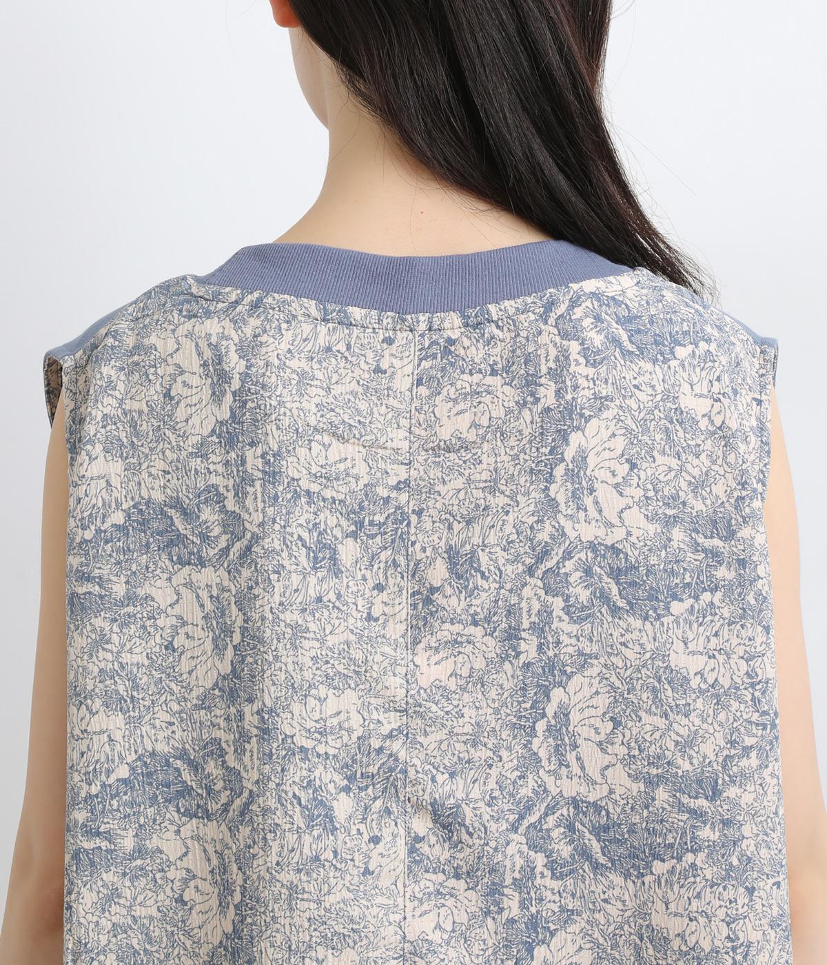 サイドから後ろにかけてビンテージ感ある花柄生地を配し、すっきりとしたシンプルさと華やかさを備えた異素材切り替えベスト。後ろ裾にゴムギャザーを入れてふんわりと包み込むようなシルエットを描きます。