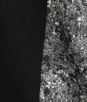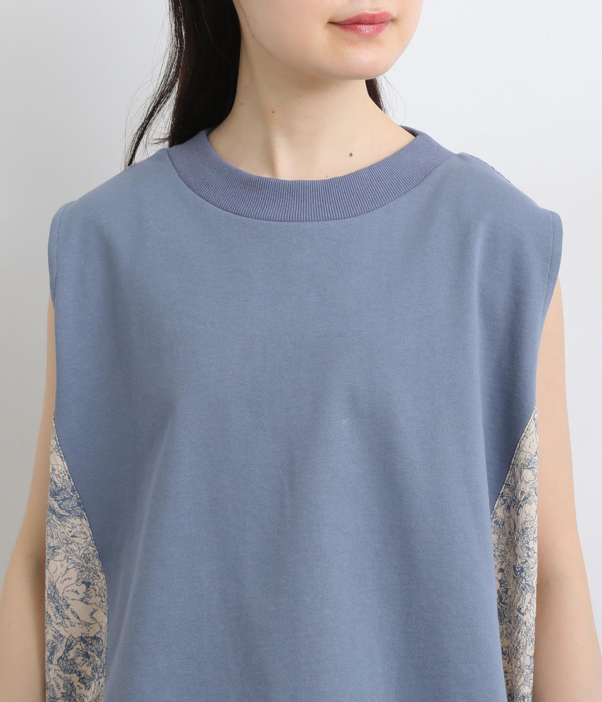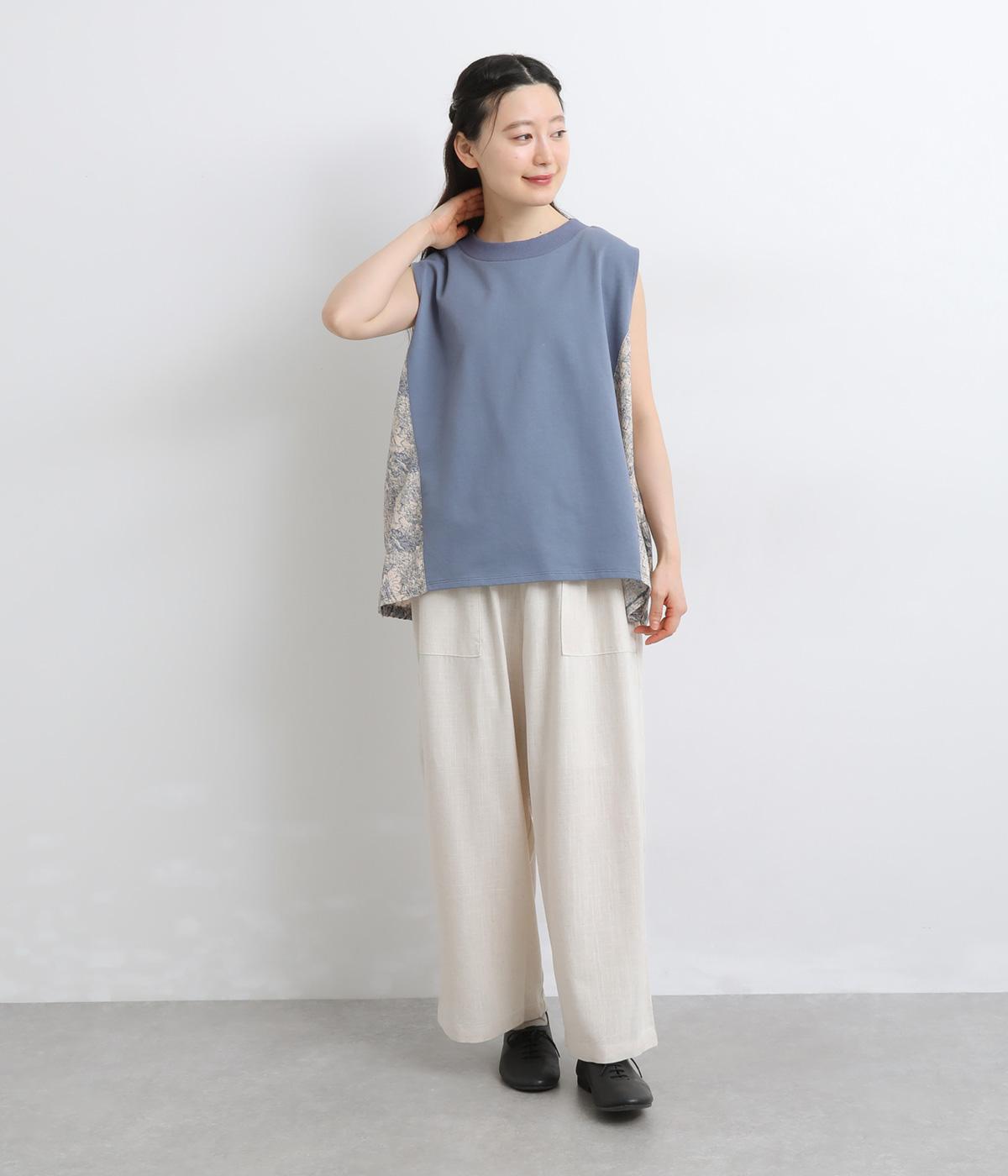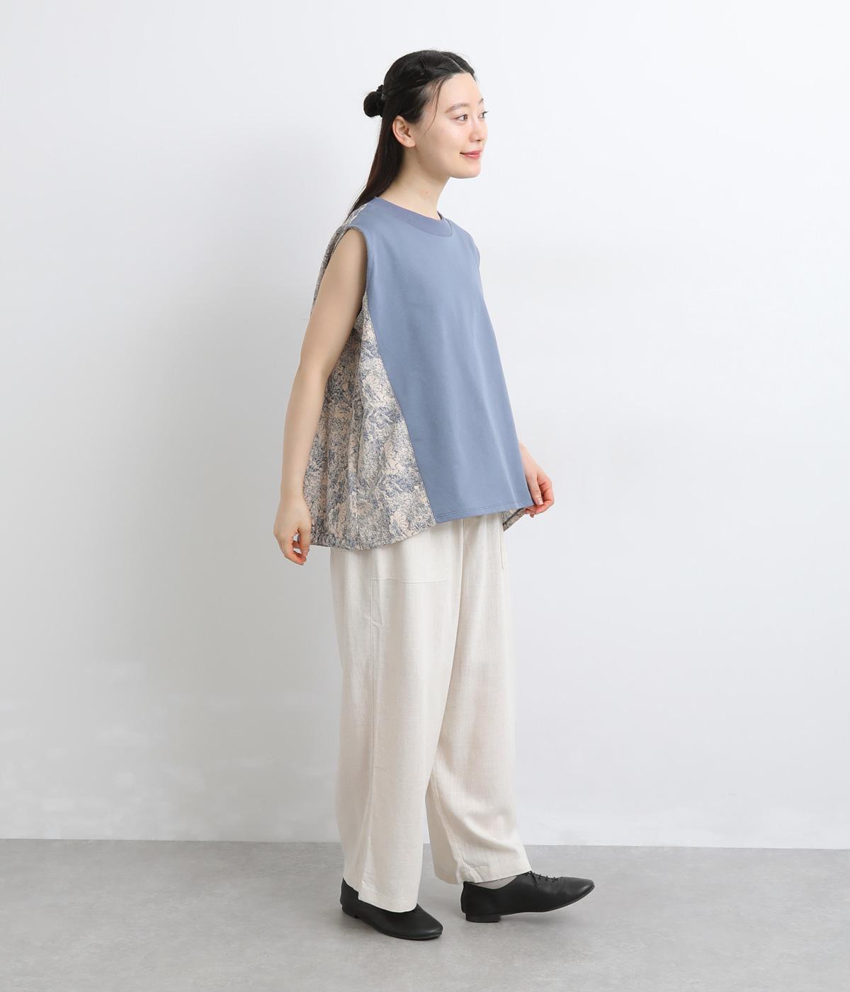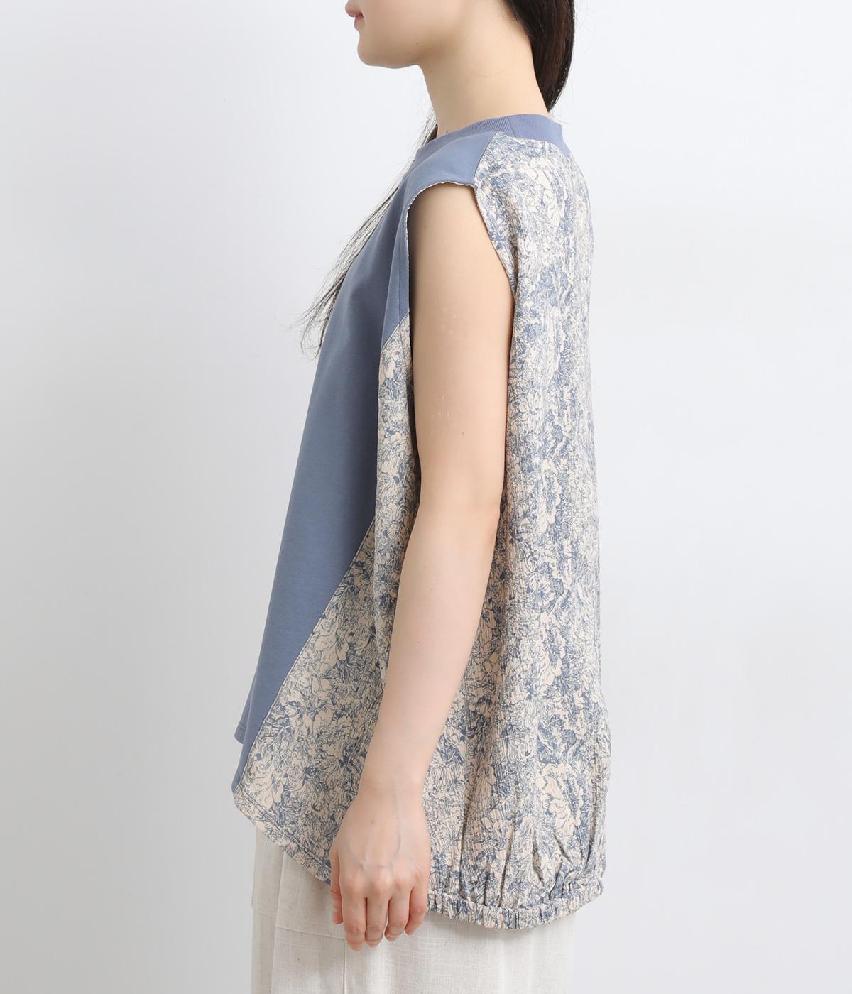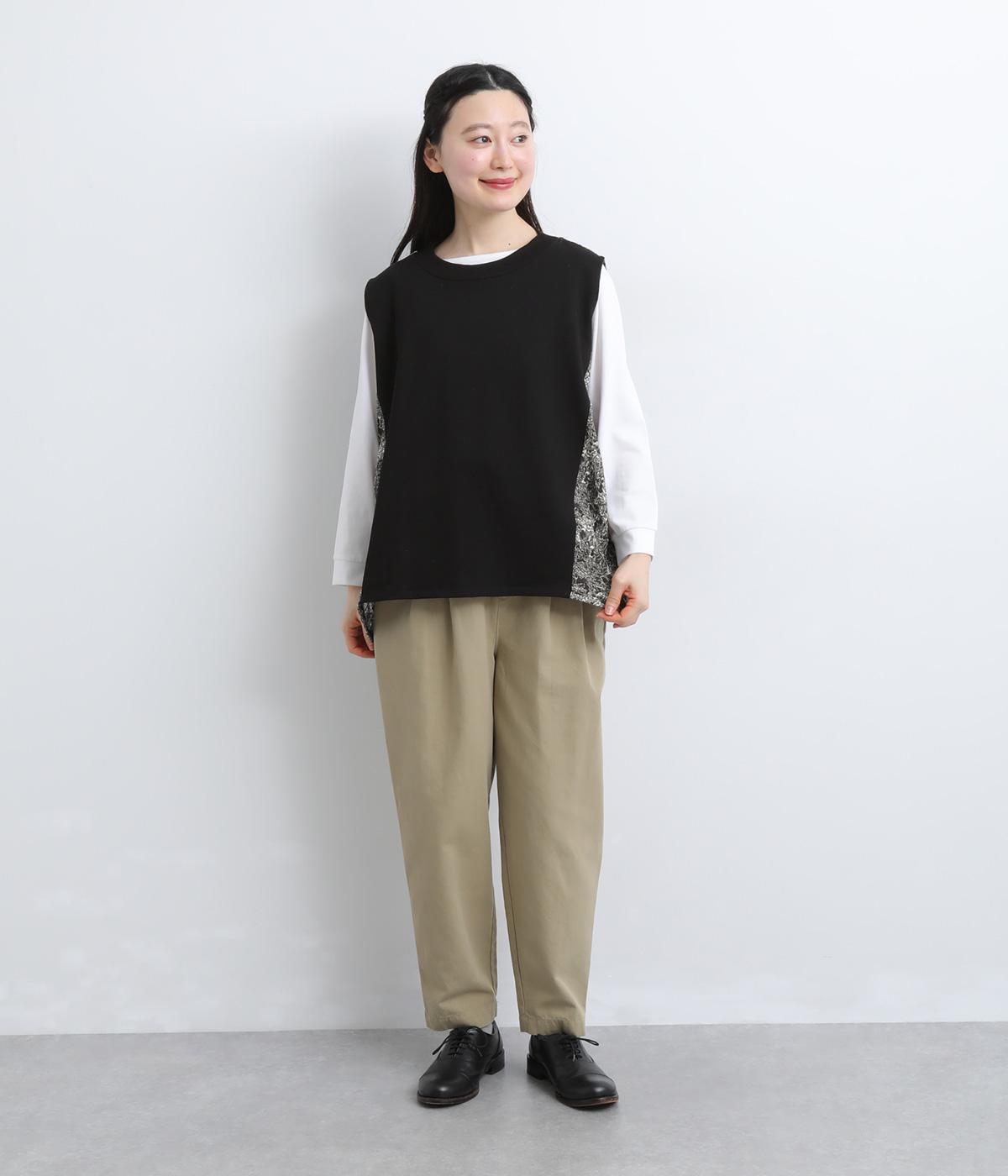 サイドから後ろにかけてビンテージ感ある花柄生地を配し、すっきりとしたシンプルさと華やかさを備えた異素材切り替えベスト。後ろ裾にゴムギャザーを入れてふんわりと包み込むようなシルエットを描きます。