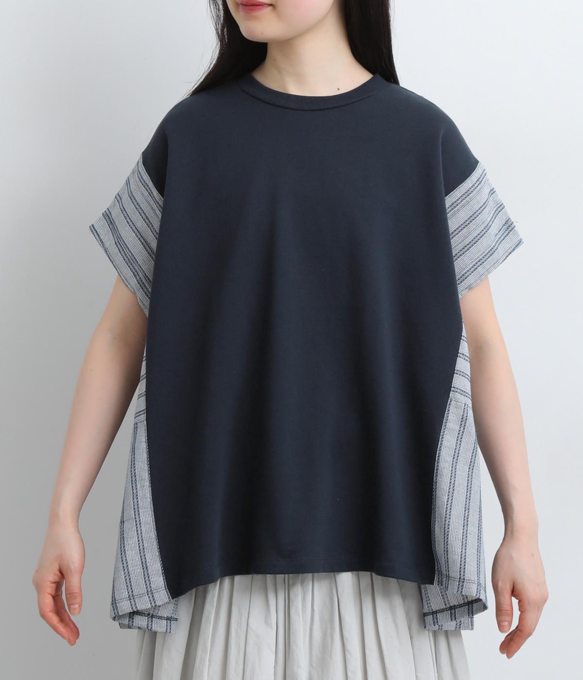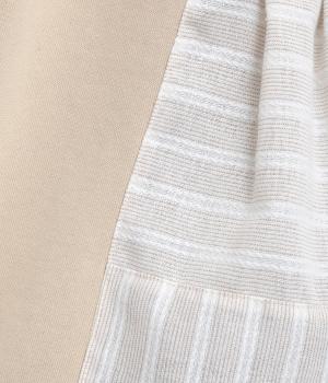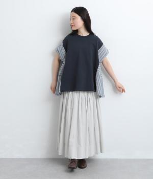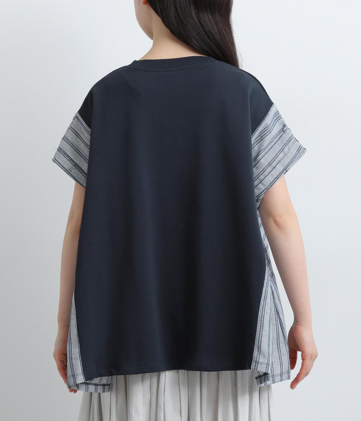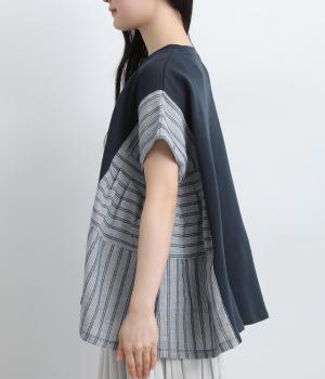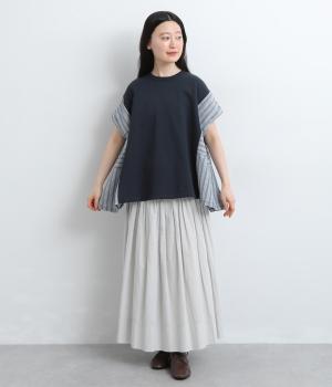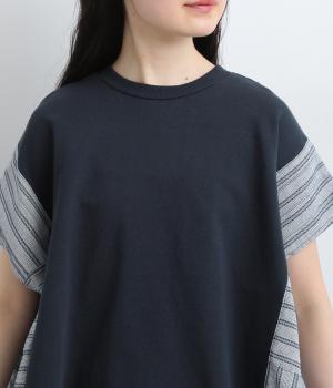 コットンにポリエステルをまぜて軽やかに仕立てた天竺をベースに、さらりと軽やかなストライプ生地を組み合わせました。裏毛生地で肌あたりも快適です。