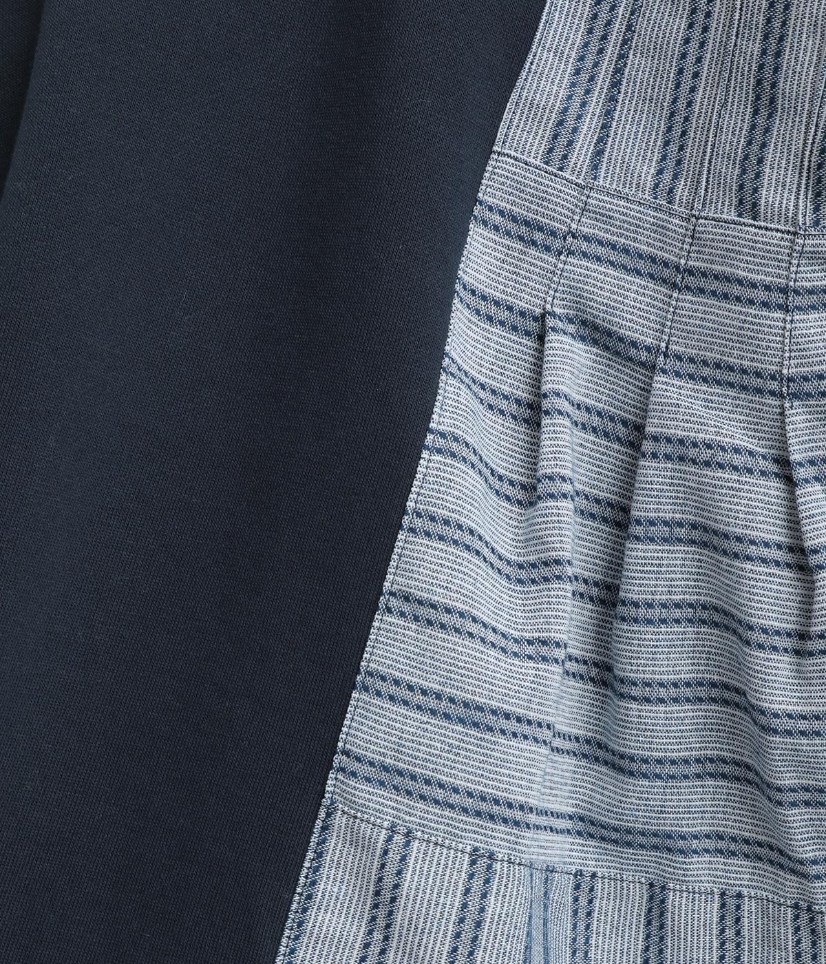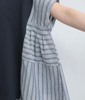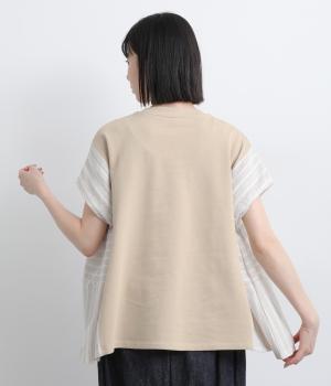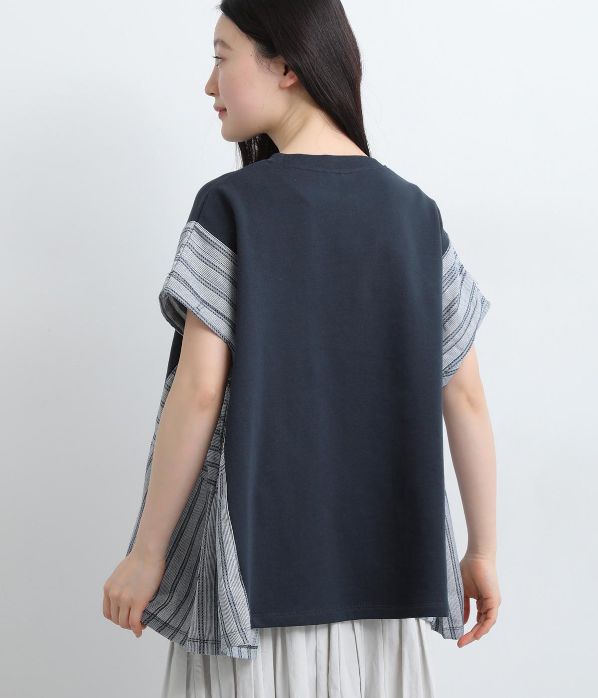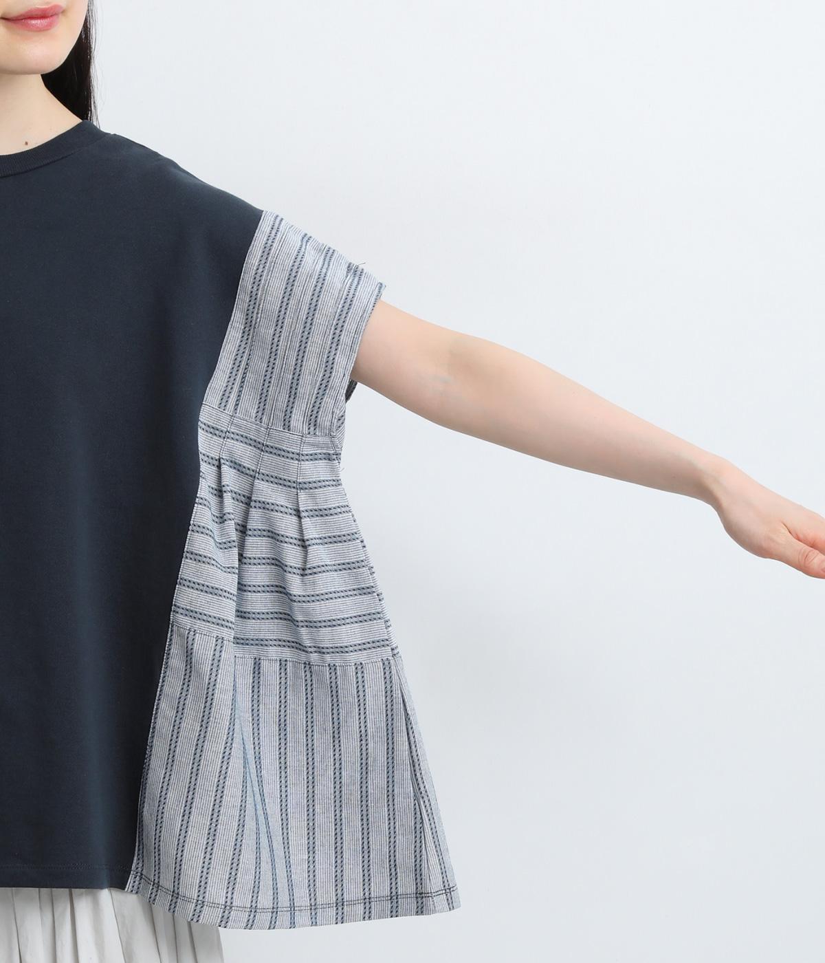 コットンにポリエステルをまぜて軽やかに仕立てた天竺をベースに、さらりと軽やかなストライプ生地を組み合わせました。裏毛生地で肌あたりも快適です。