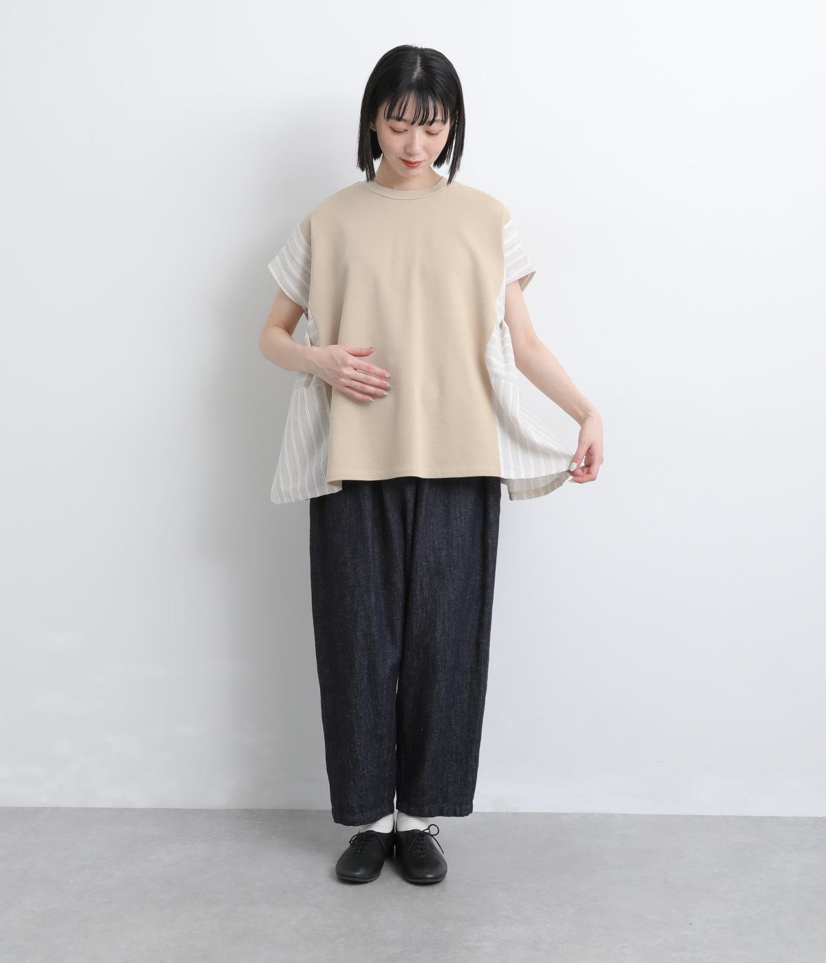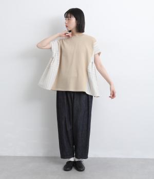 柄生地のサイド切り替えやタックのフレア感が着映えし、着こなしの主役になるベスト。フレンチ感とカットソーのカジュアルさがバランスよく、タックは布帛部分にほどこしているので軽やかに揺れます。