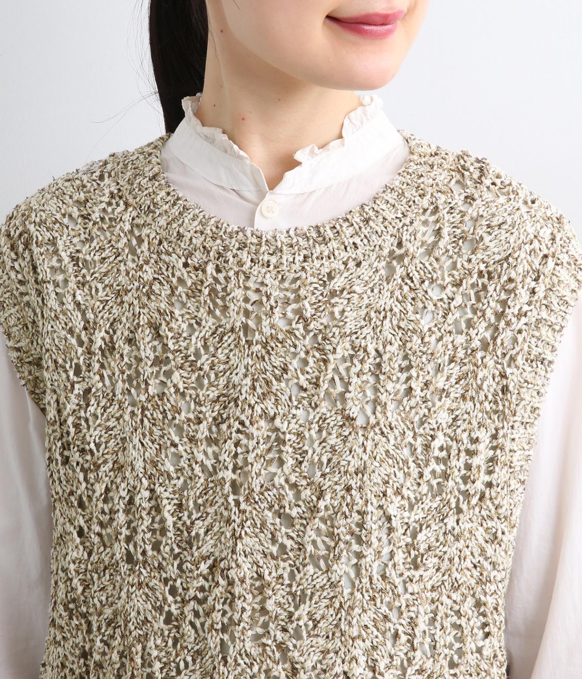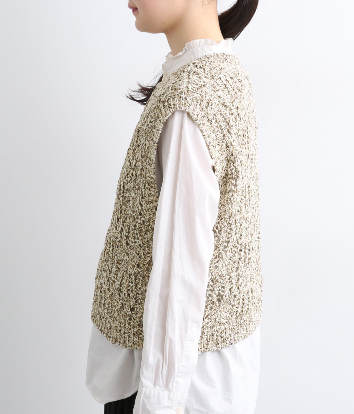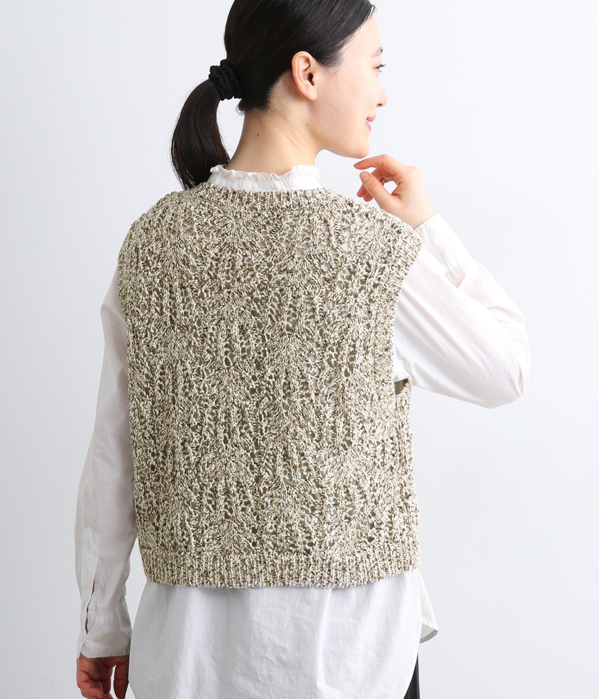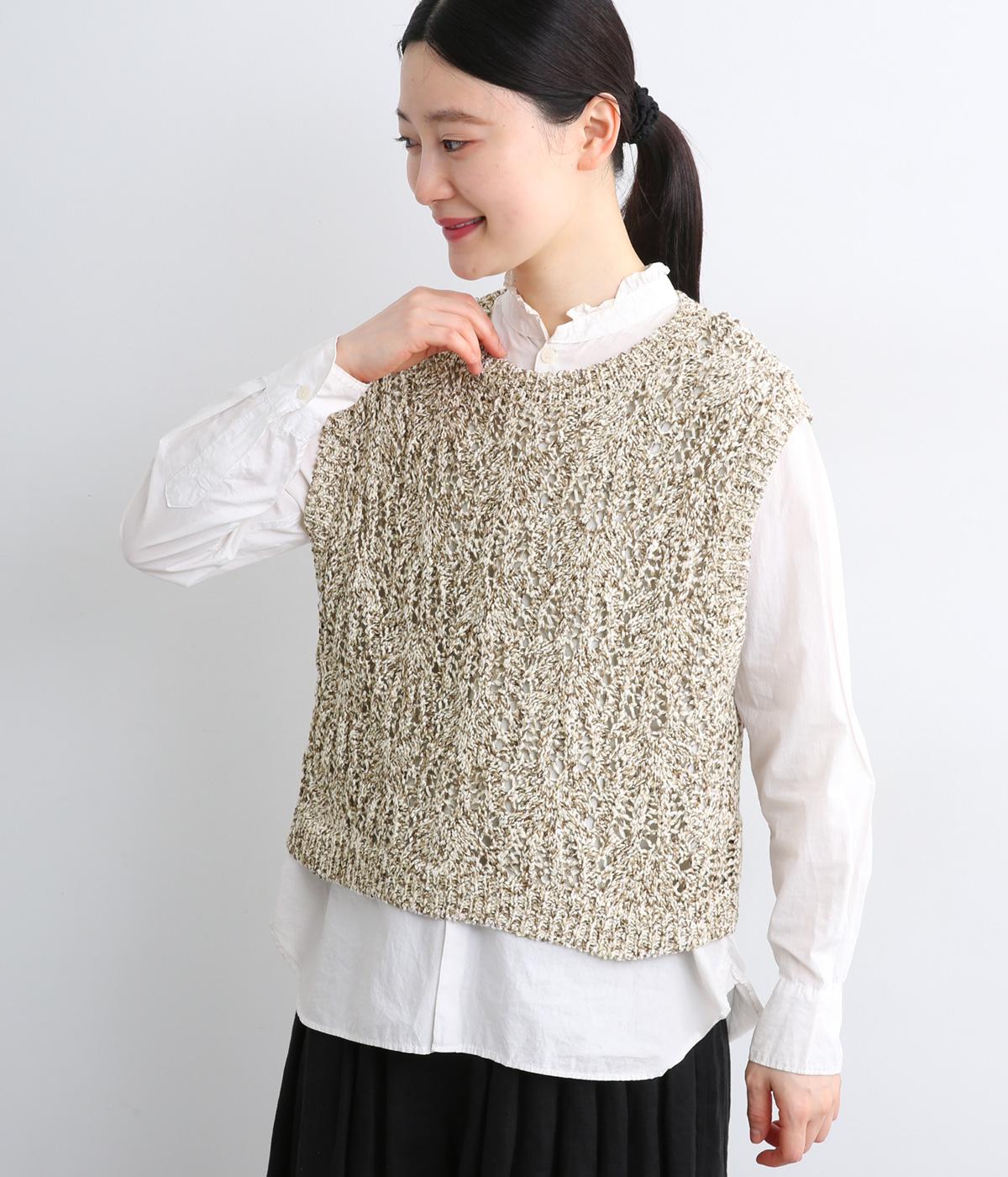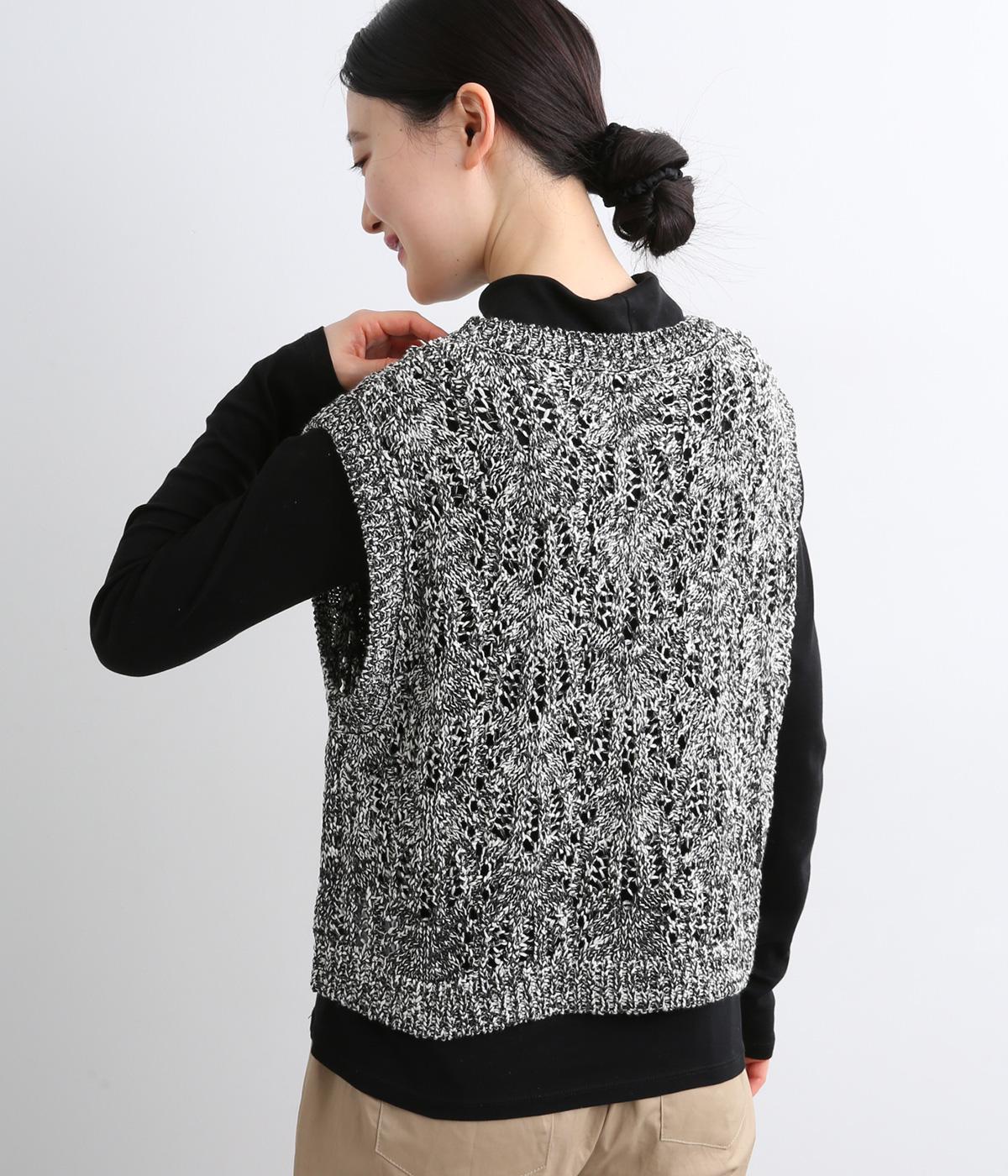 スタンダードなスクエア型で着合わせしやすく仕立てたニットベスト。透け編み柄やショート丈によって軽い印象を運び、季節問わずレイヤードしやすくなっています。裾からインナートップスをのぞかせるのがお洒落ポイントです。