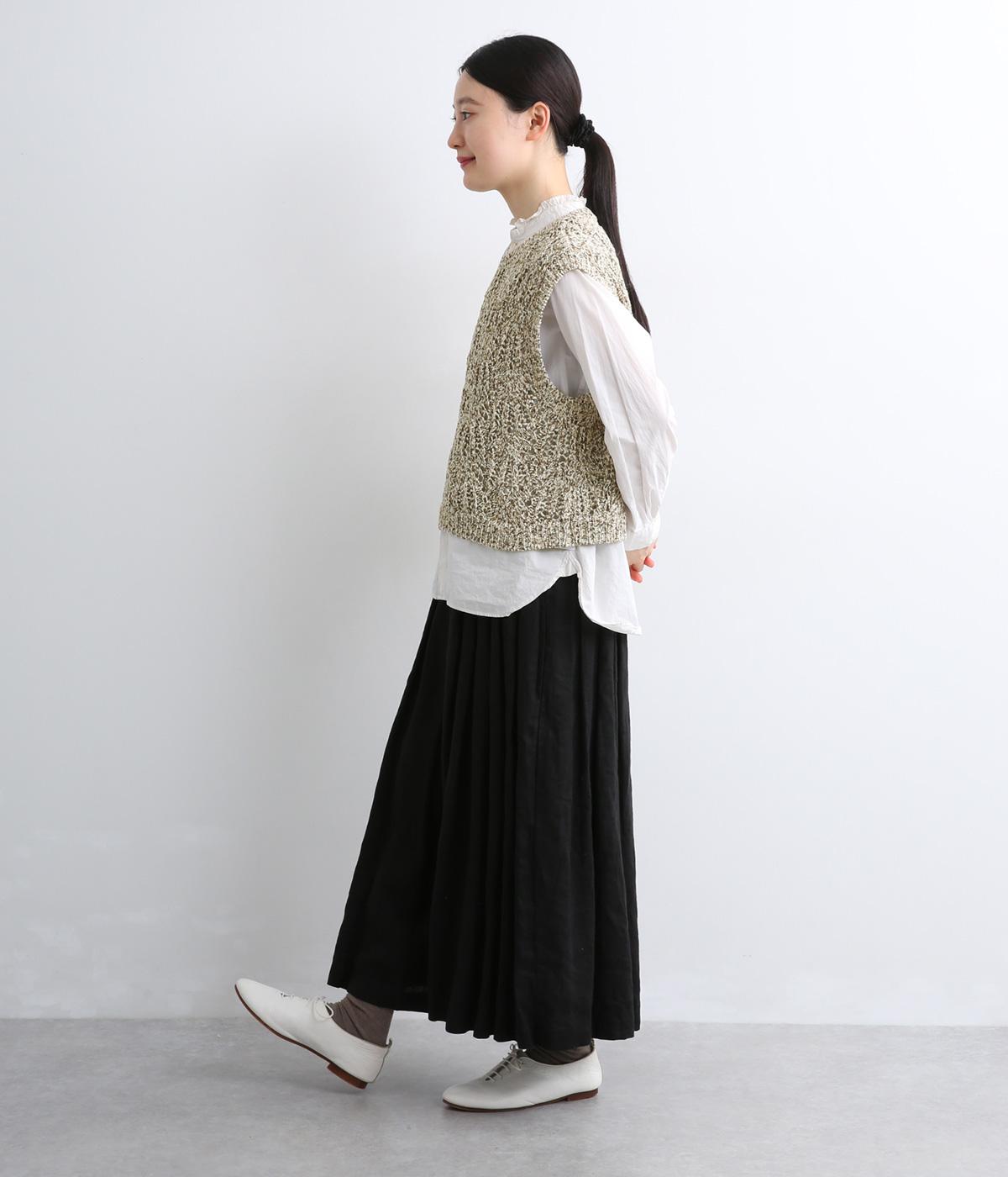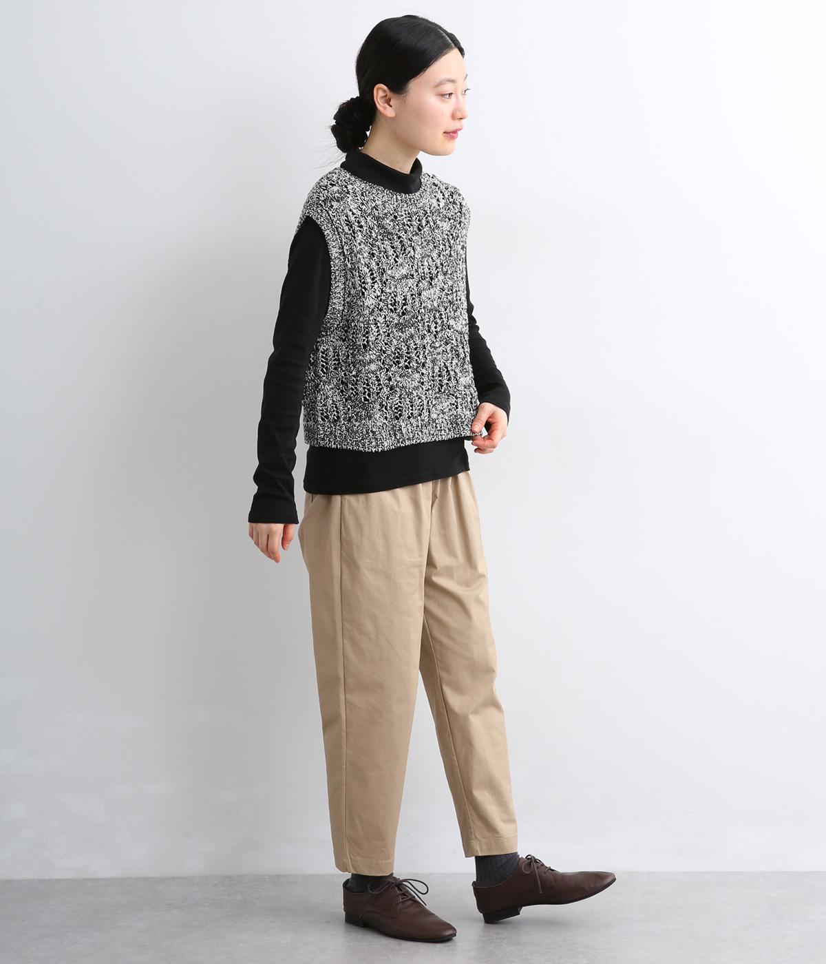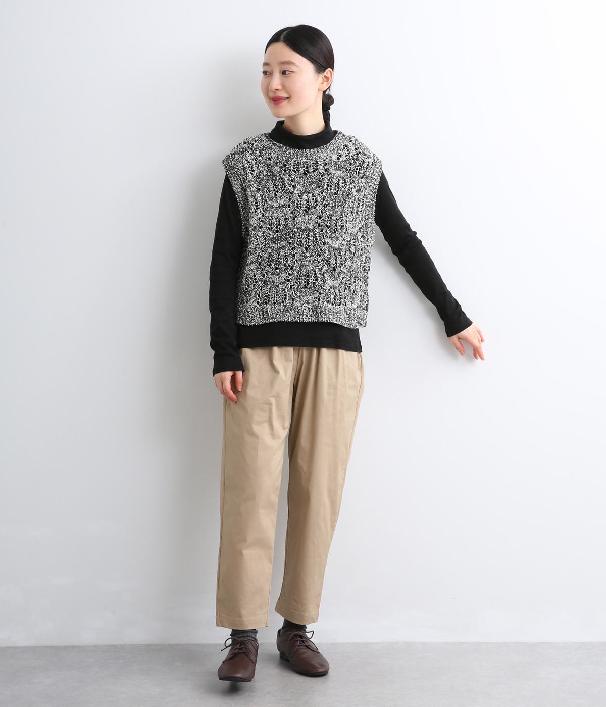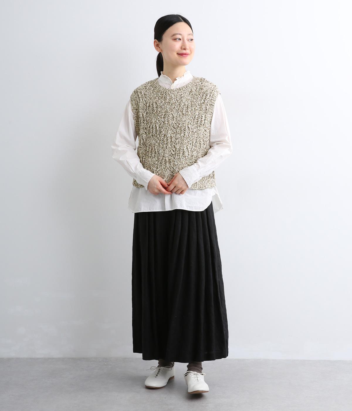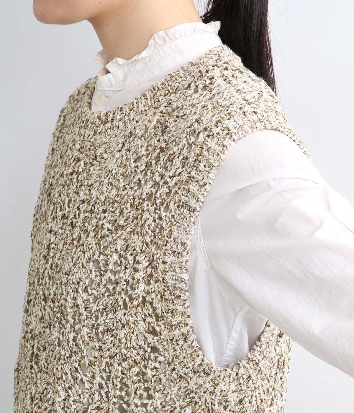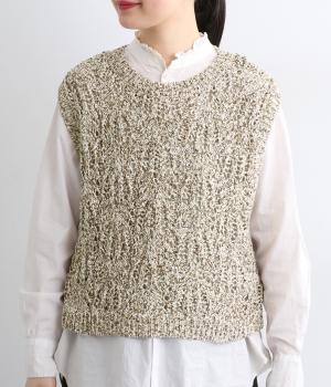 スタンダードなスクエア型で着合わせしやすく仕立てたニットベスト。透け編み柄やショート丈によって軽い印象を運び、季節問わずレイヤードしやすくなっています。裾からインナートップスをのぞかせるのがお洒落ポイントです。