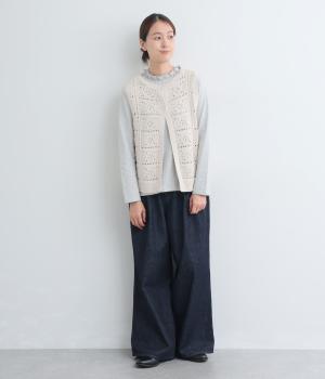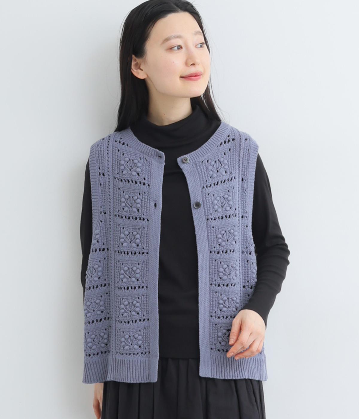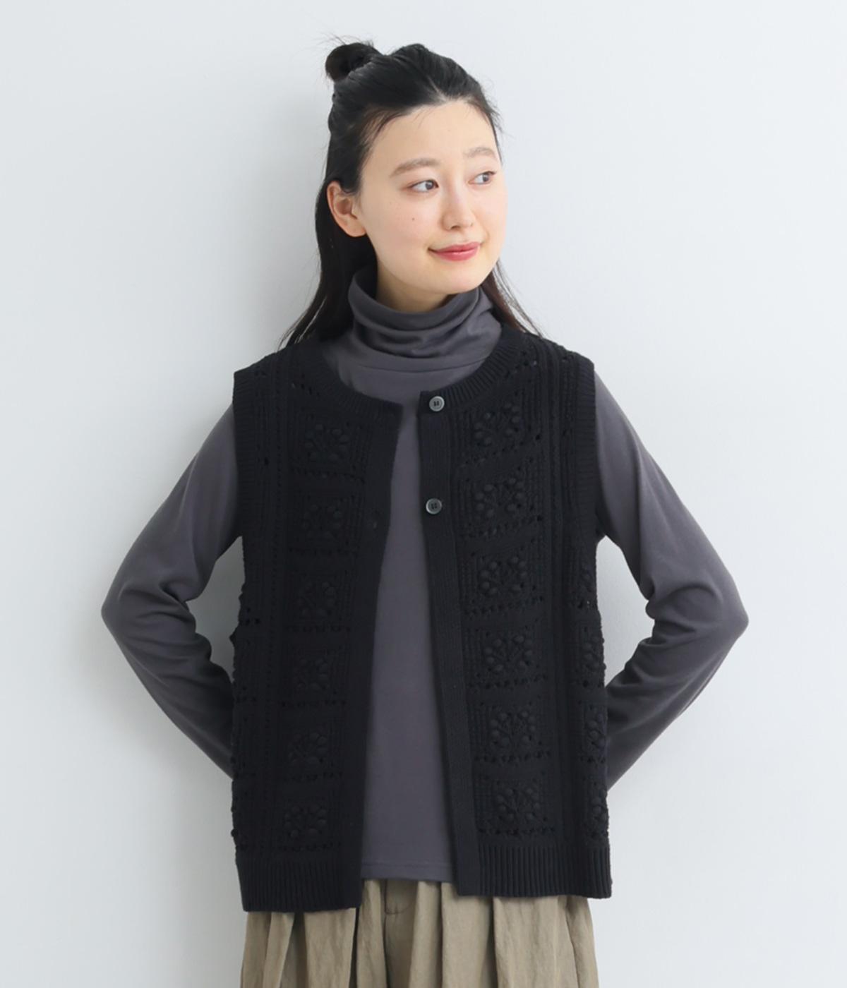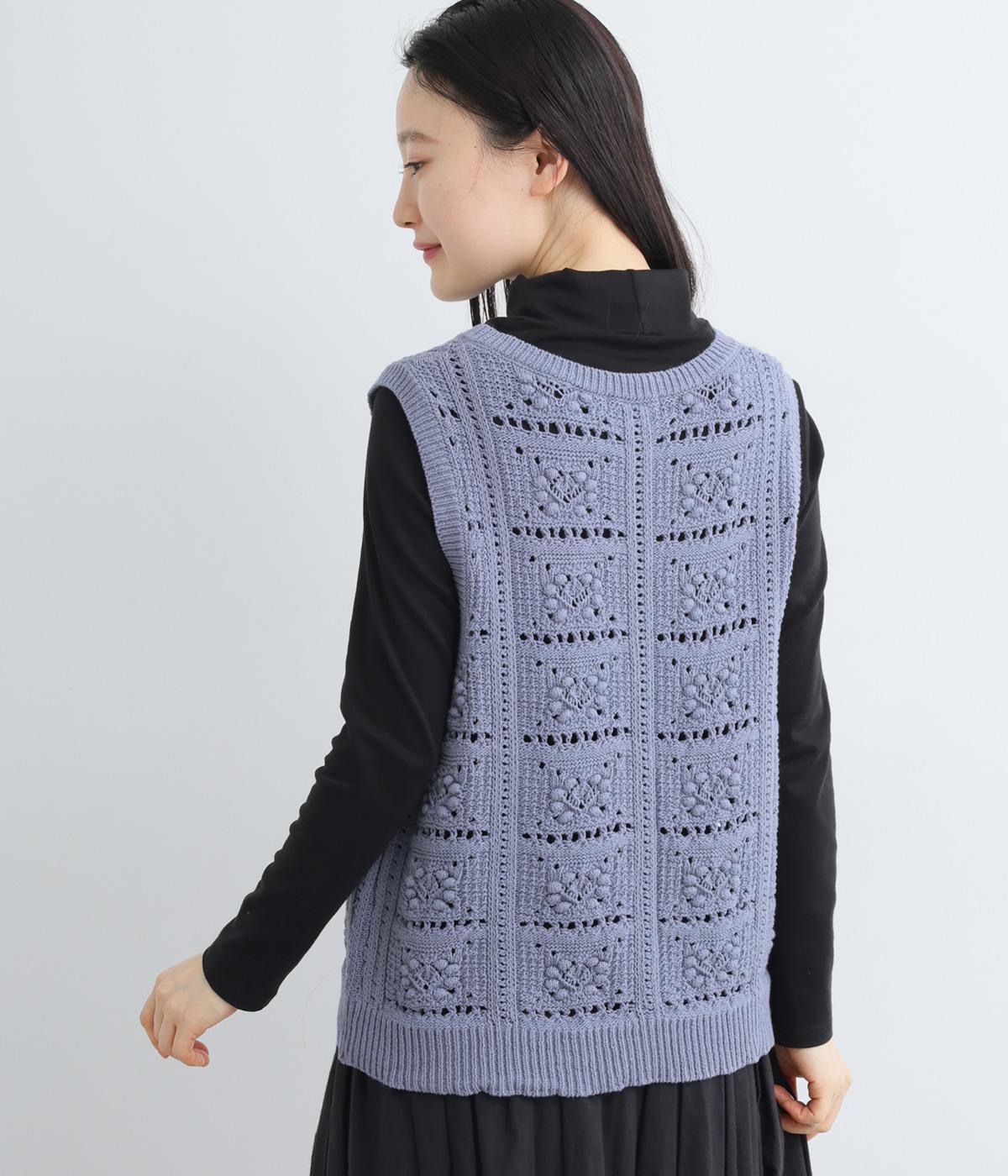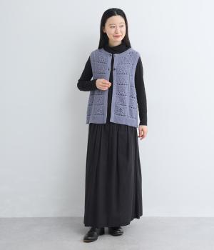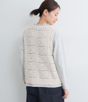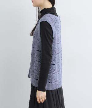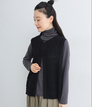 いつものスタイリングにプラスするだけでカントリー調のほっこりとしたやさしい雰囲気が生まれるニットベスト。フラワーモチーフの透かし編みでデザイン性と抜け感のバランスが良く、合わせるトップスの良さも惹き立てます。