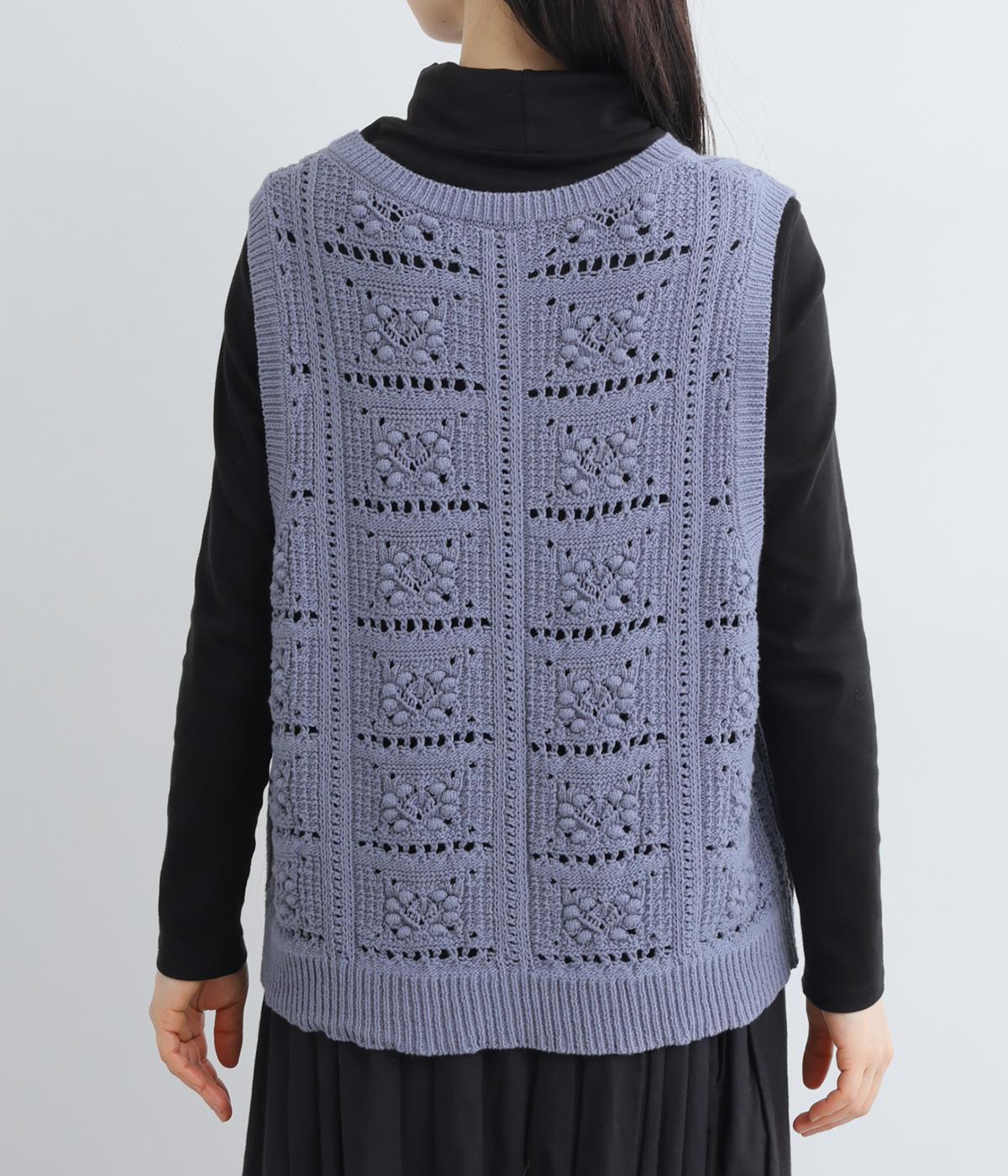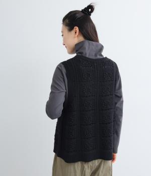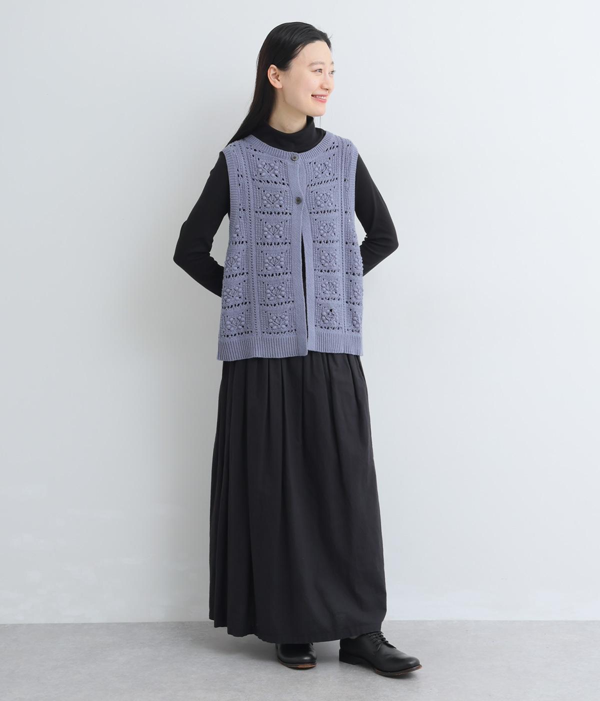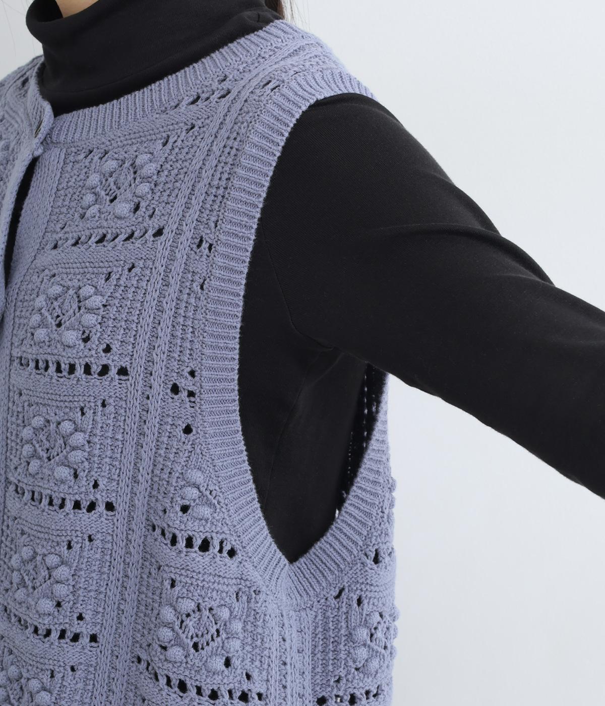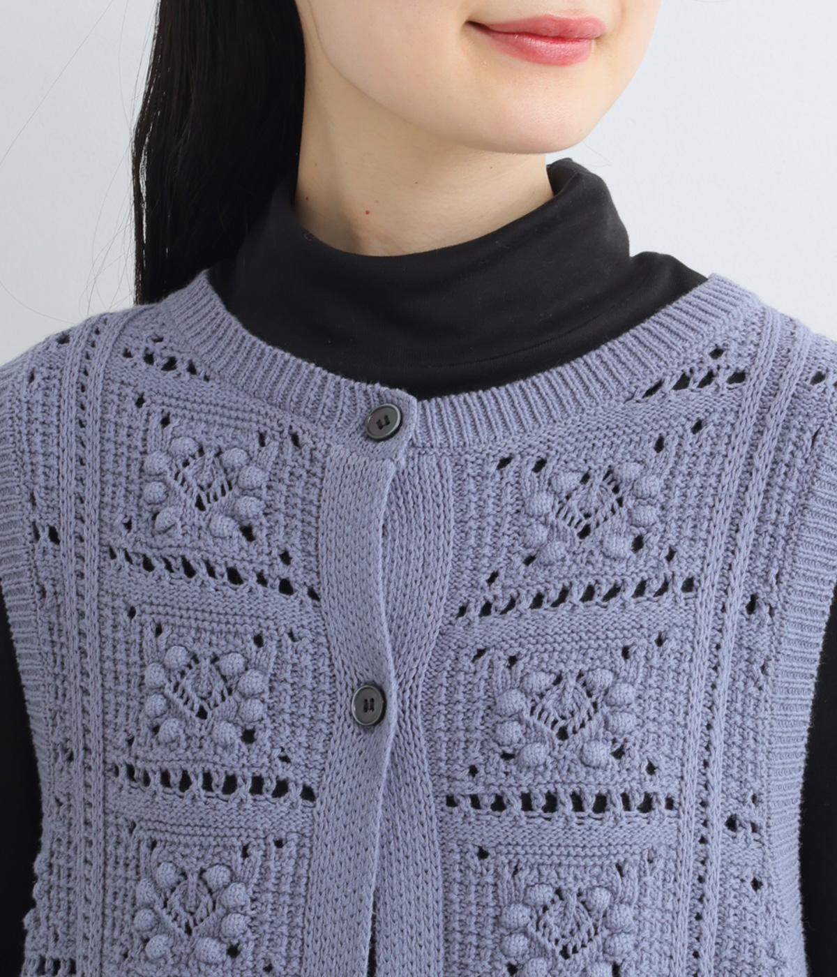 いつものスタイリングにプラスするだけでカントリー調のほっこりとしたやさしい雰囲気が生まれるニットベスト。フラワーモチーフの透かし編みでデザイン性と抜け感のバランスが良く、合わせるトップスの良さも惹き立てます。
