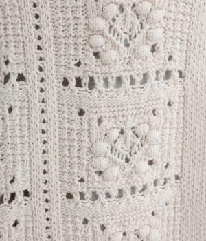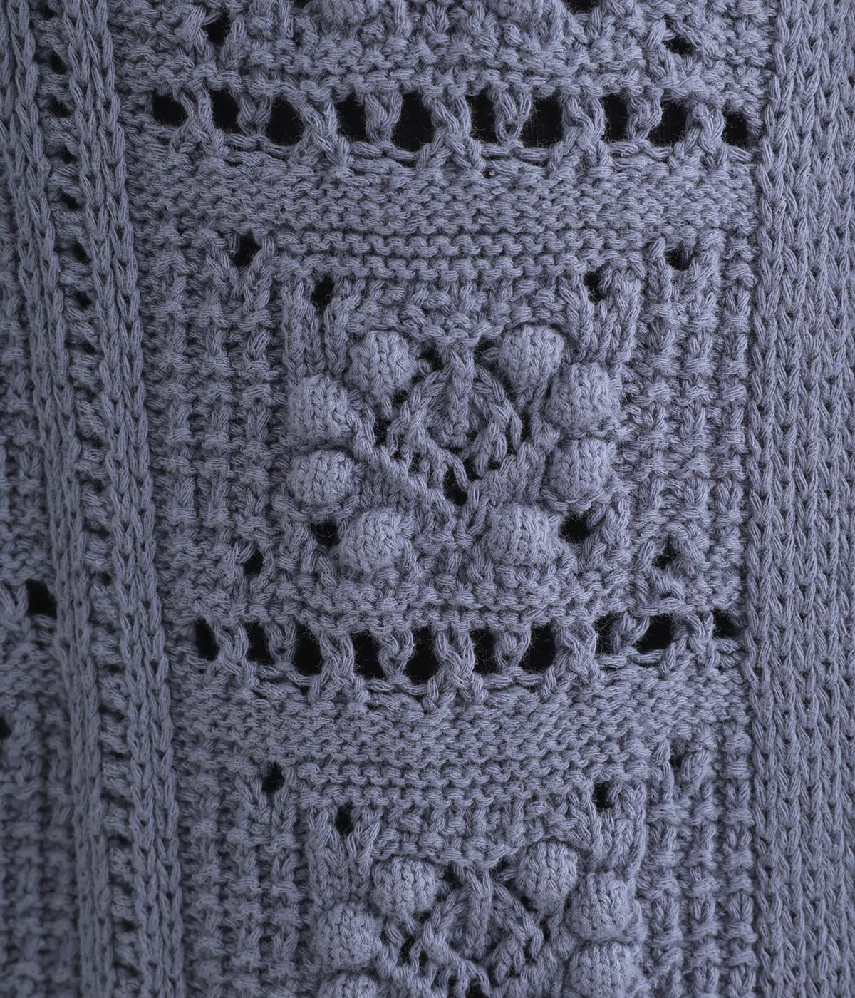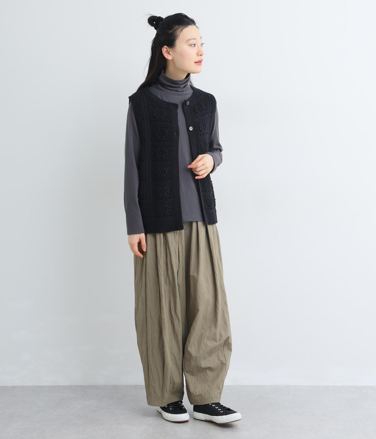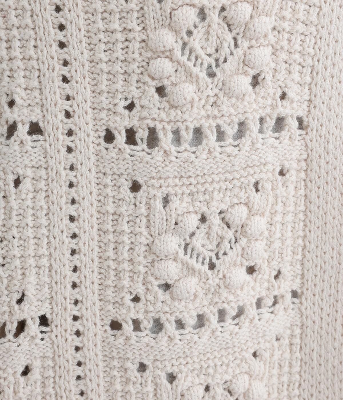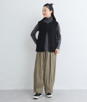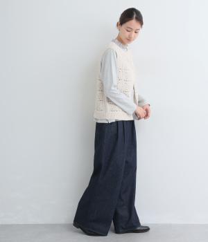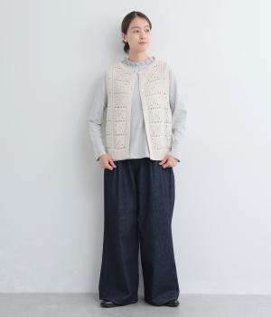 いつものスタイリングにプラスするだけでカントリー調のほっこりとしたやさしい雰囲気が生まれるニットベスト。フラワーモチーフの透かし編みでデザイン性と抜け感のバランスが良く、合わせるトップスの良さも惹き立てます。
