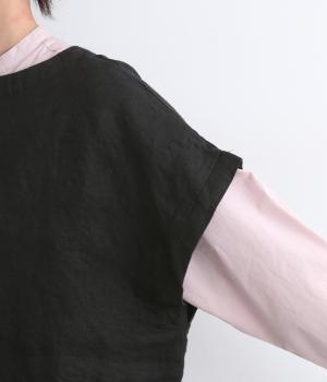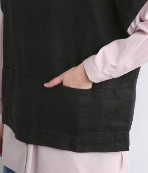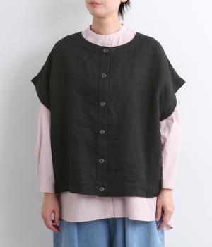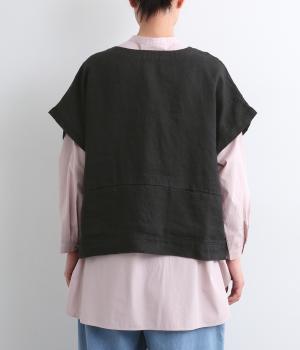 ボタンあきを前後どちらでもたのしめる2way仕様のベスト。肩を落としたゆったりめのボックスシルエットで気負いのないレイヤードスタイルが叶います。陰影のあるボタンがアイキャッチになり、スリットポケットつきで使い勝手も◎。