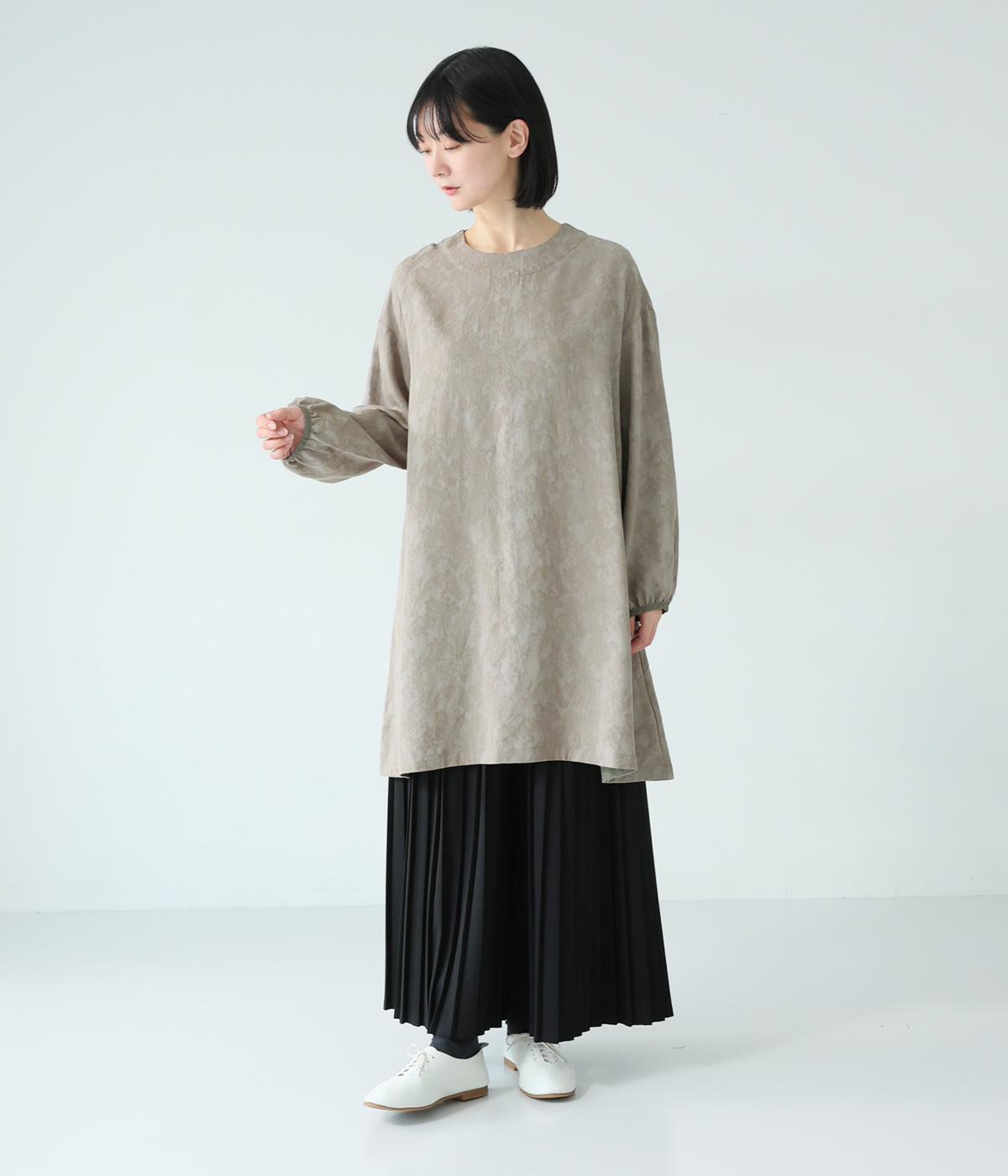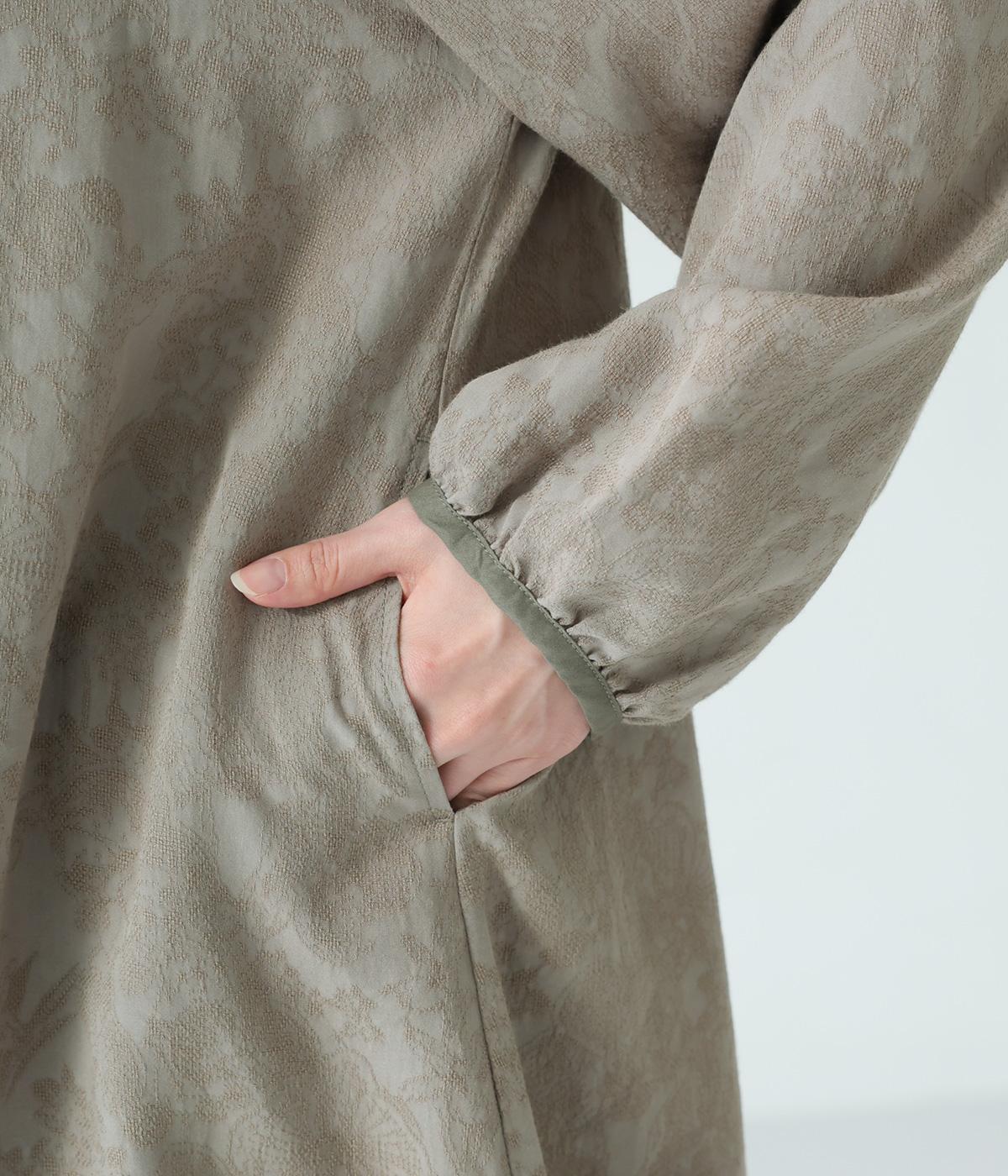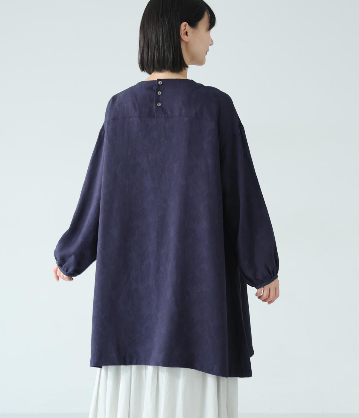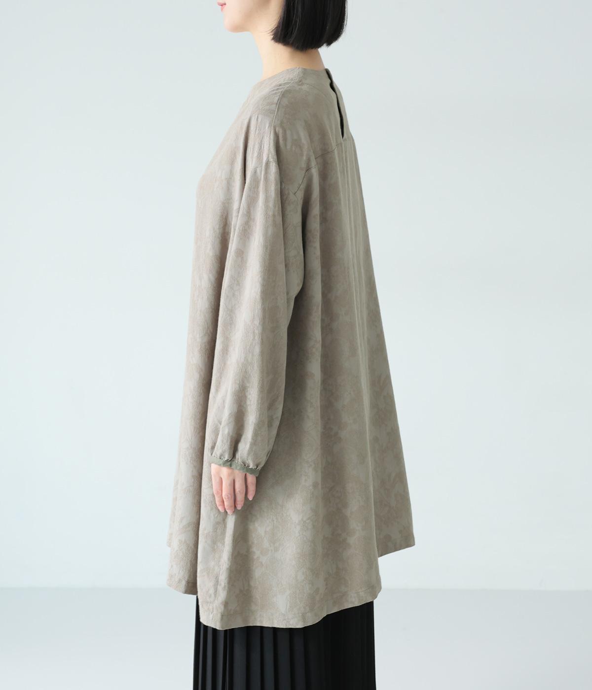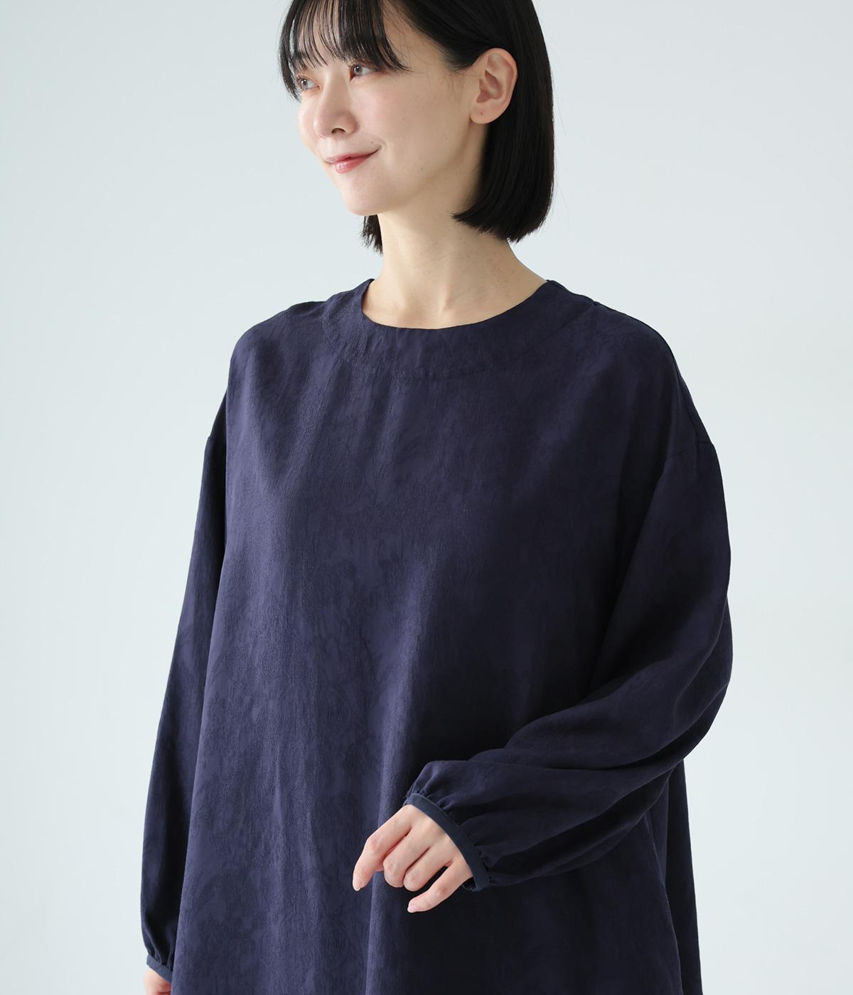 シンプルな型が、表情豊かな生地を引き立てます。たっぷりの生地がつくるドレープが優雅な雰囲気を後押しし、パイピングで仕立てた袖口がカジュアルなアクセントに。幅広いスタイリングになじむ一枚です。