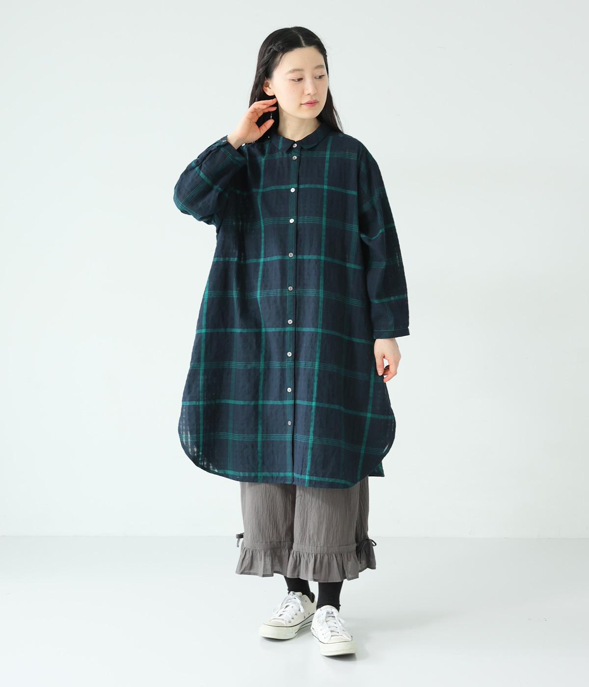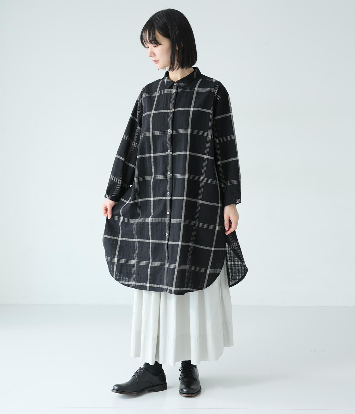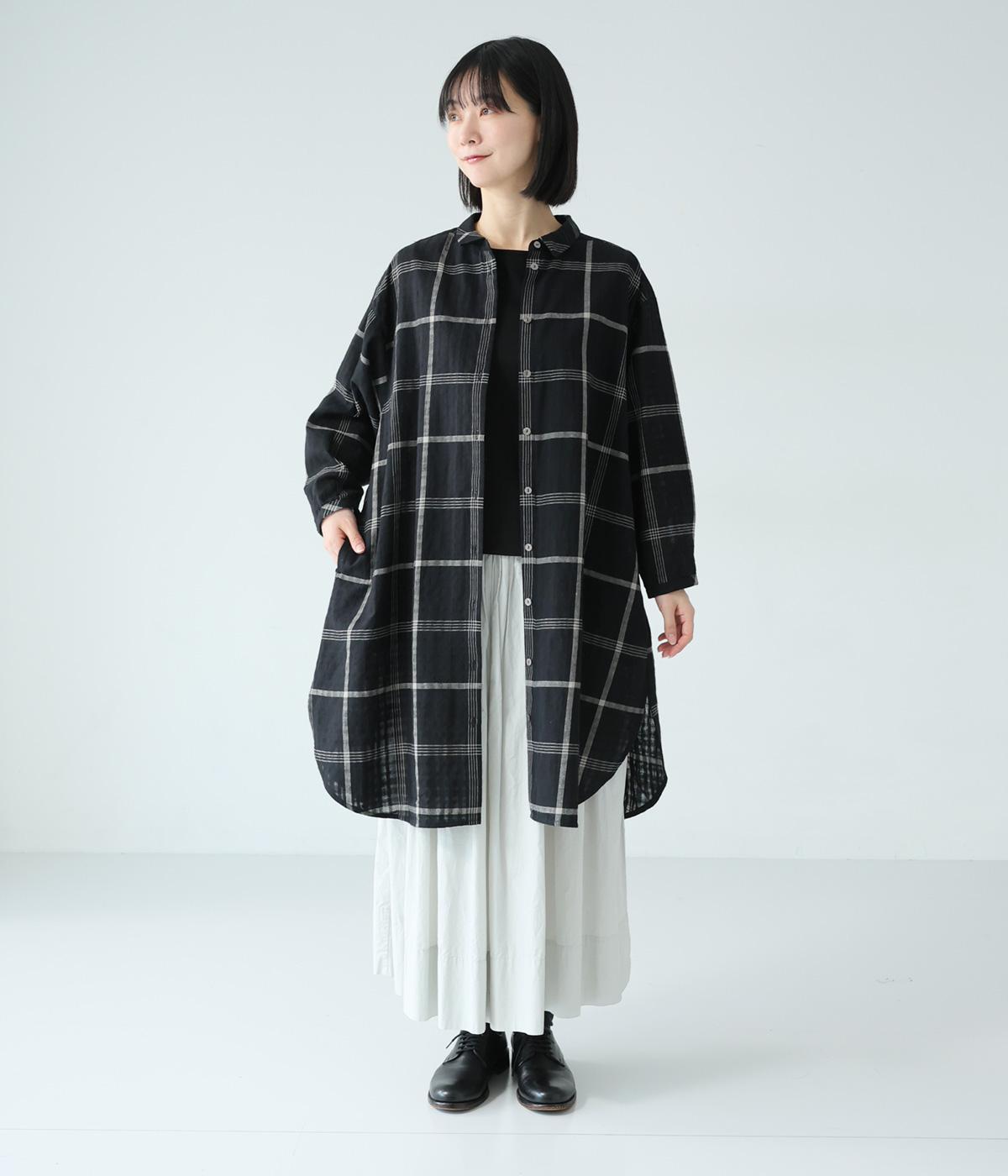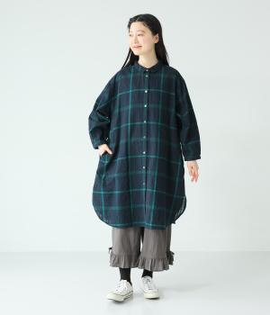 カジュアルな印象のチェック柄を、ふくらみのあるシルエットやカーブを描く裾のラインが女性らしい雰囲気に引き寄せます。前開きで、さっと羽織るスタイリングもおすすめ。さまざまな着回しが楽しめるアイテムです。