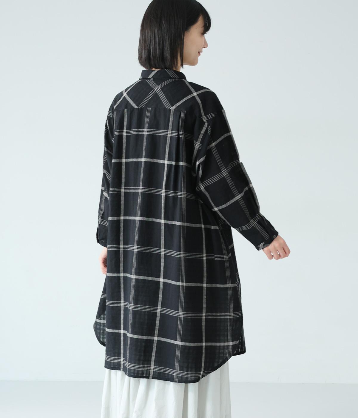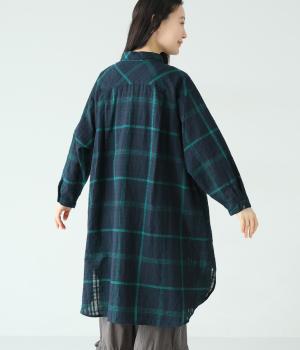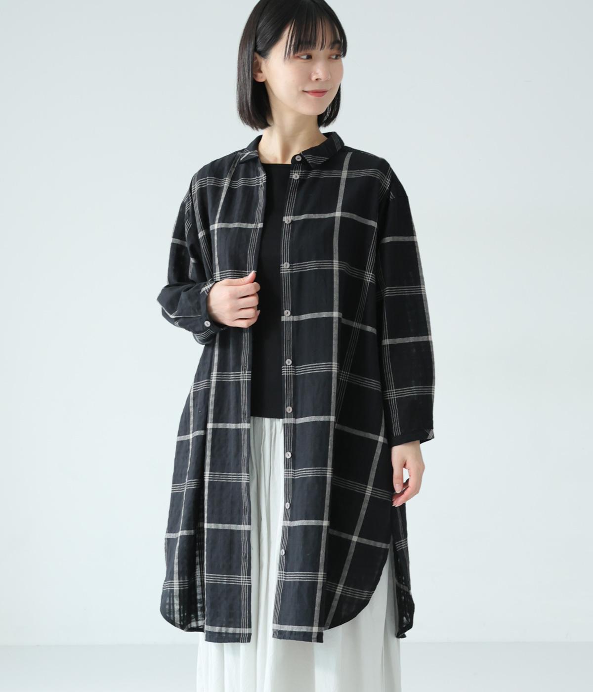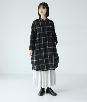 カジュアルな印象のチェック柄を、ふくらみのあるシルエットやカーブを描く裾のラインが女性らしい雰囲気に引き寄せます。前開きで、さっと羽織るスタイリングもおすすめ。さまざまな着回しが楽しめるアイテムです。