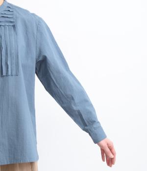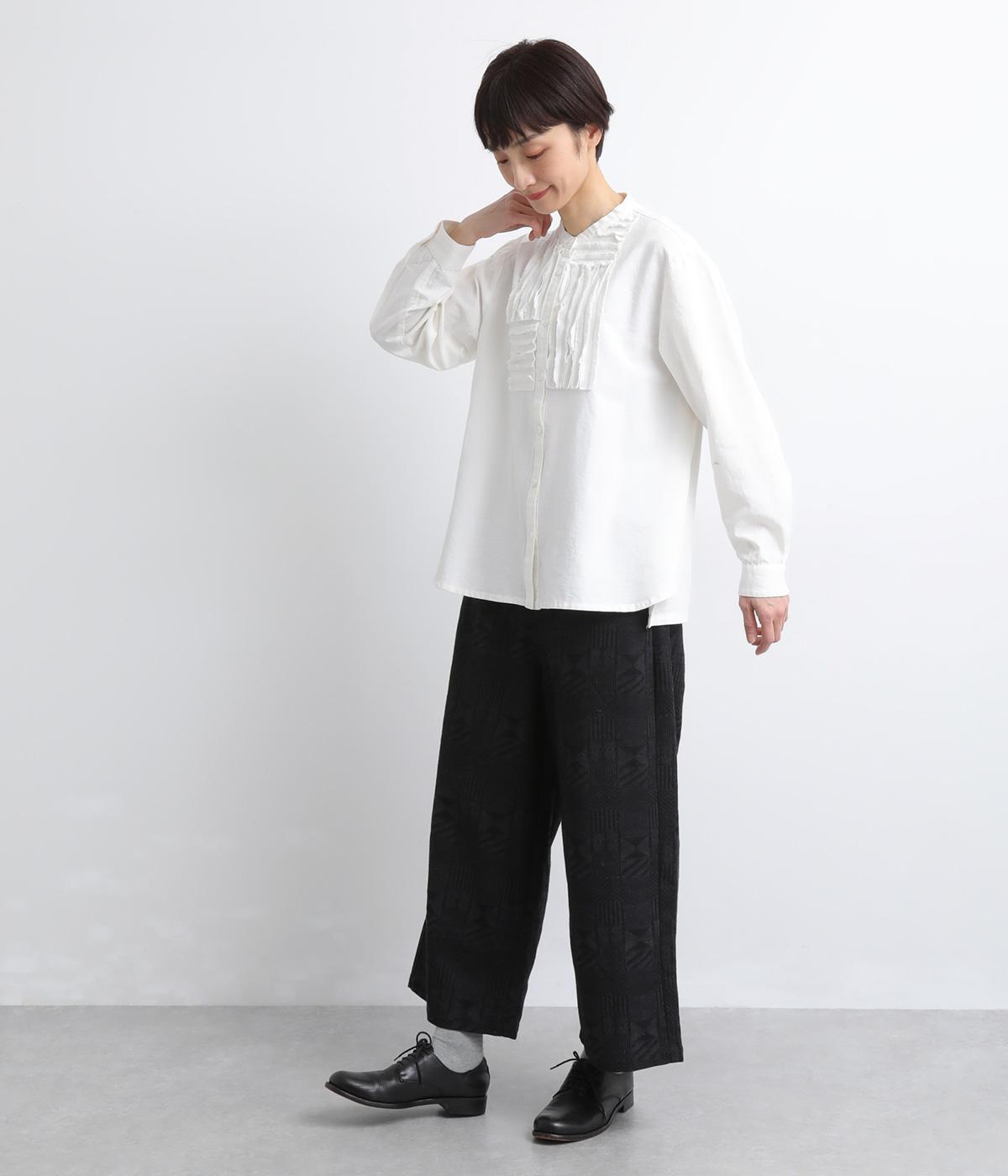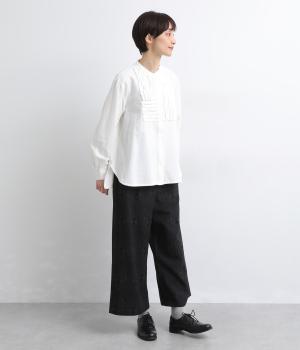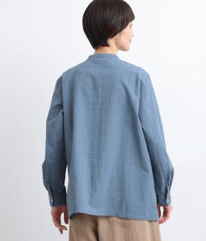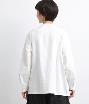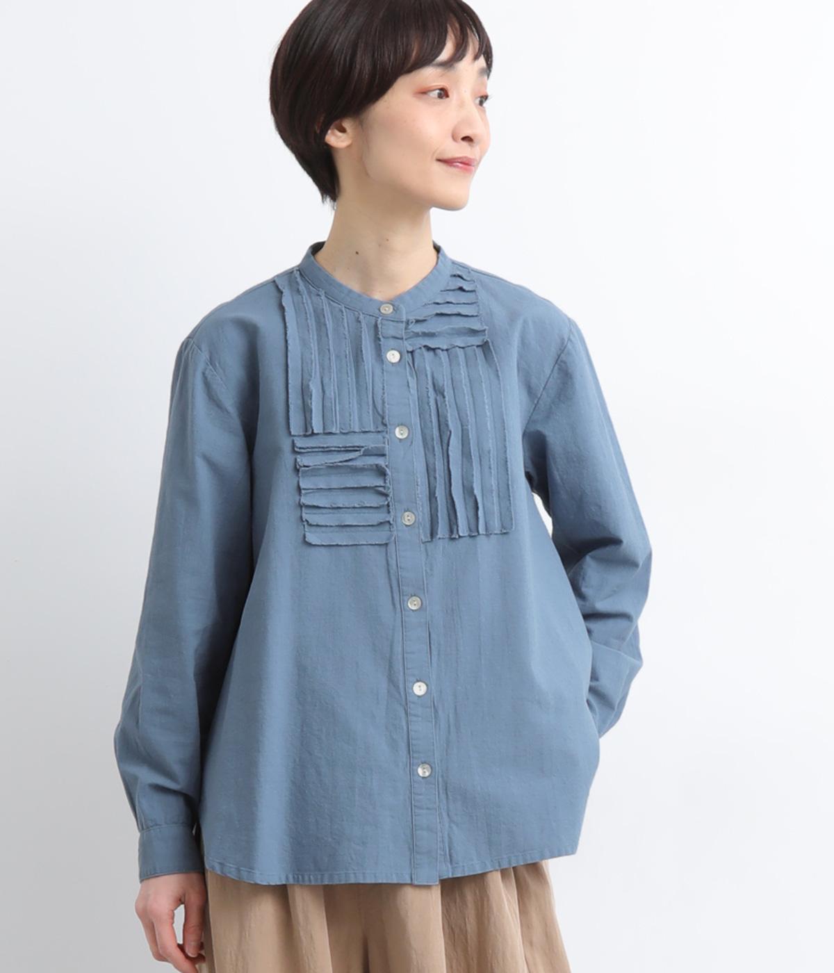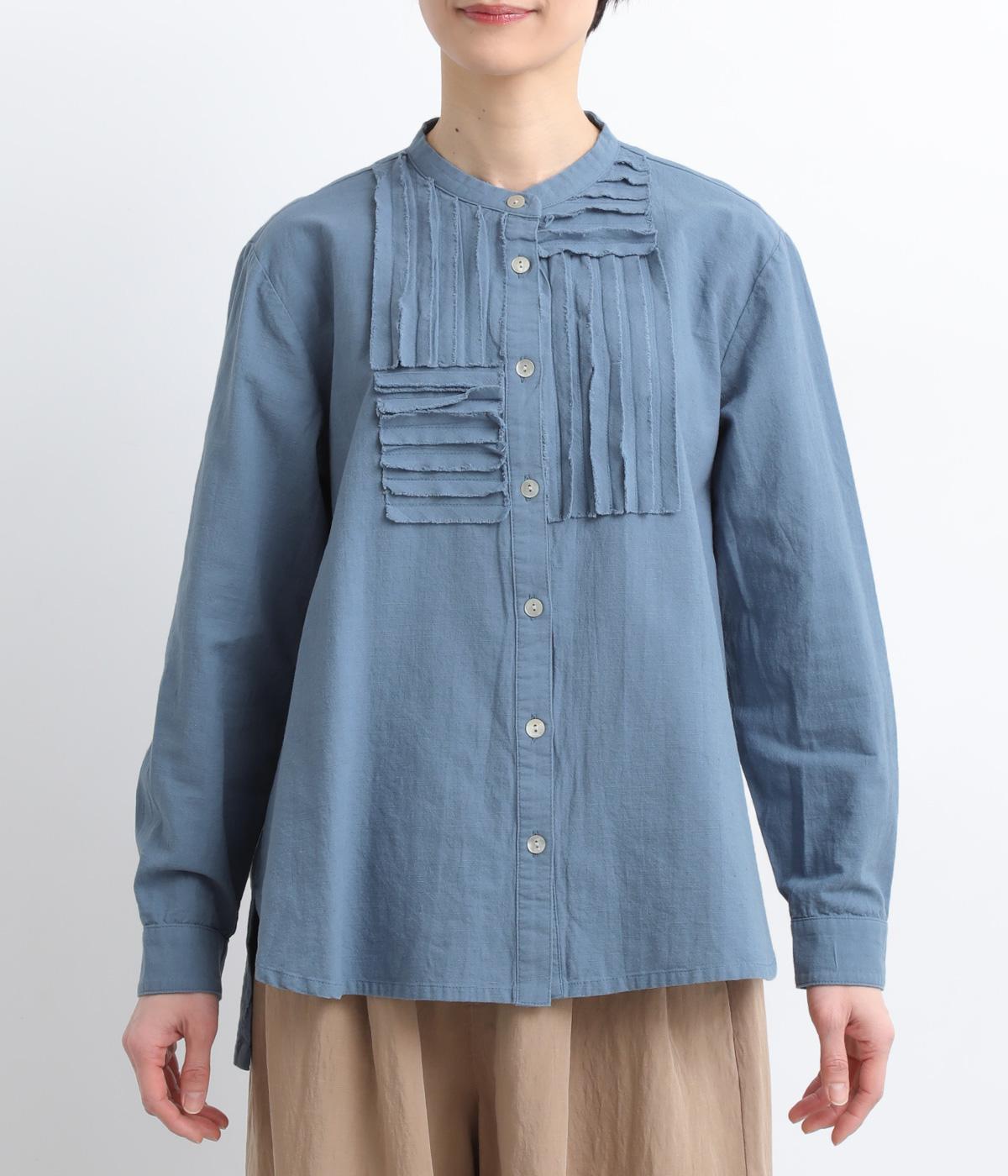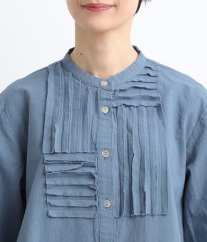 縦と横に走らせたカットエンドのパッチワークを胸元にあしらい、さりげない立体感と表情を添えました。端正なバンドカラーとシンプルなシルエットが、全体をすっきりまとめ、装いに上品な落ち着きをプラス。前後差をつけた長めの裾は、腰まわりを自然にカバーしつつ軽やかなバランスをつくります。
