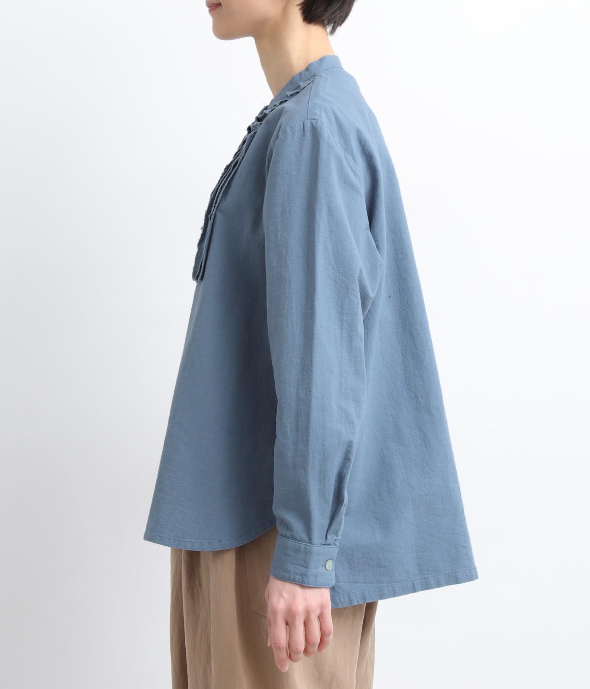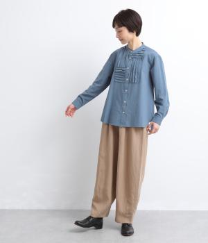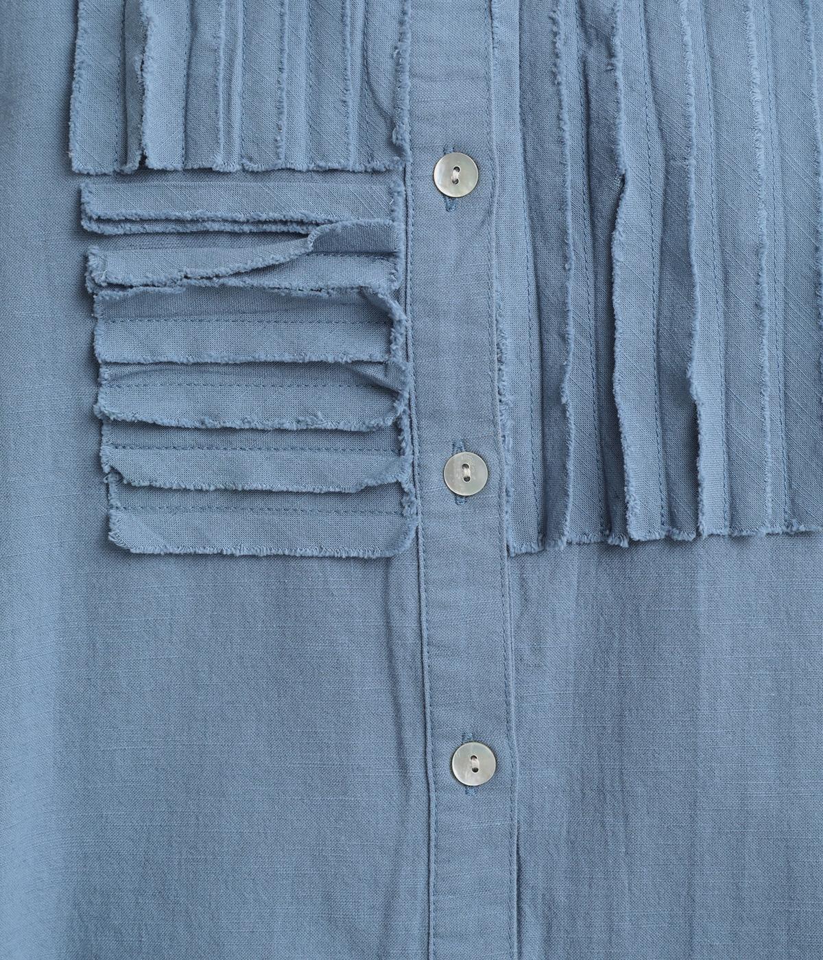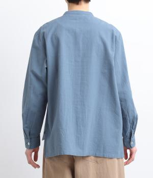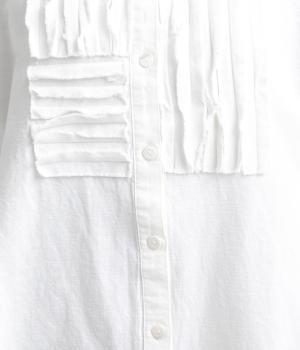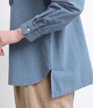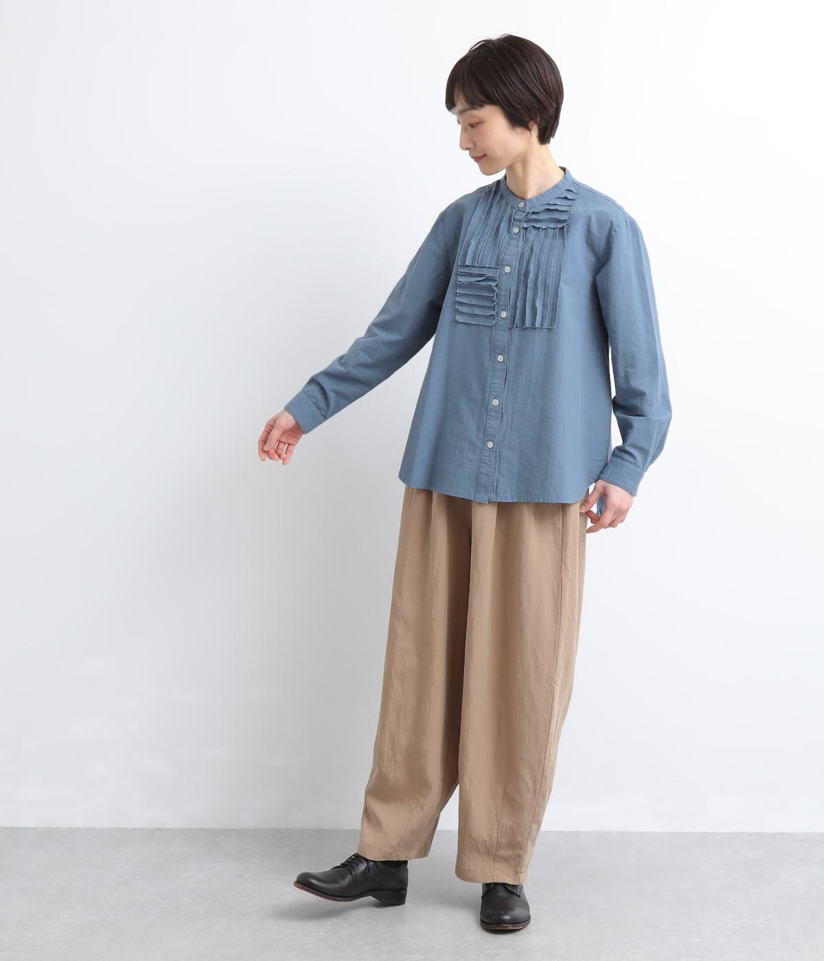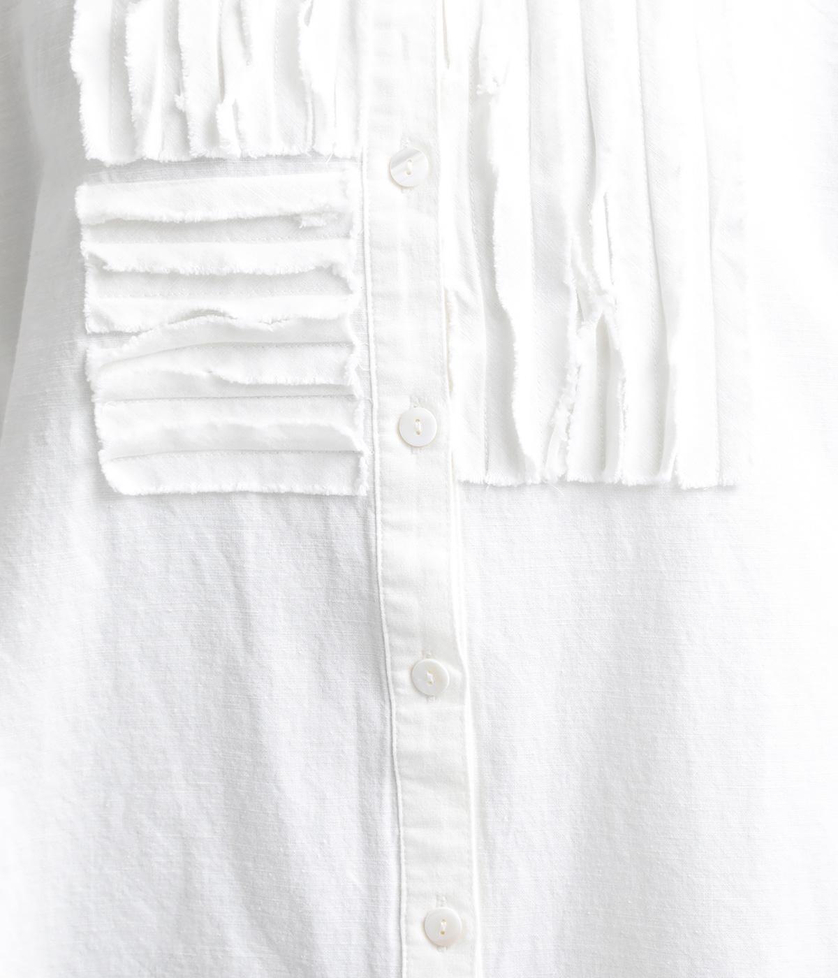 縦と横に走らせたカットエンドのパッチワークを胸元にあしらい、さりげない立体感と表情を添えました。端正なバンドカラーとシンプルなシルエットが、全体をすっきりまとめ、装いに上品な落ち着きをプラス。前後差をつけた長めの裾は、腰まわりを自然にカバーしつつ軽やかなバランスをつくります。
