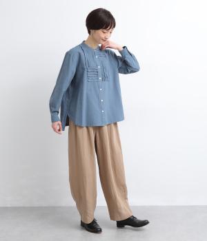 コットンとリネンを織り合わせた生地は、さらりとした肌ざわりとナチュラルな風合いが魅力です。ほどよいハリがありながら、やわらかさも感じられ、時間とともにしなやかになじんでいきます。