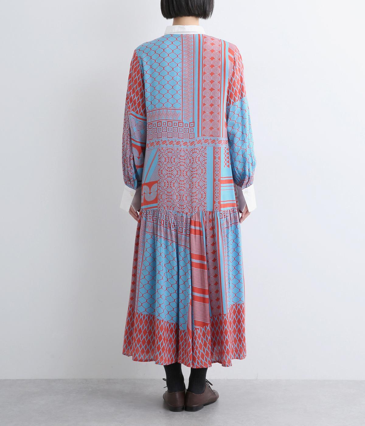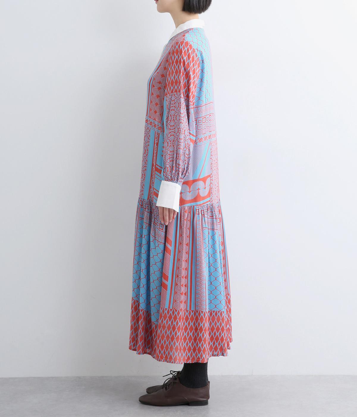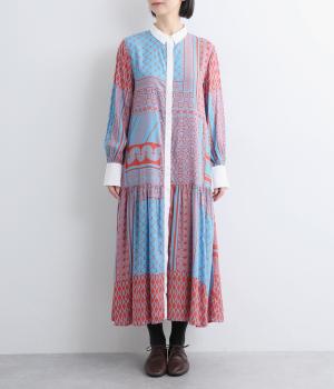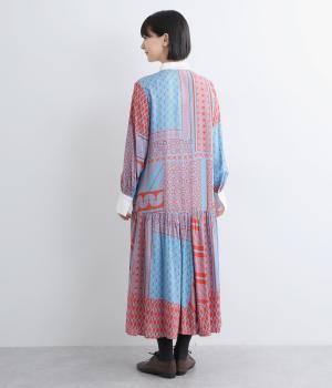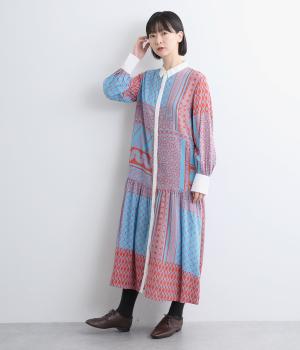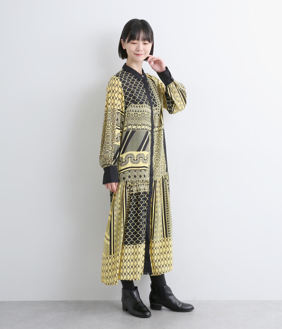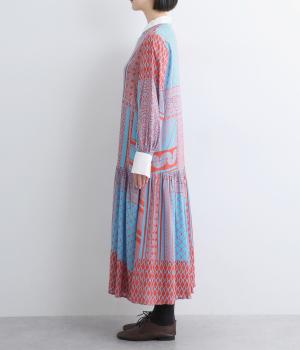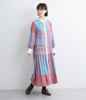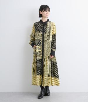 陶器を模したレトロな雰囲気を感じさせるオリジナリティあふれるデザインがポイントのワンピース。切り替えを入れて、裾広がりのきれいなシルエットに仕上げました。両サイドにはポケットがあるので、機能性も抜群です。