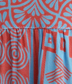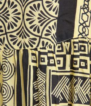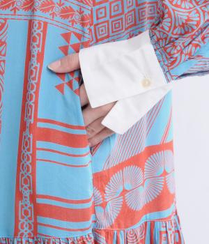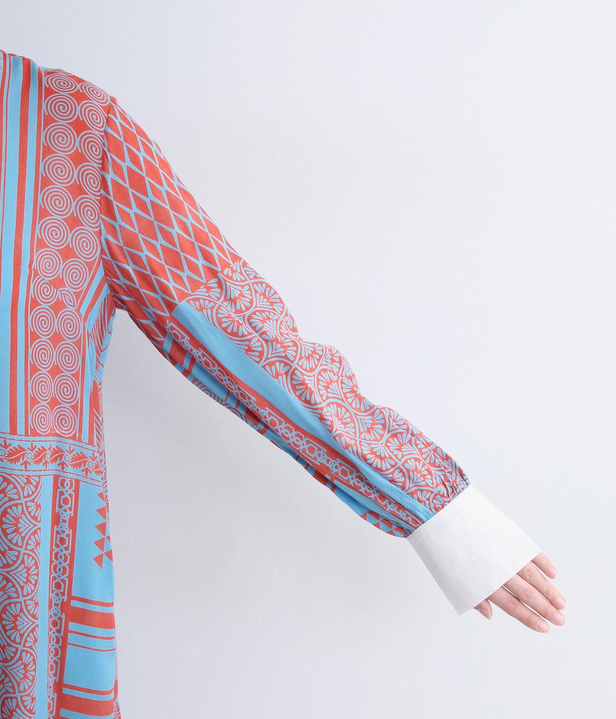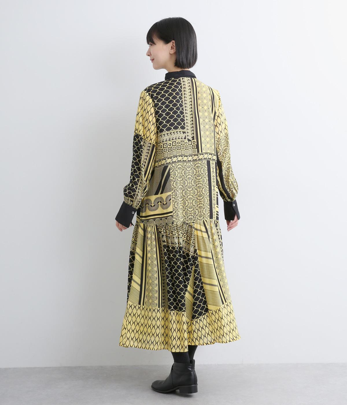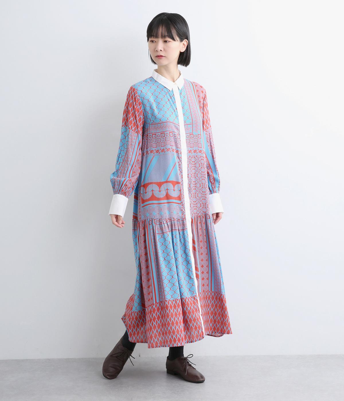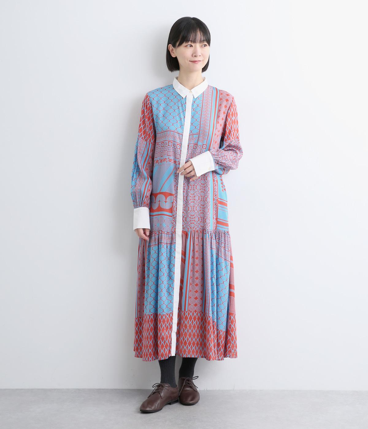 陶器を模したレトロな雰囲気を感じさせるオリジナリティあふれるデザインがポイントのワンピース。切り替えを入れて、裾広がりのきれいなシルエットに仕上げました。両サイドにはポケットがあるので、機能性も抜群です。