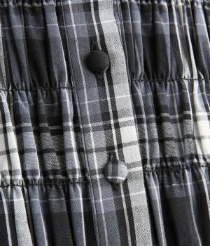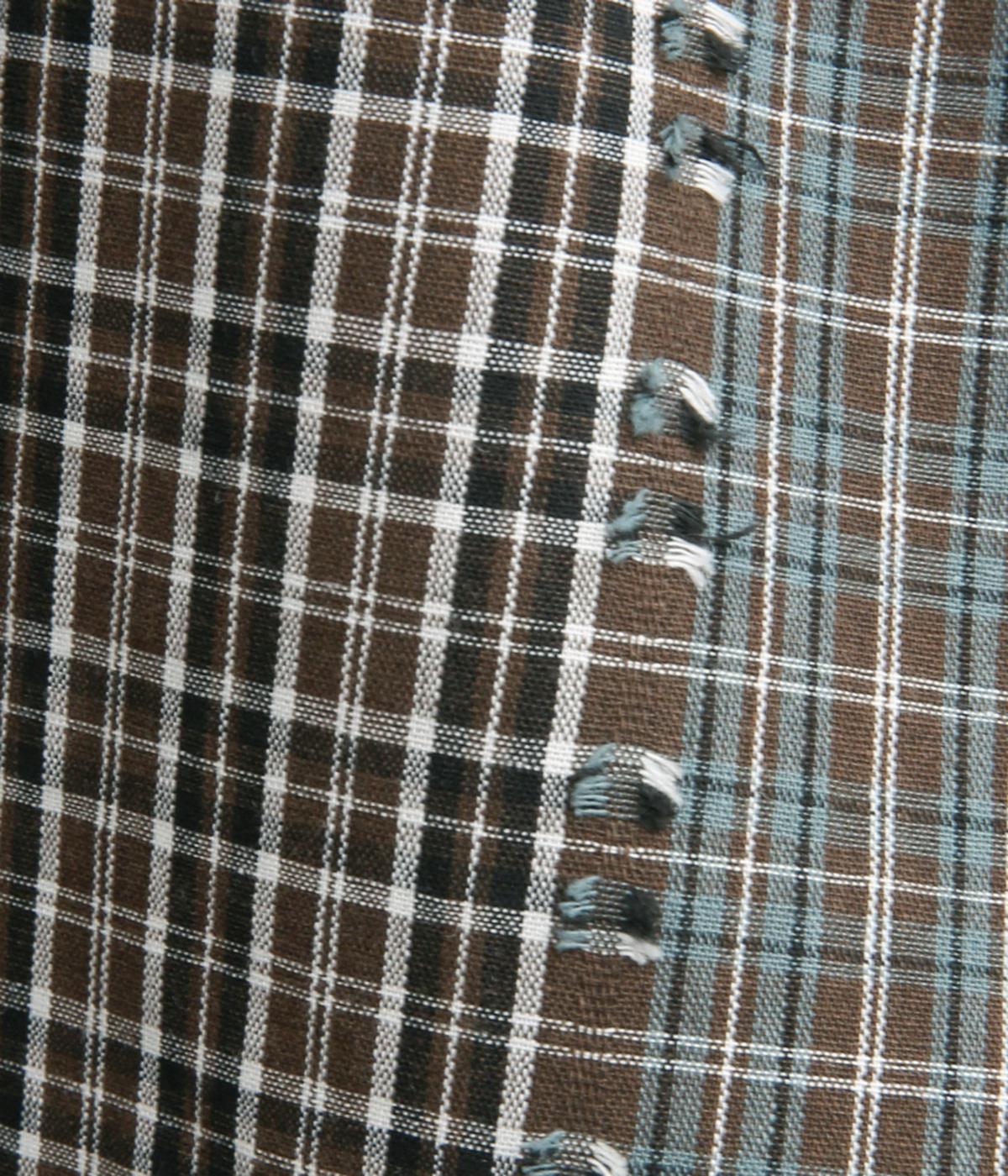 ブラックベースのタータンチェックはしなやかさも感じられるセルロース入りの混紡生地を。2種のチェック柄を組み合わせたブラウンカラーはさらりとして適度にふくらみのあるコットンを使用。