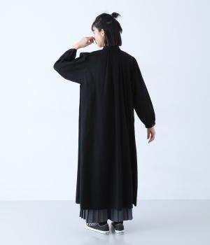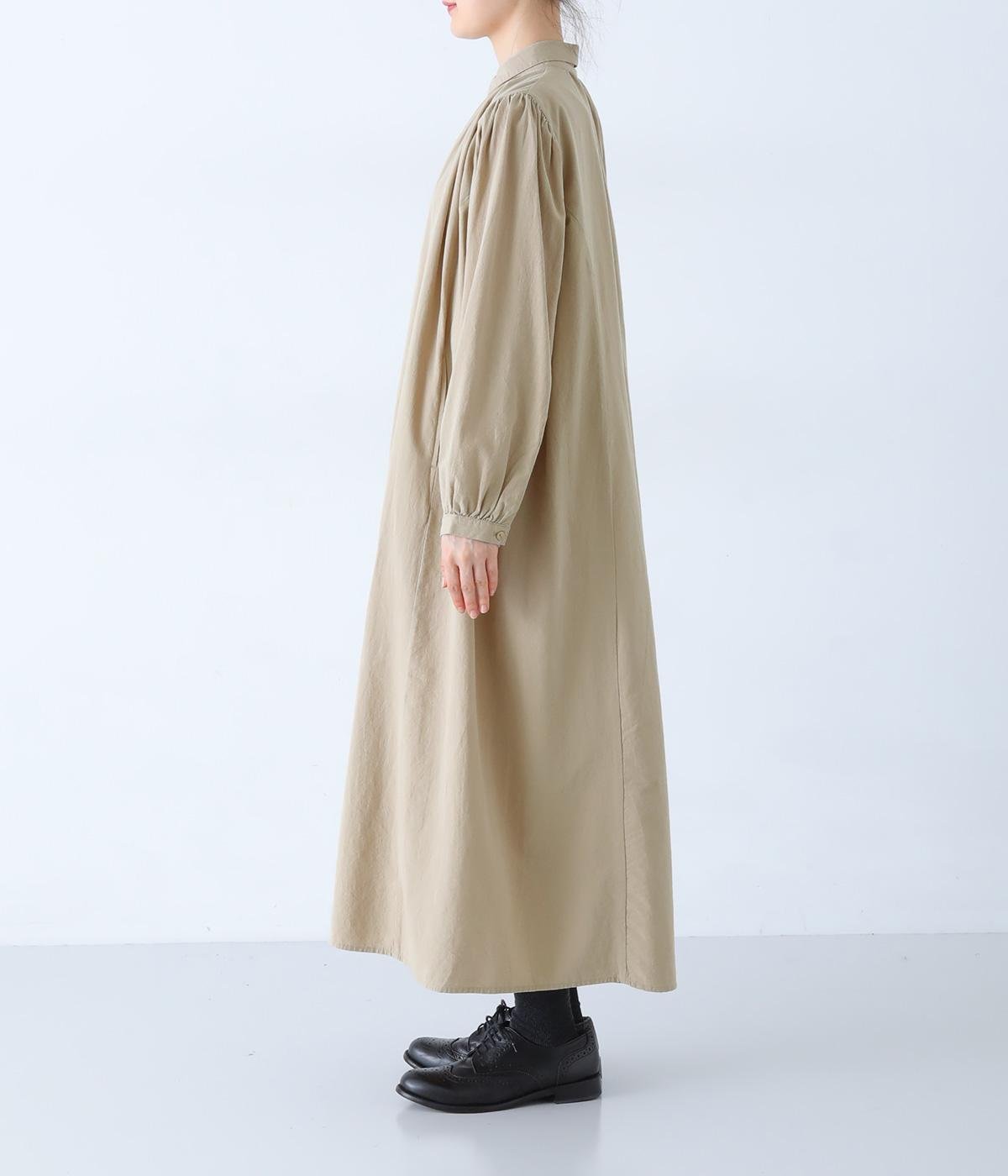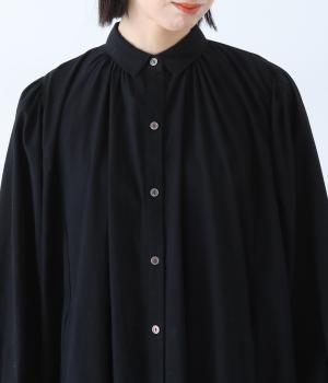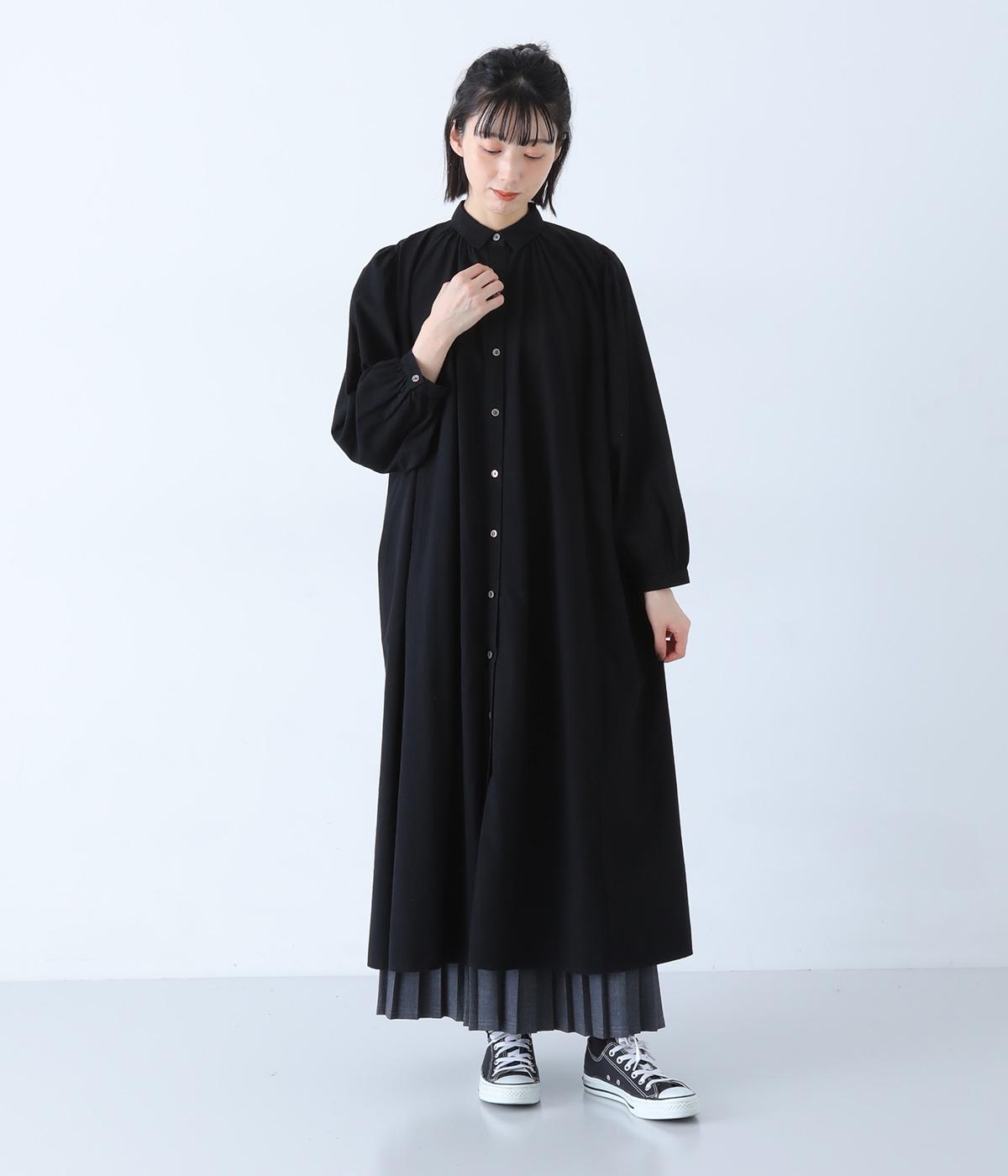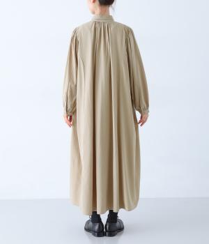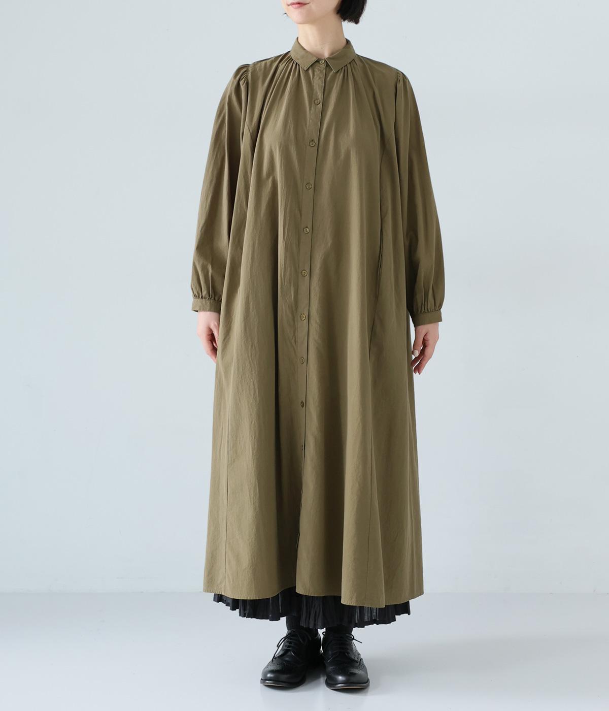 ネックまわりと肩、袖口に繊細なギャザーをあしらったシャツワンピース。流れるようなドレープが縦ラインを強調し、ゆとりのあるシルエットをすっきりと見せてくれます。首元に沿う小さな襟も愛らしいポイントです。