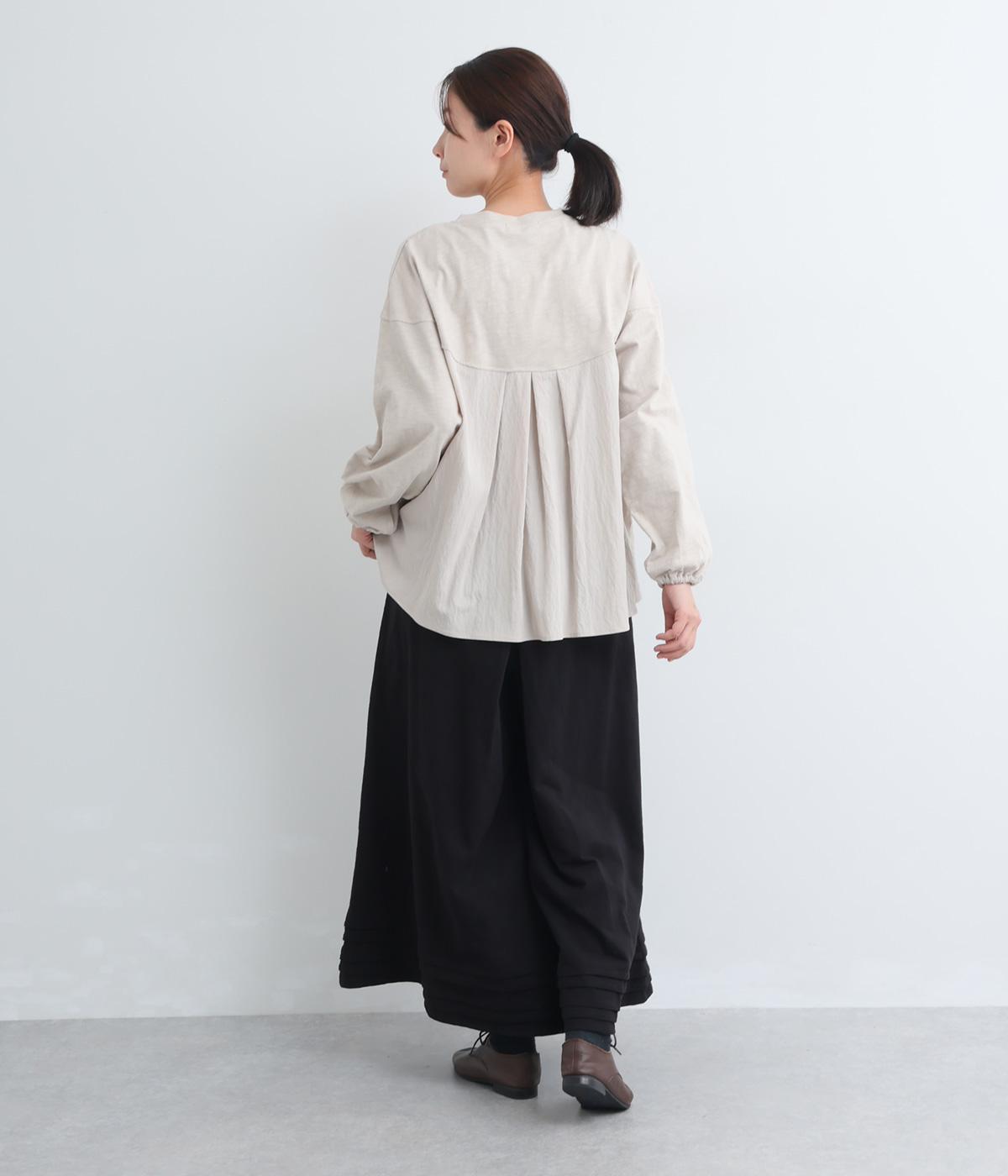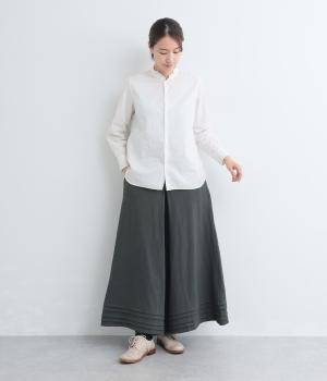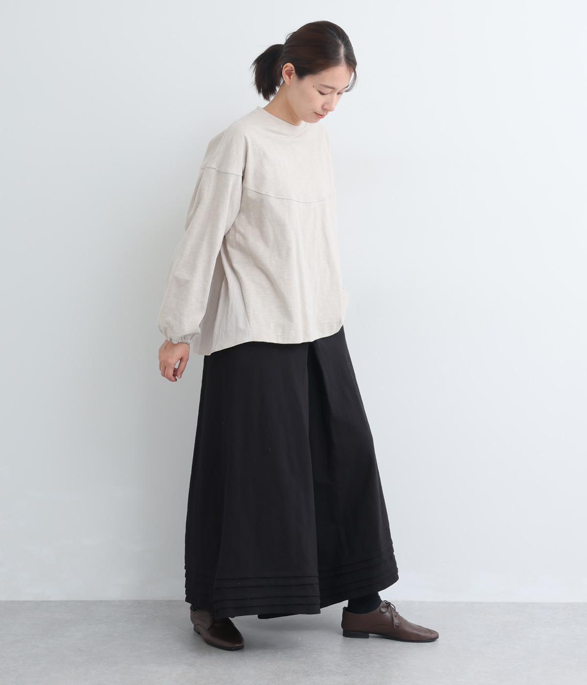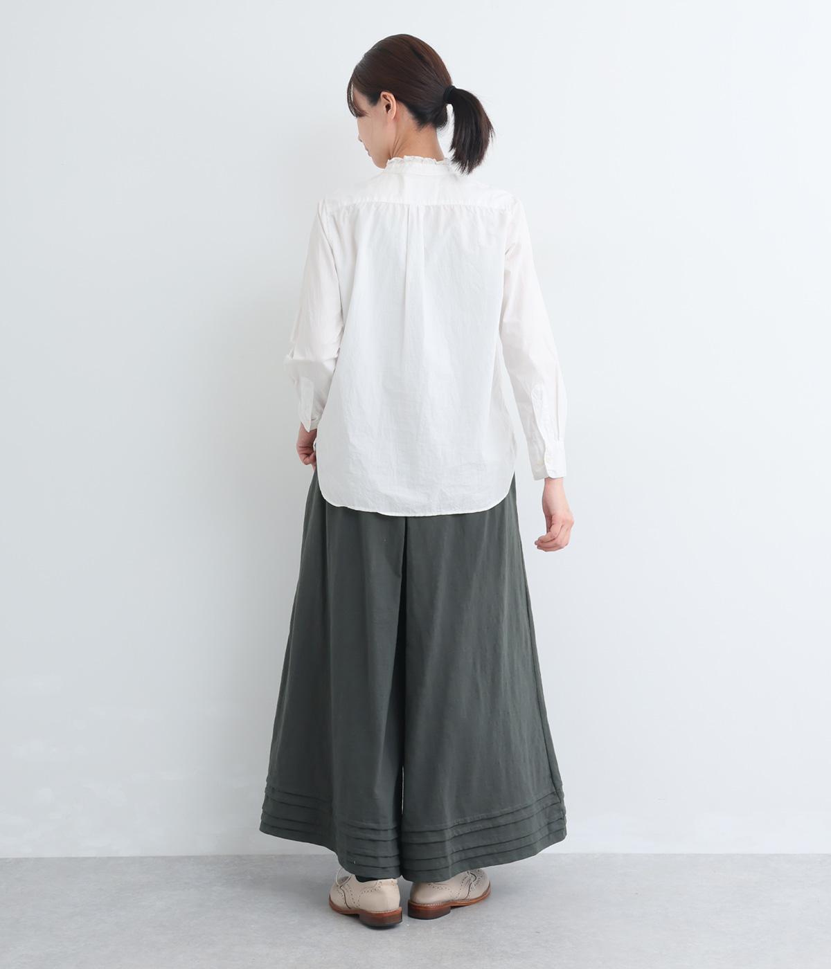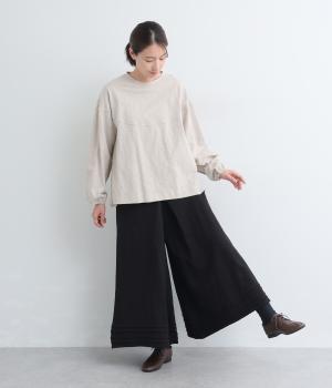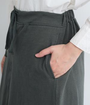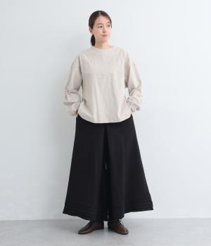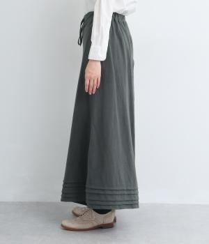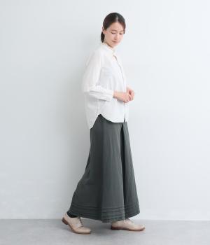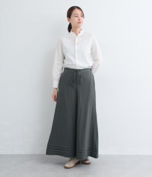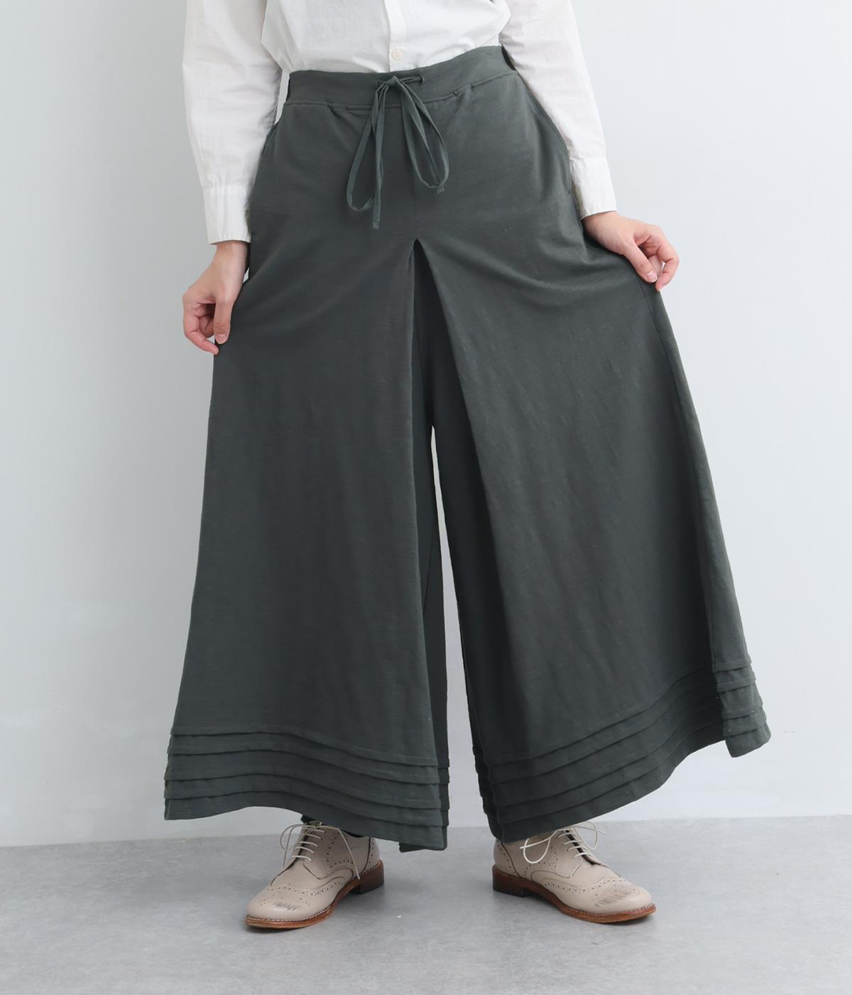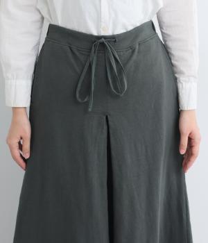 スカートのように見えるAラインシルエットが特徴的なワイドパンツ。適度な重厚感で、すっきりとしたトップス合わせで裾広がりなスタイリングがたのしめます。裾のタックラインもいいアクセントに。後ろウエストゴムに内紐入りです。