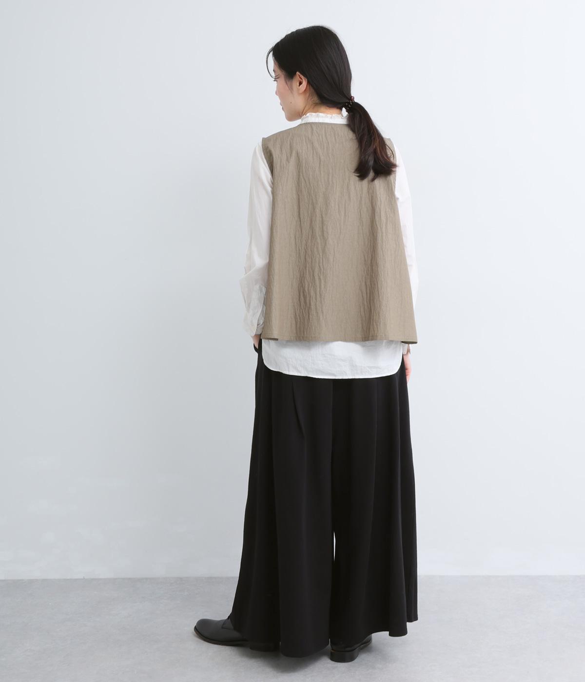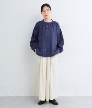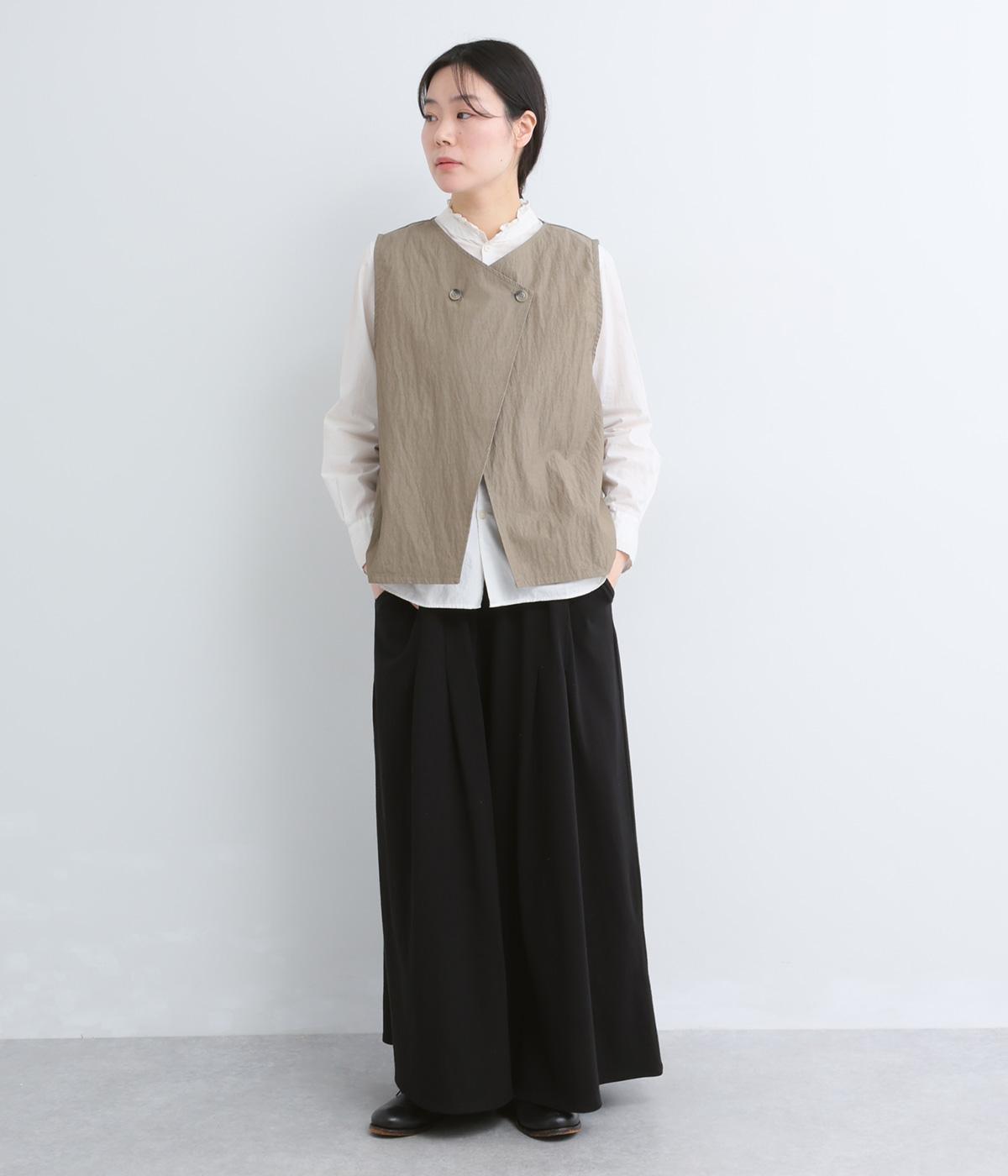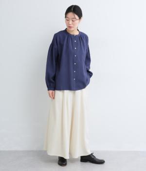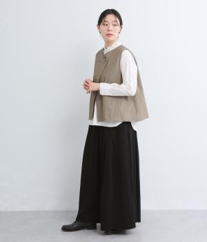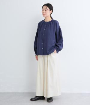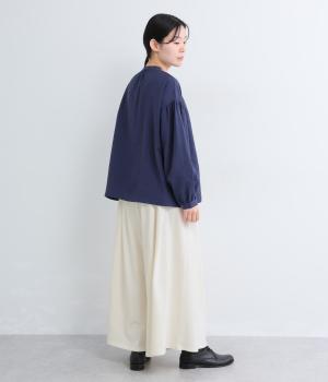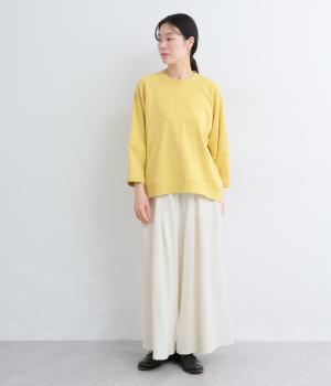 コットンにリネンをすこしまぜたドライでやわらかなタッチが心地よいカットソー生地を使用。ベルト部分にはほのかな光沢とシャリ感のある異素材を配しています。