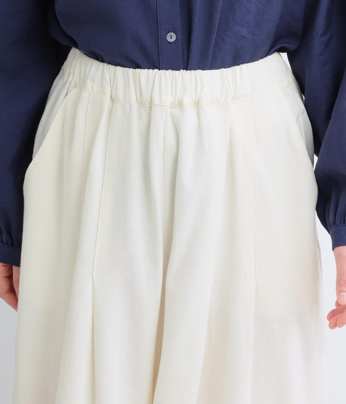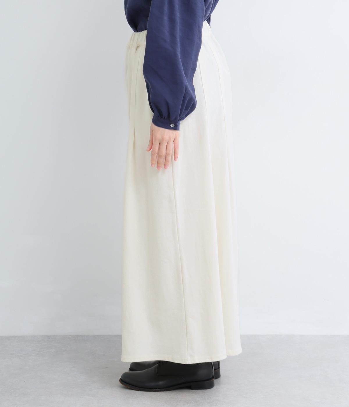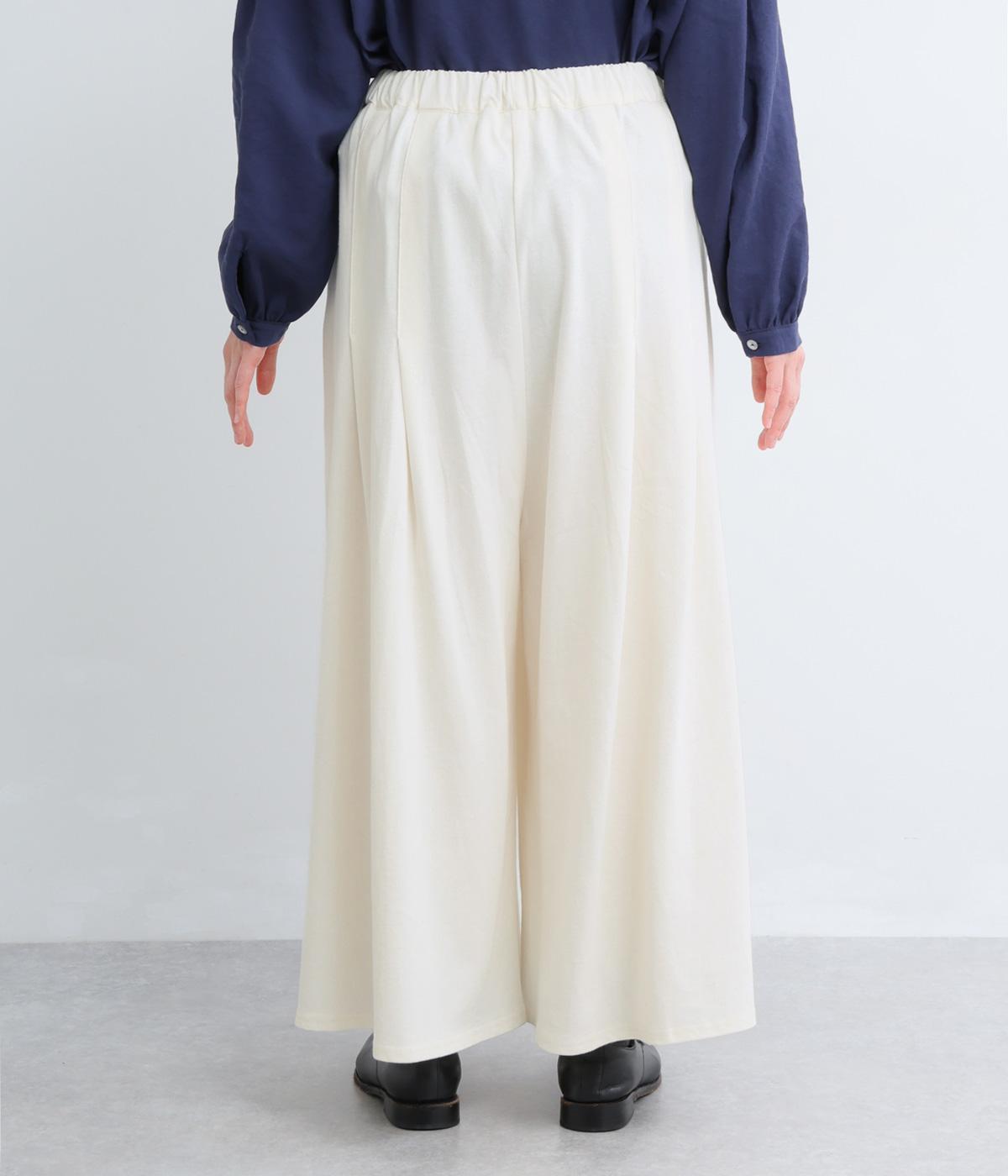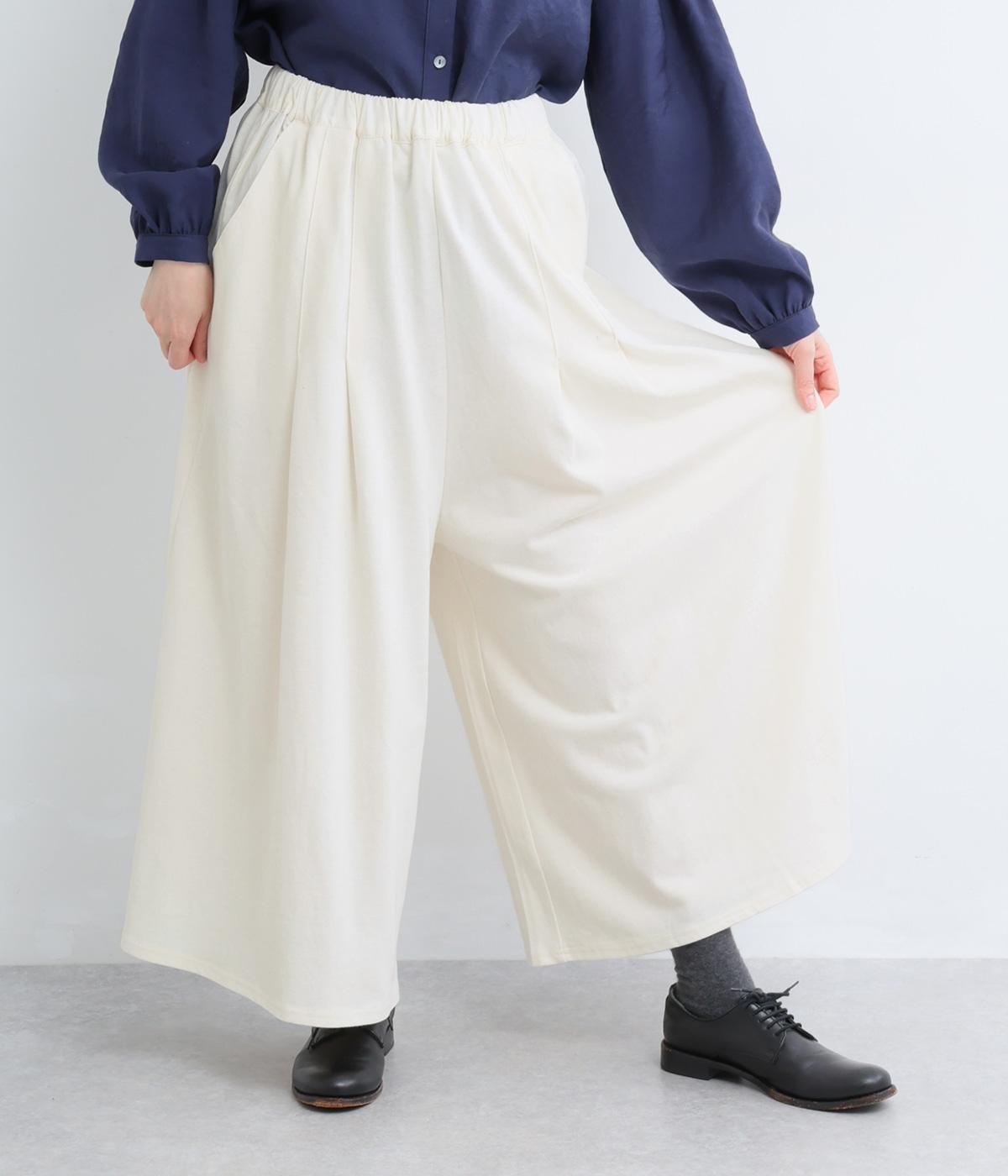 スカート見えするボリューム感が自慢のカットソーパンツ。タック入りで腰まわりの広がりをおさえ、裾に向かってフレアなシルエットに。ウエスト総ゴム&内紐入りのイージー仕様で、トップスインして異素材ベルトをポイントにした着こなしも◎。