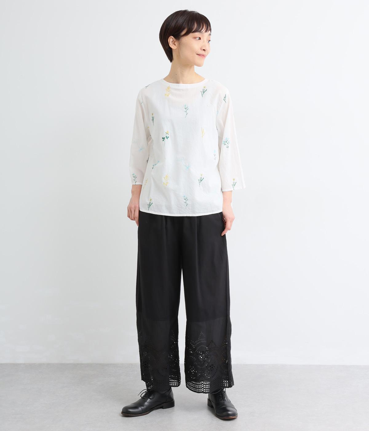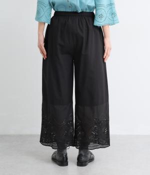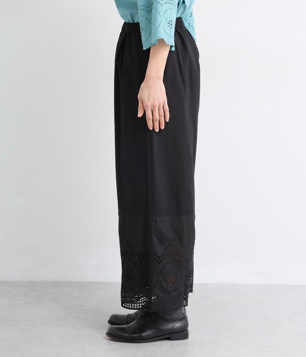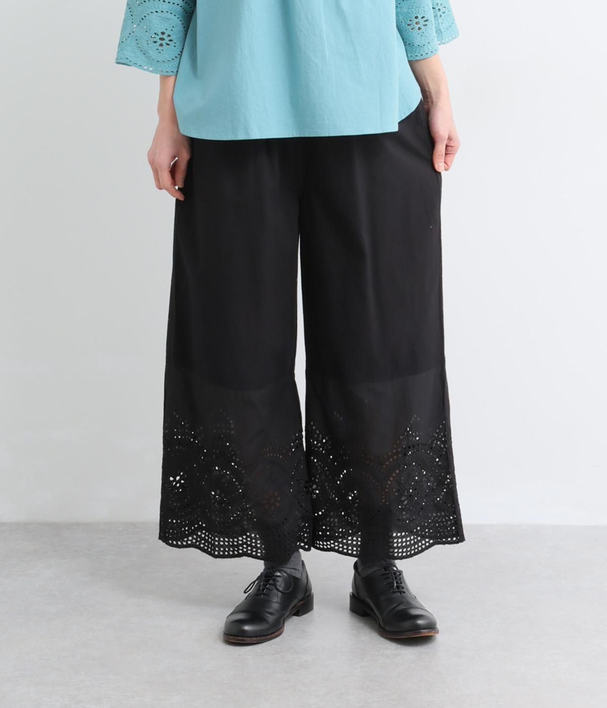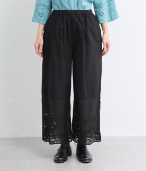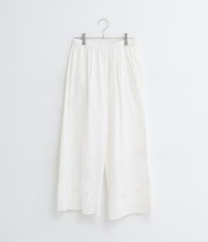 裾の波打つようなスカラップと繊細な刺しゅうが、さりげない抜け感と華やぎを添えるパンツ。甘さをほどよく抑えた上品な雰囲気で、さまざまなスタイリングになじみます。ウエストはゴム仕様で、穿き心地も快適です。