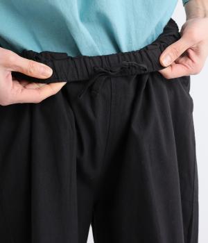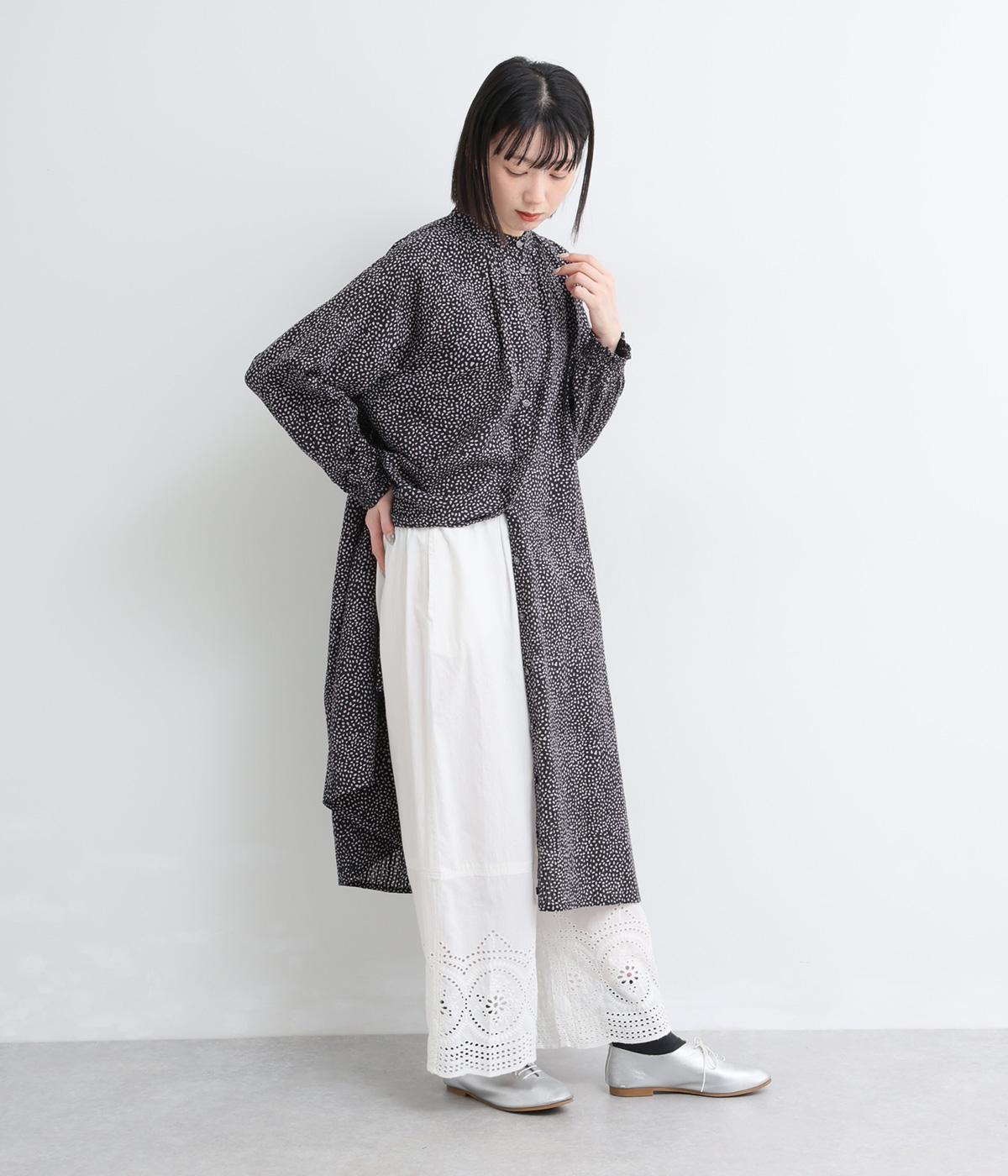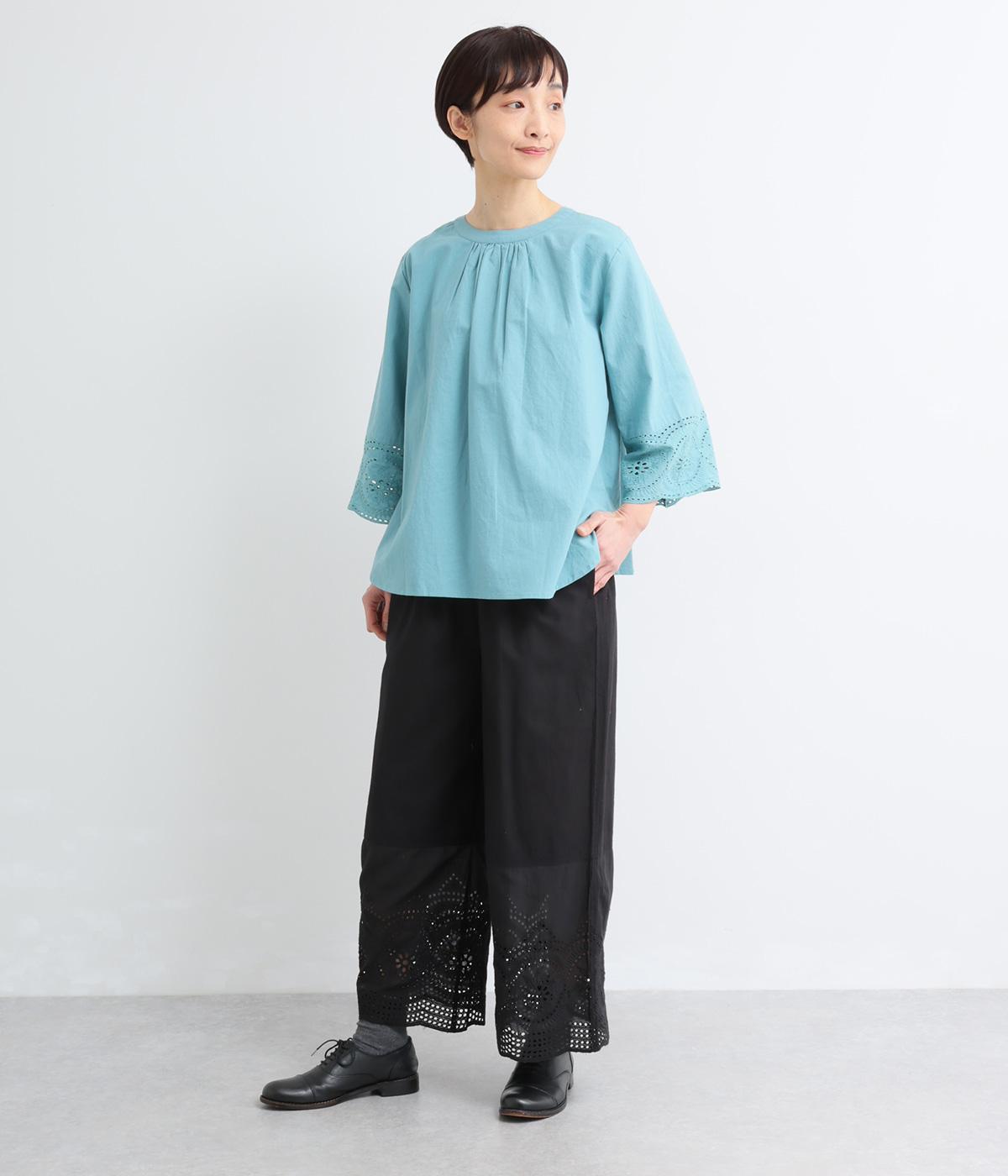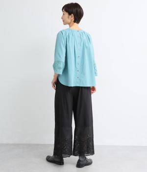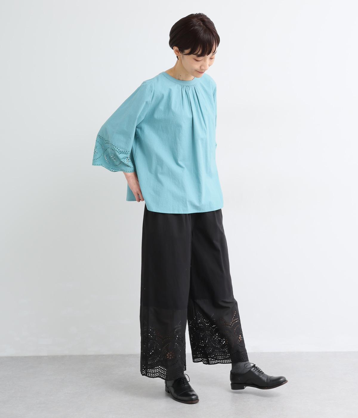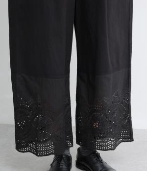 裾の波打つようなスカラップと繊細な刺しゅうが、さりげない抜け感と華やぎを添えるパンツ。甘さをほどよく抑えた上品な雰囲気で、さまざまなスタイリングになじみます。ウエストはゴム仕様で、穿き心地も快適です。