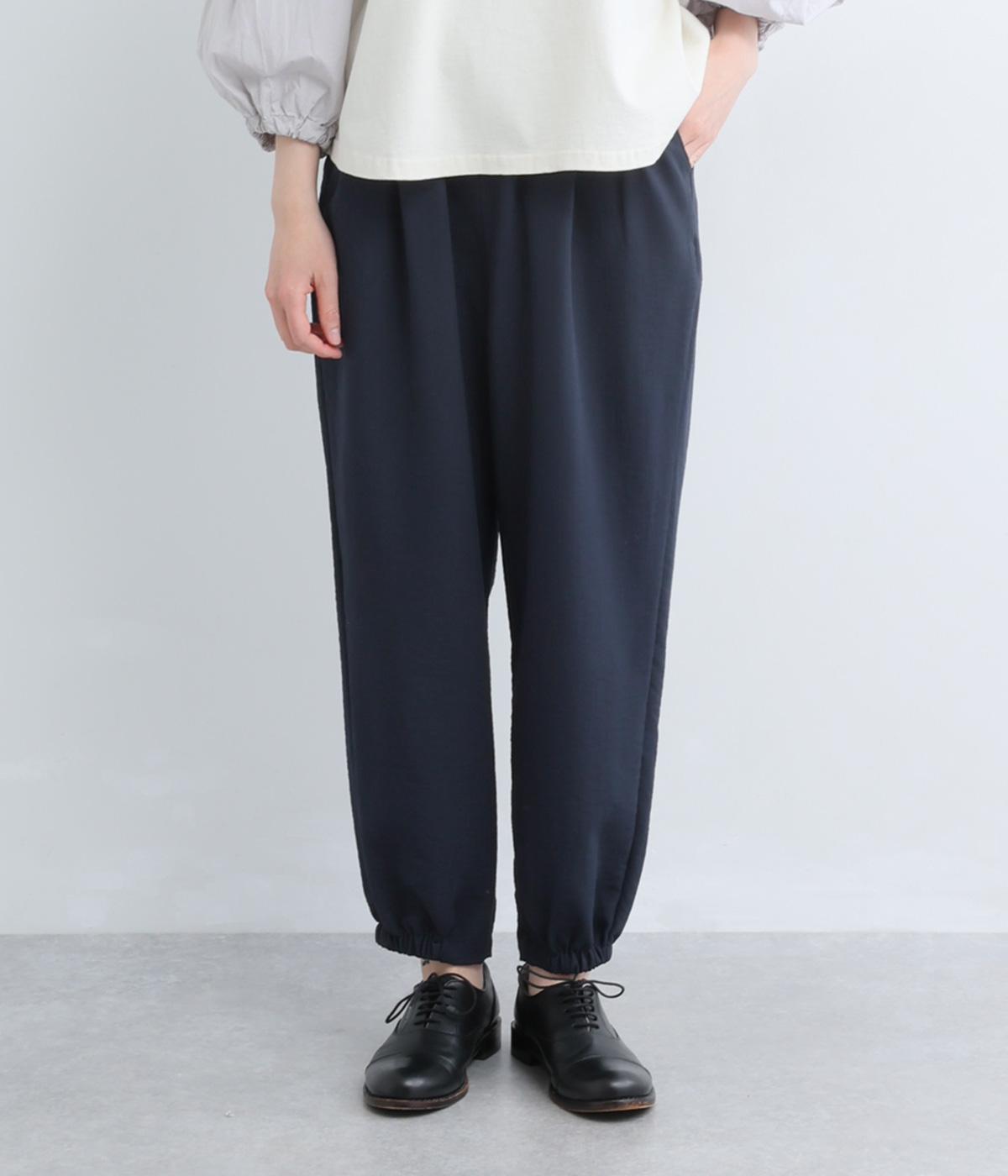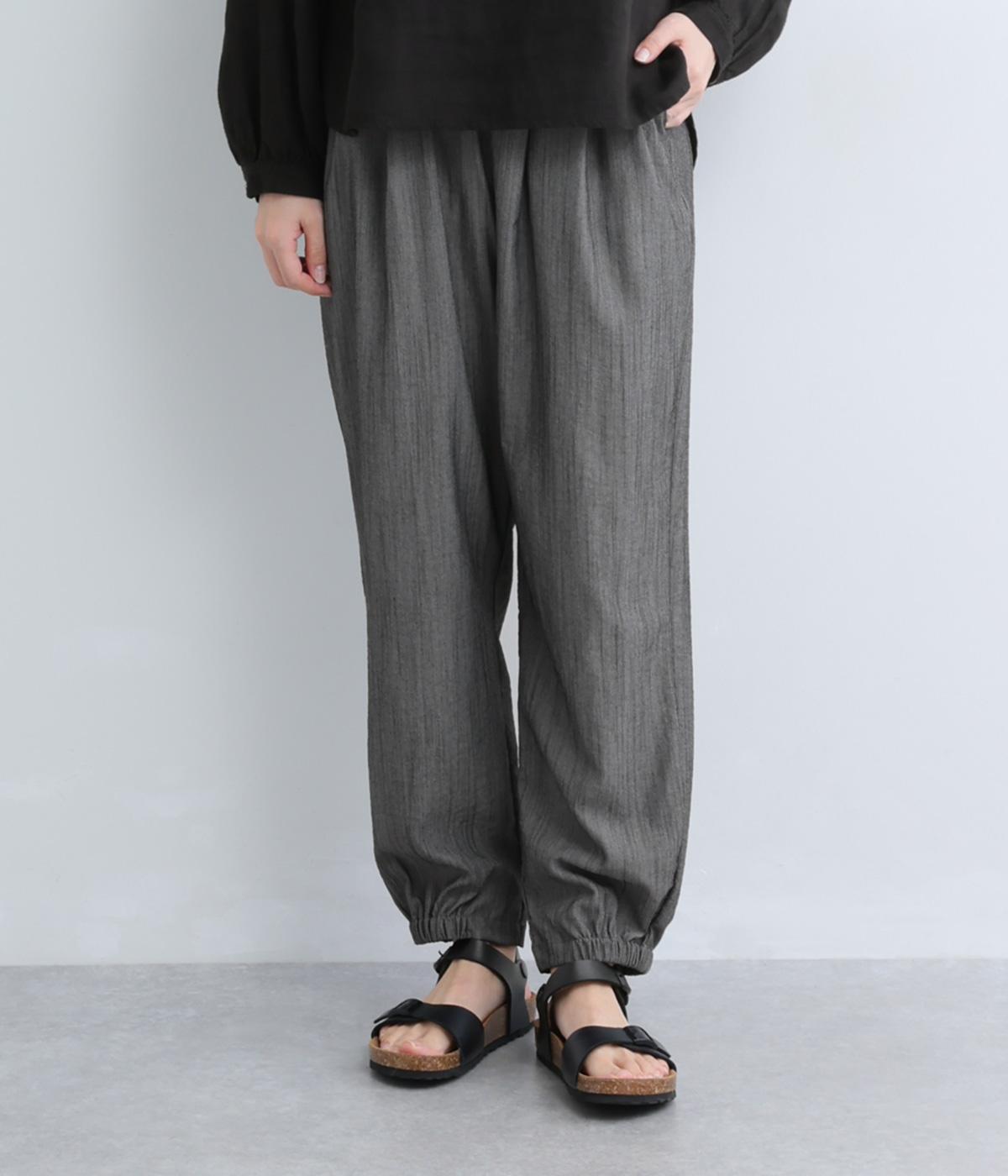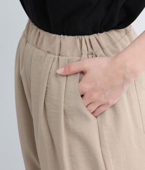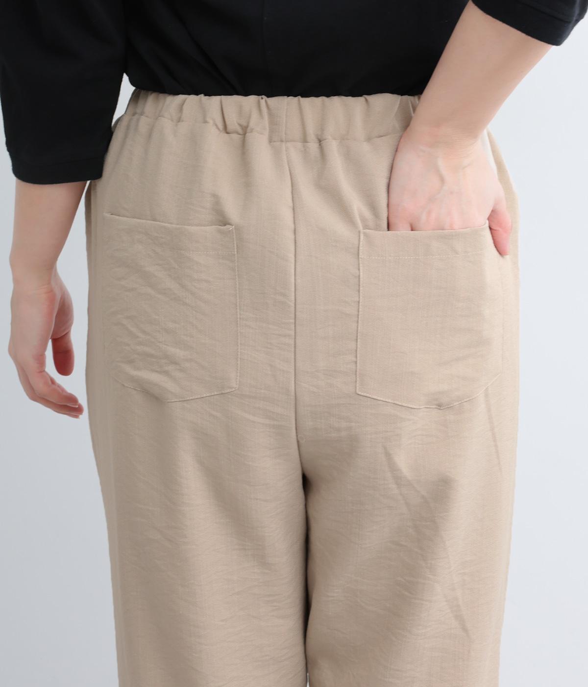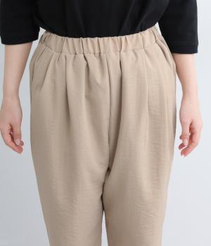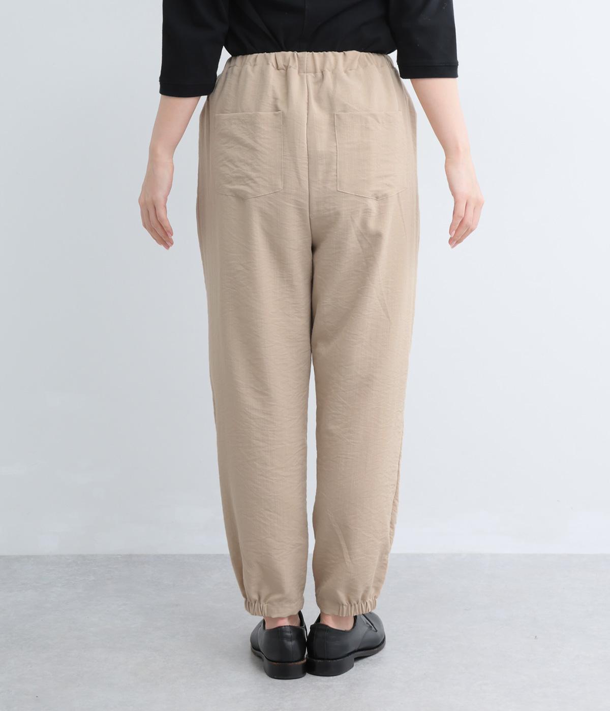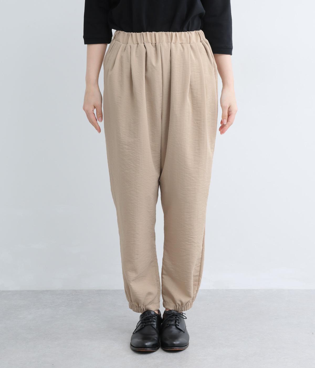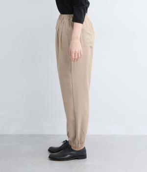 脚のラインを拾いにくいゆとりのあるシルエット。裾サイドにゴムを配して足元にニュアンスを加えました。ウエストは総ゴム仕様に内紐でサイズ調節が可能です。ベージュには裏地を配し、安心して穿いていただけます。