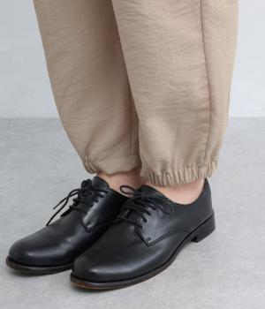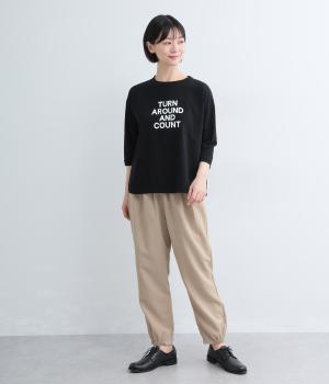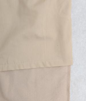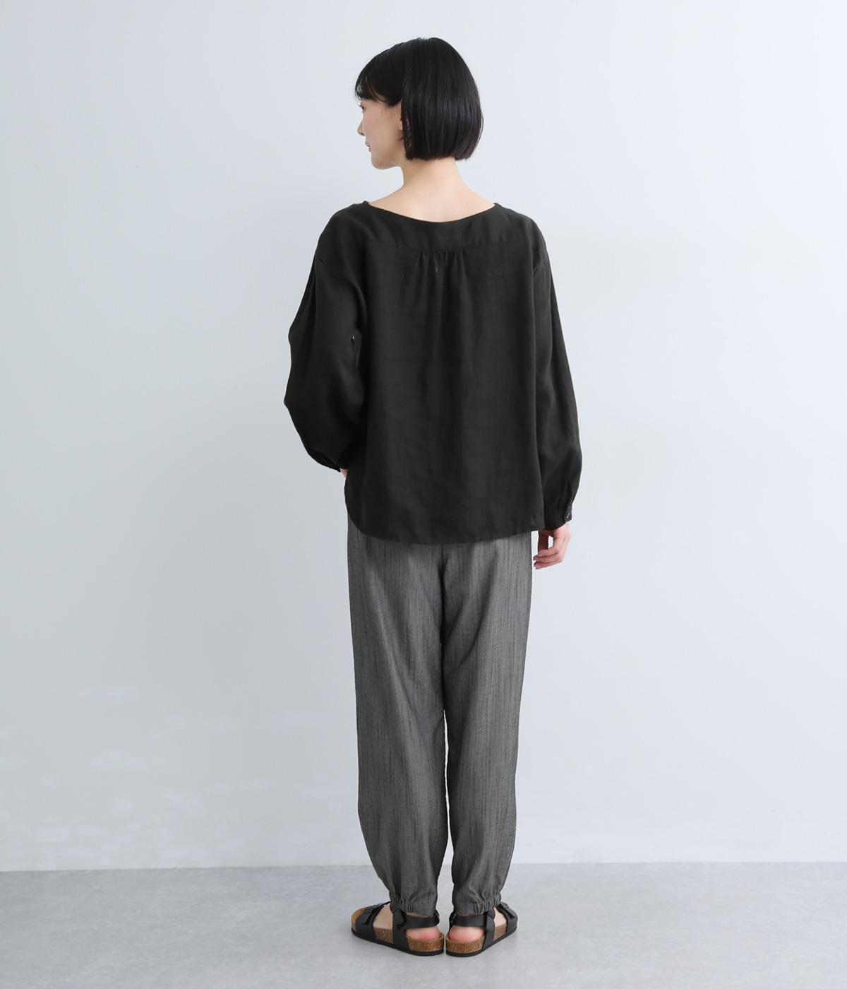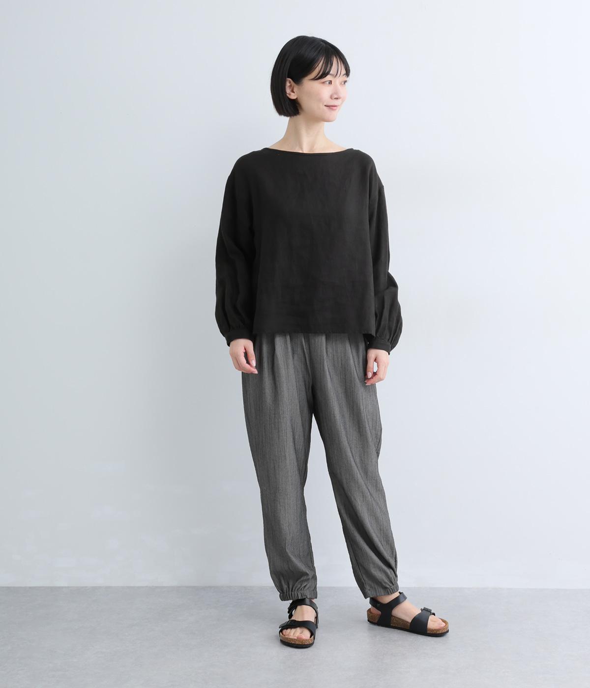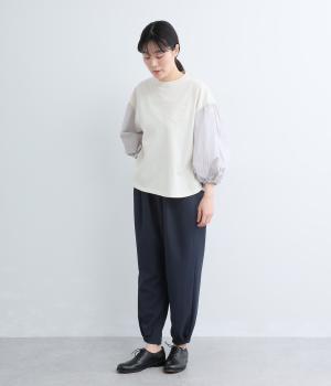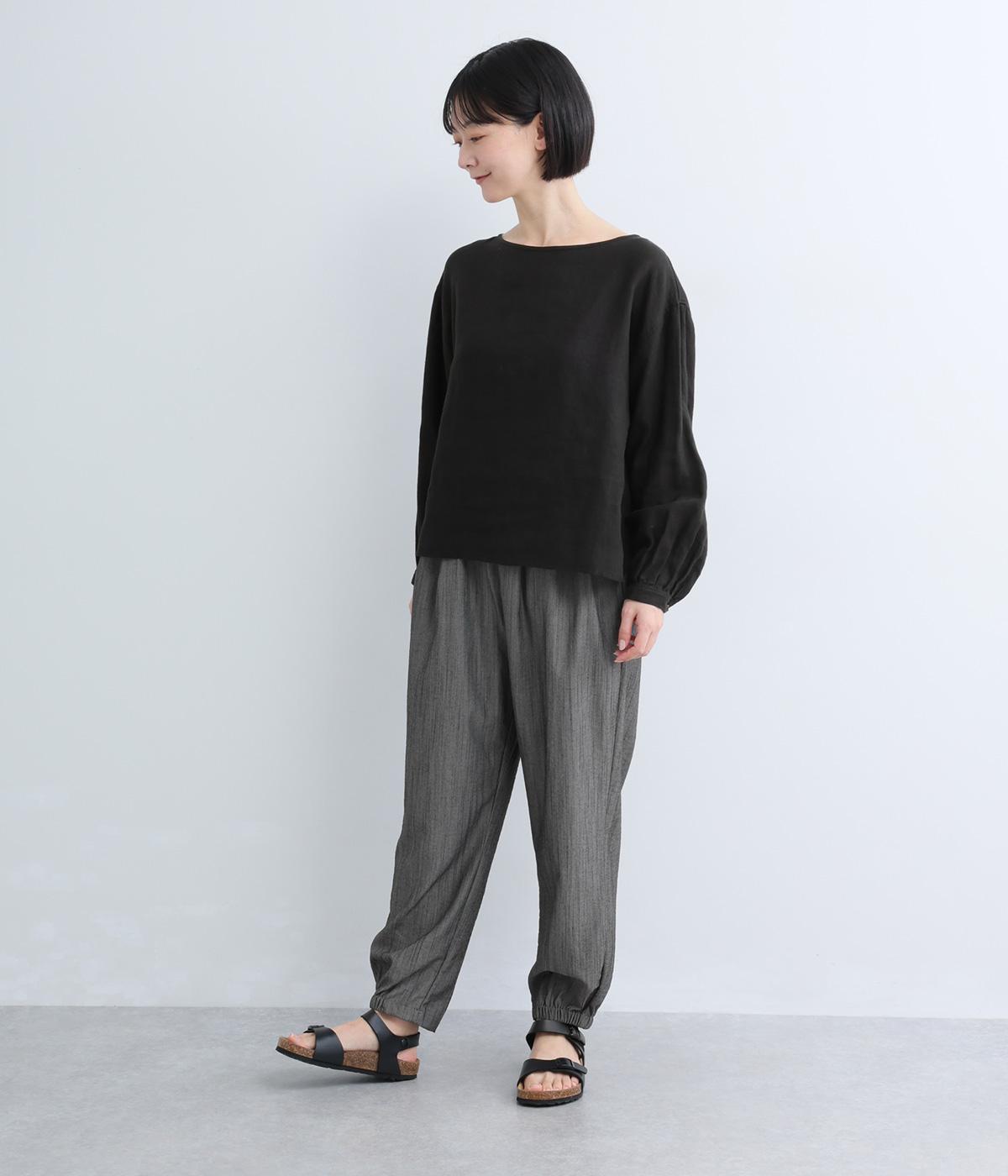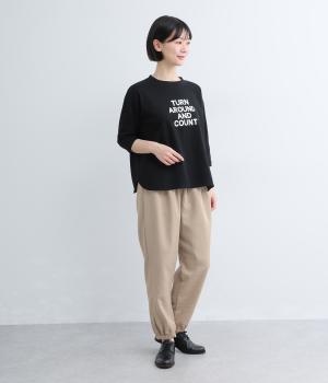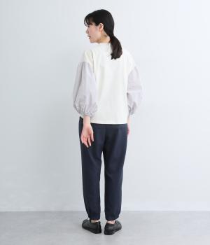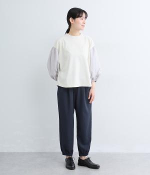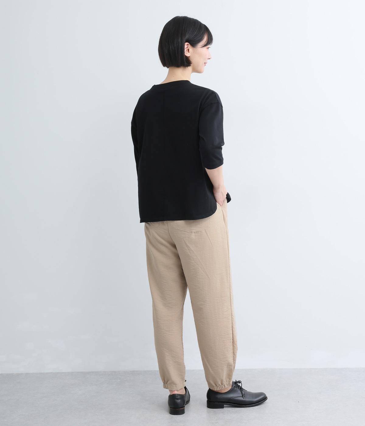 脚のラインを拾いにくいゆとりのあるシルエット。裾サイドにゴムを配して足元にニュアンスを加えました。ウエストは総ゴム仕様に内紐でサイズ調節が可能です。ベージュには裏地を配し、安心して穿いていただけます。