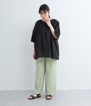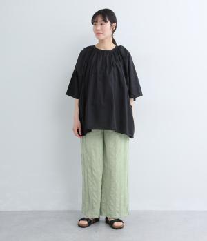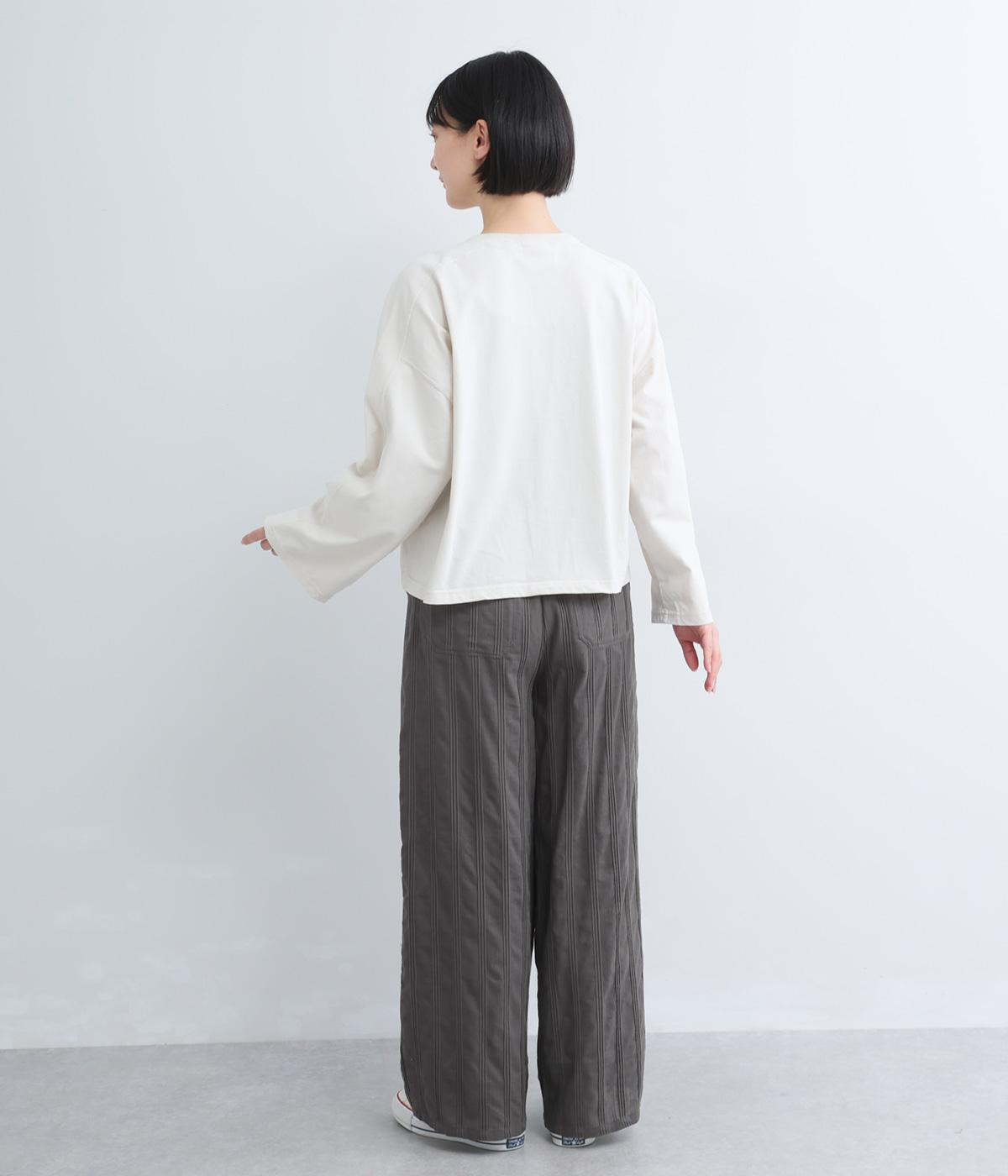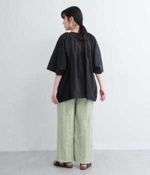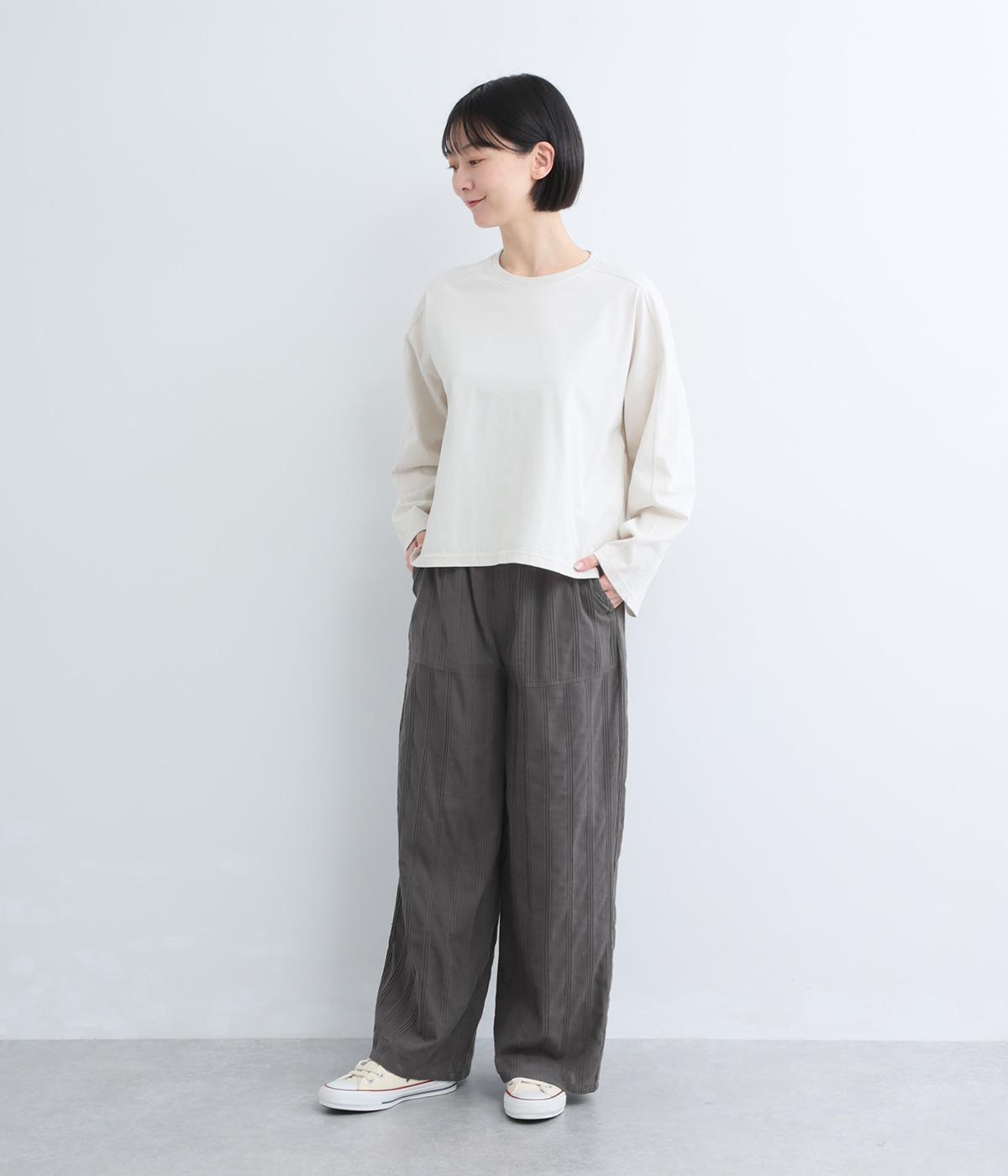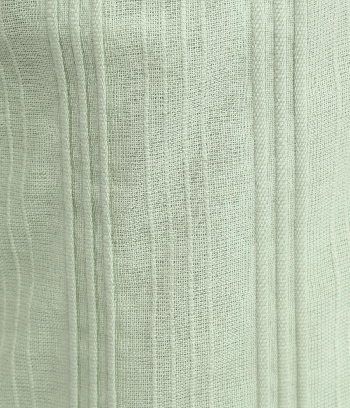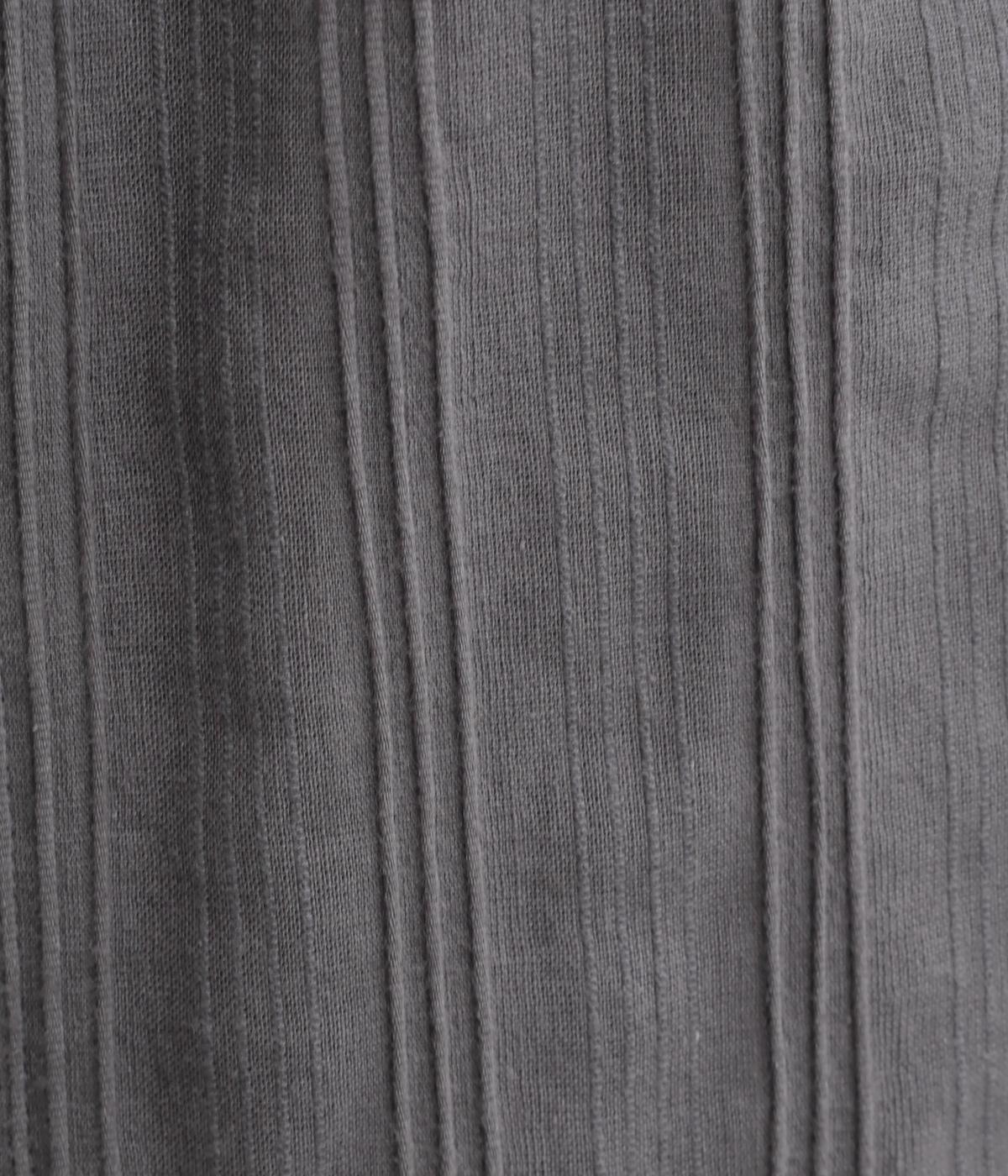 やわらかなコットンドビー生地を使用。織りによるドビーとタックを組み合わせたストライプ状の質感が、装いに奥行きを添えてくれます。肌なじみがよく、自然な風合いの素材です。