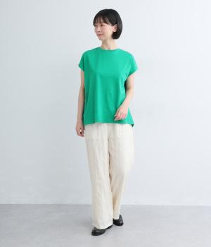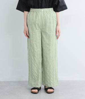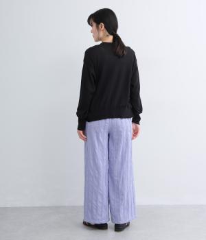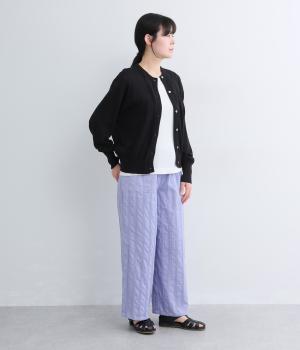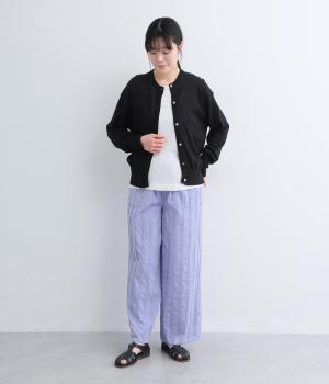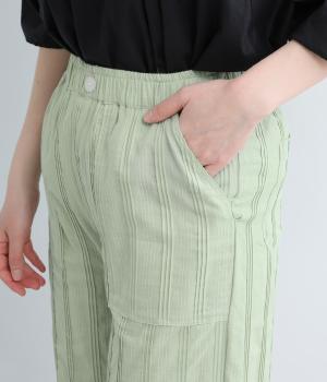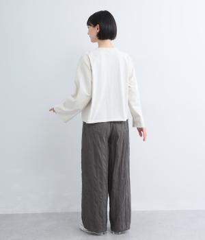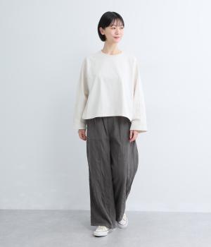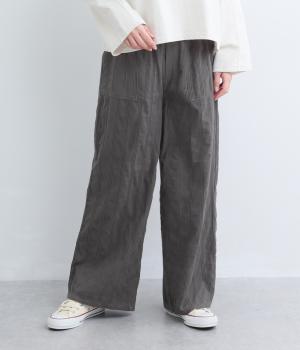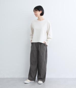 雰囲気の良い生地を生かしたシンプルなシルエットです。ウエストは総ゴム仕様で、飾りボタンがトップスインした際のさりげないアクセントになります。裏地付きで安心感があり、リラックス感と品の良さを両立しました。