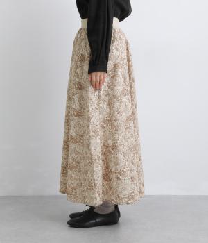 ヴィンテージ感のある素材に花柄をのせ、クラシカルな表情に仕上げたギャザースカート。軽く涼し気な生地で甘すぎることなく、幅広いテイストにマッチ。ウエストリブ仕様ではき心地も快適です。