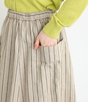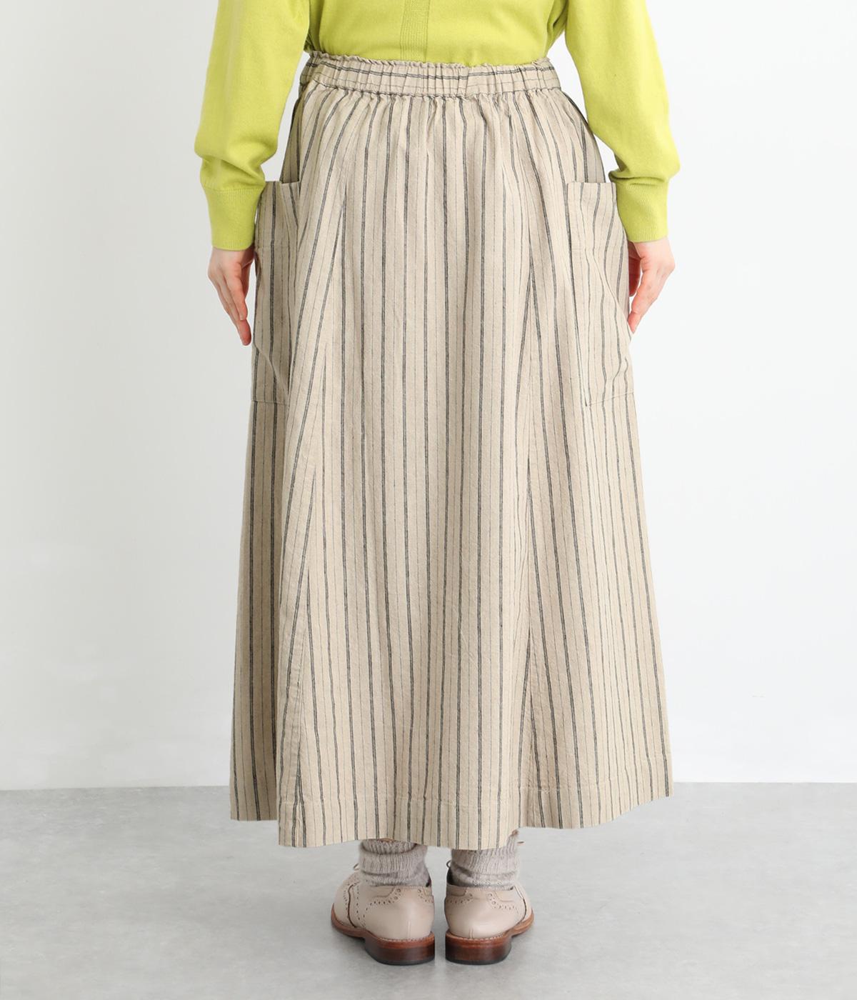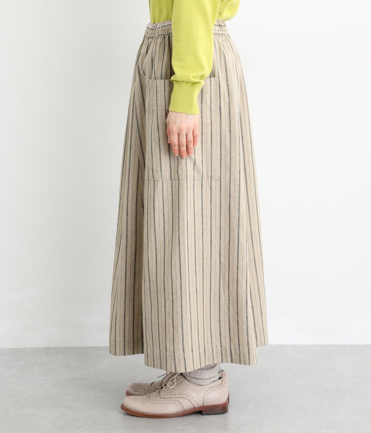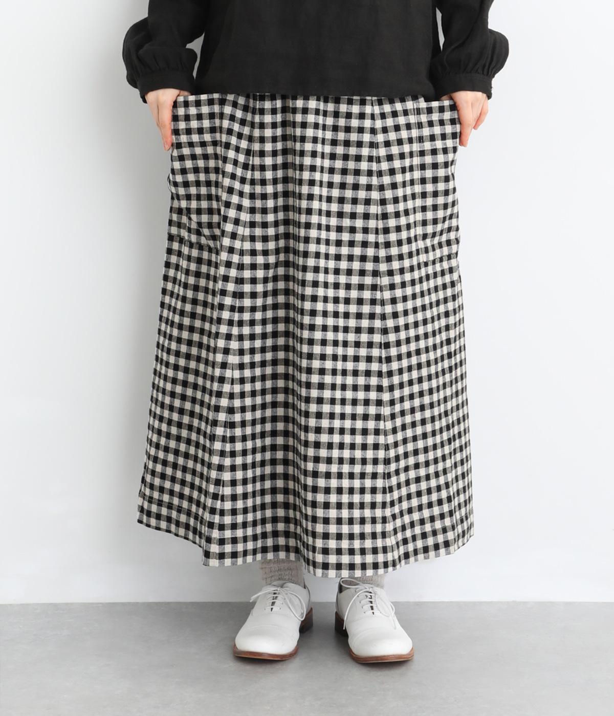 落ち感のある生地がほどよく広がりを抑え、落ち着いたAラインシルエットを描きます。サイドの大きなパッチポケットがアクセントになりつつ、実用性も兼ね備えた一着です。ウエストゴムで紐でサイズ調節が可能です。