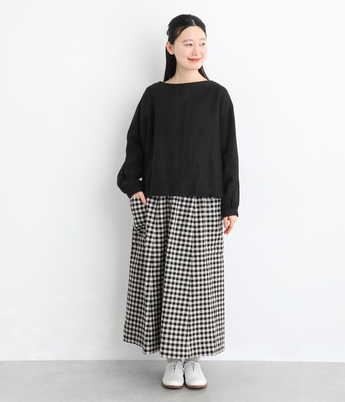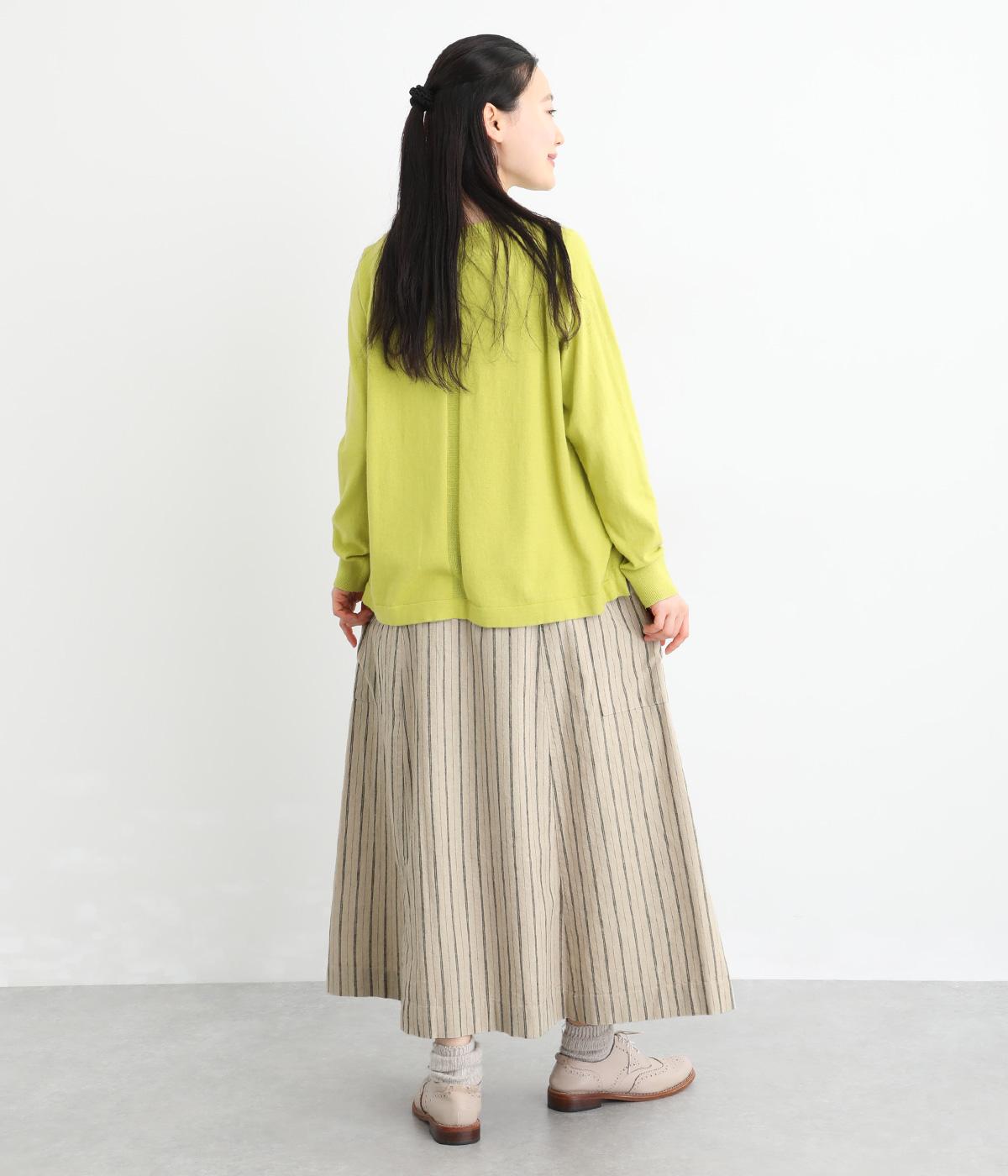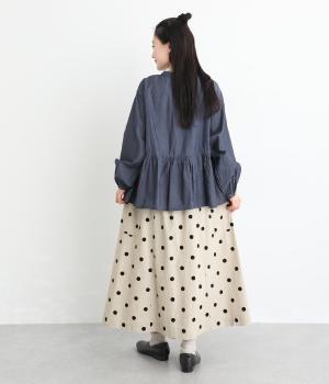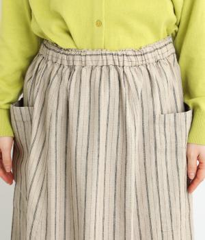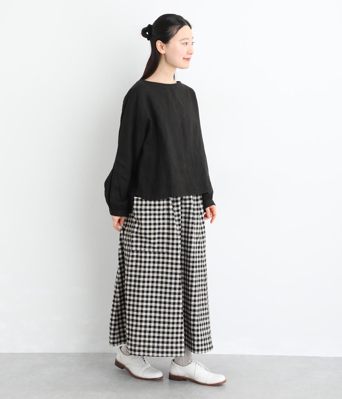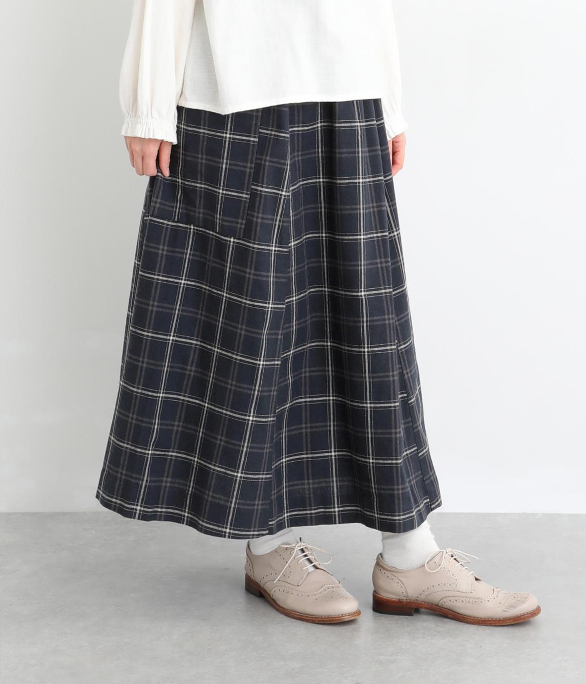 落ち感のある生地がほどよく広がりを抑え、落ち着いたAラインシルエットを描きます。サイドの大きなパッチポケットがアクセントになりつつ、実用性も兼ね備えた一着です。ウエストゴムで紐でサイズ調節が可能です。