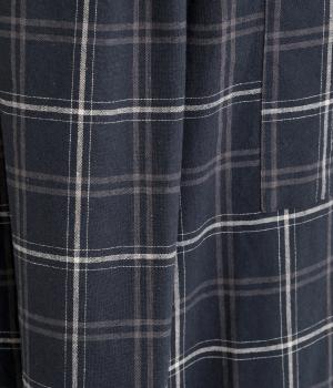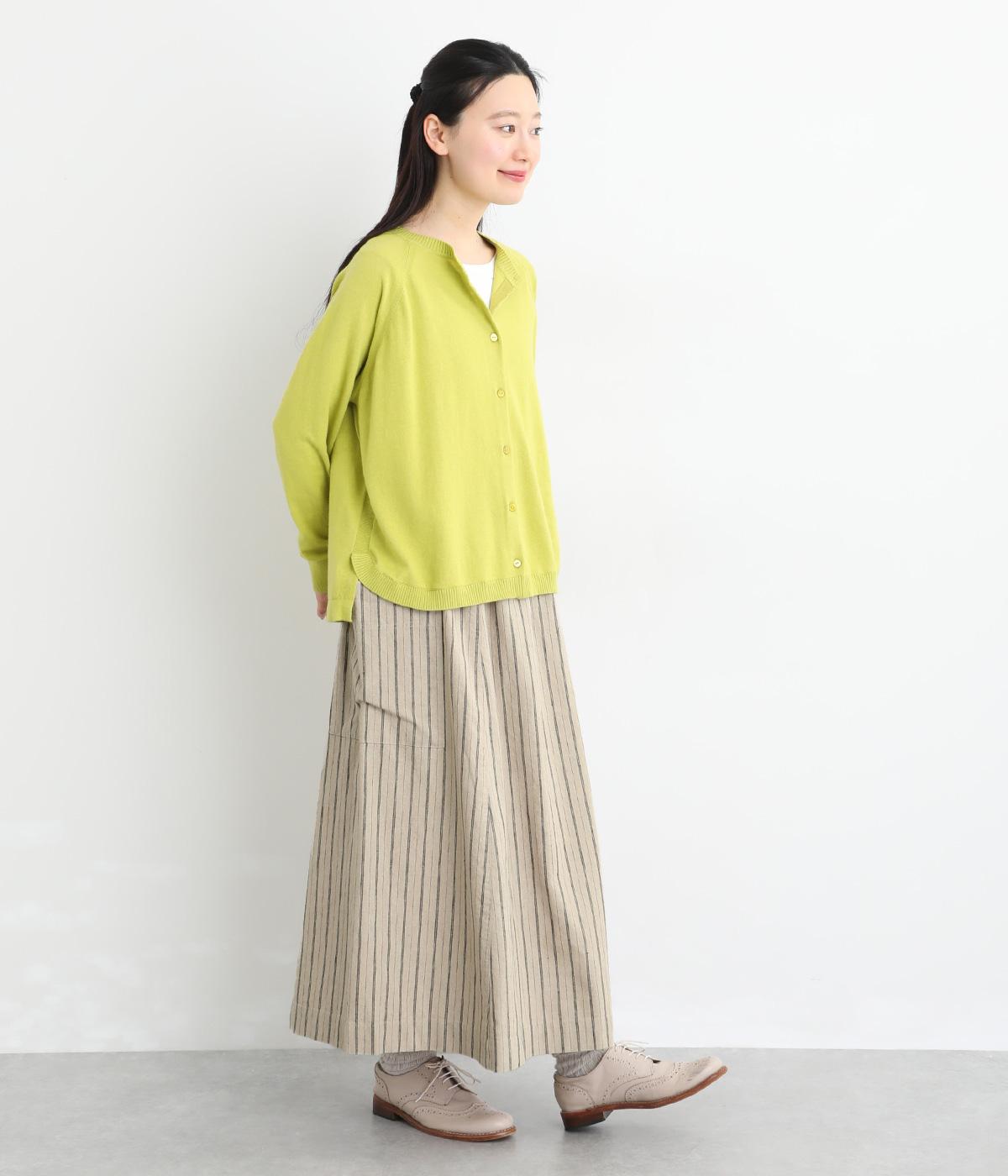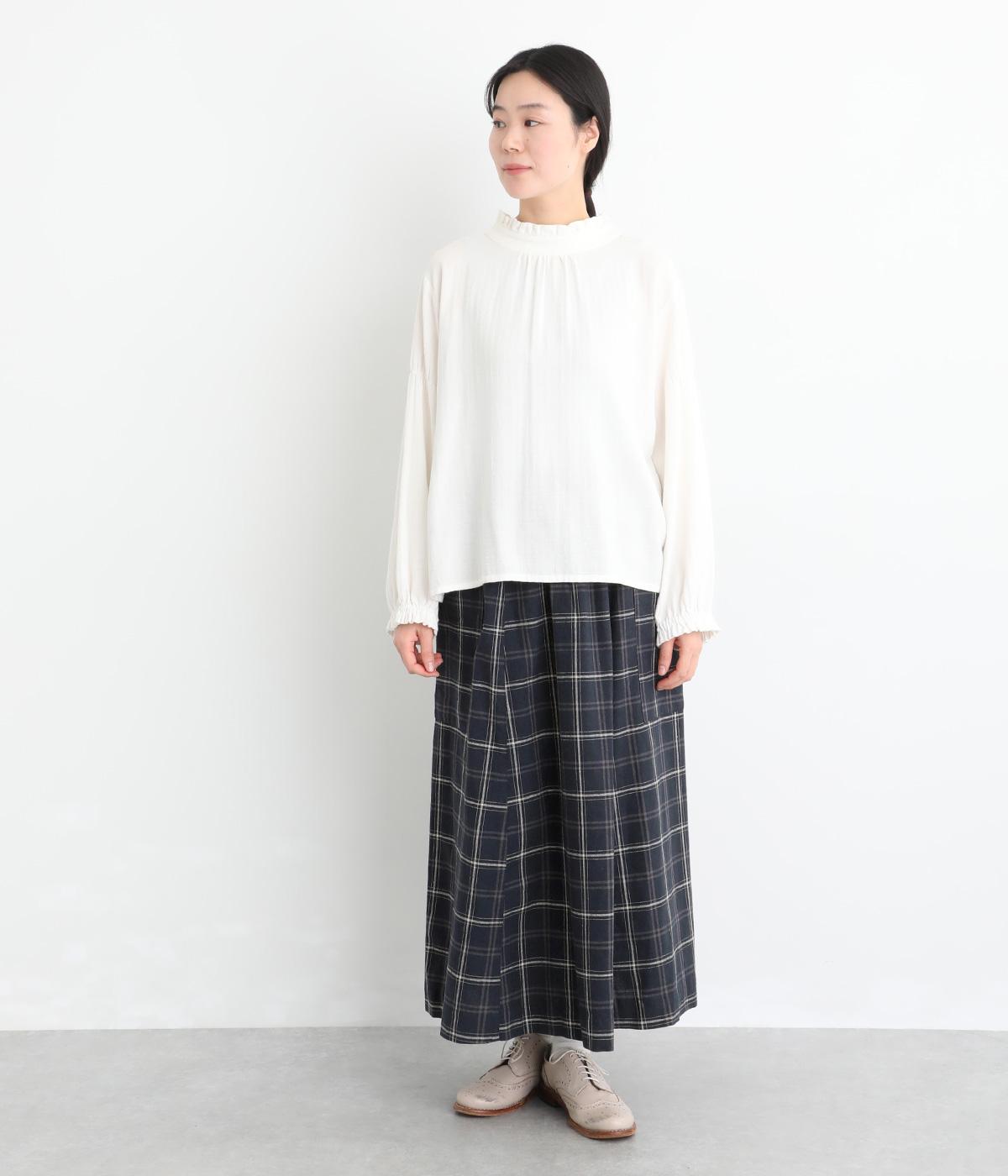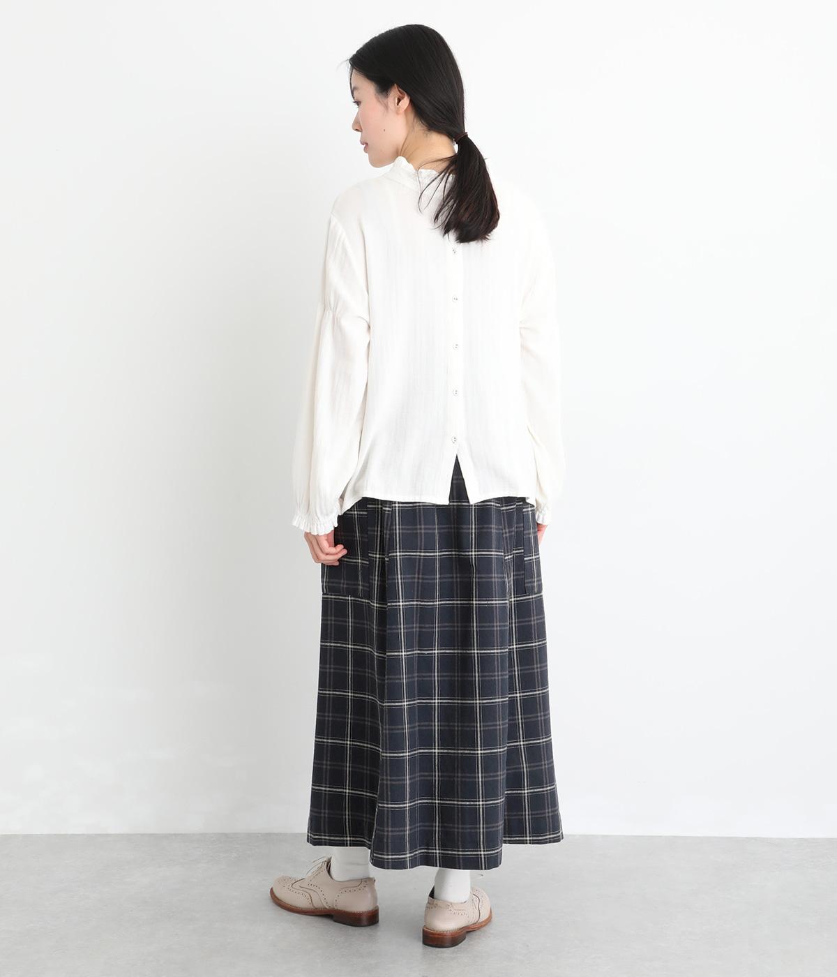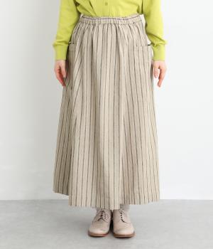 落ち感のある生地がほどよく広がりを抑え、落ち着いたAラインシルエットを描きます。サイドの大きなパッチポケットがアクセントになりつつ、実用性も兼ね備えた一着です。ウエストゴムで紐でサイズ調節が可能です。