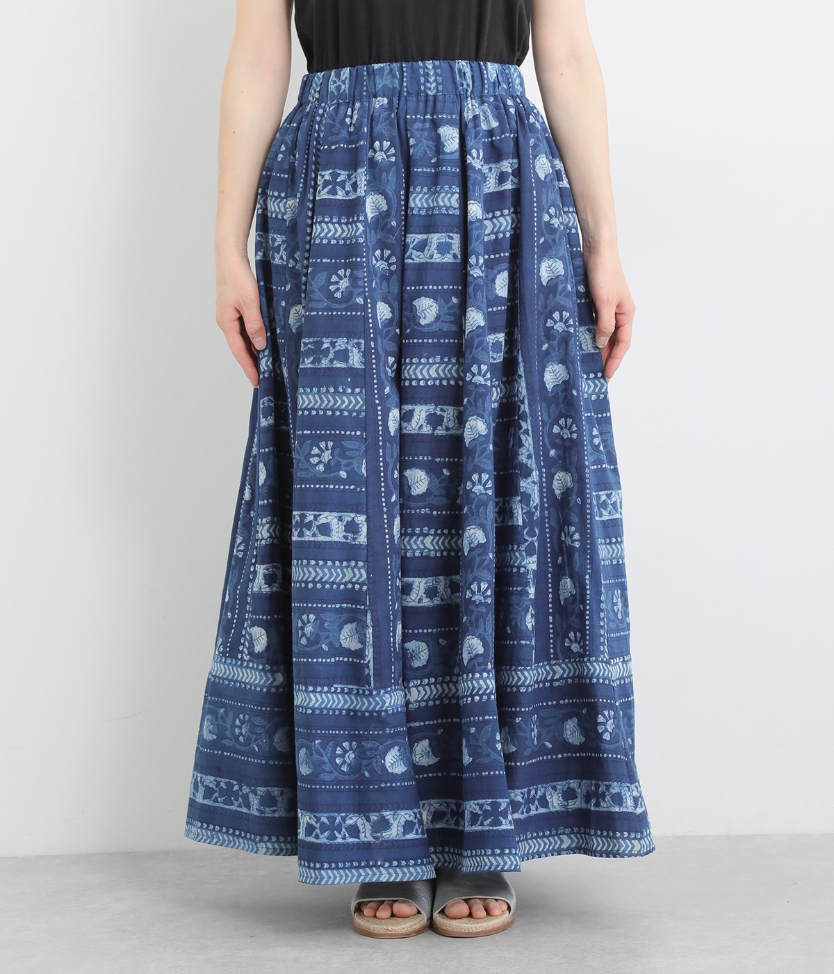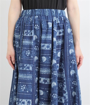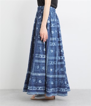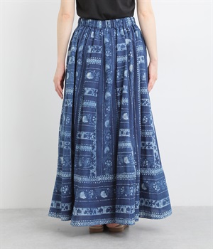 ボタニカルなモチーフをプリントしたポ総柄のスカートです。柄の向きを縦横で切り替えることで、アクセントをプラス。ウエストはお腹の締めつけを感じにくいオールゴム仕様です。