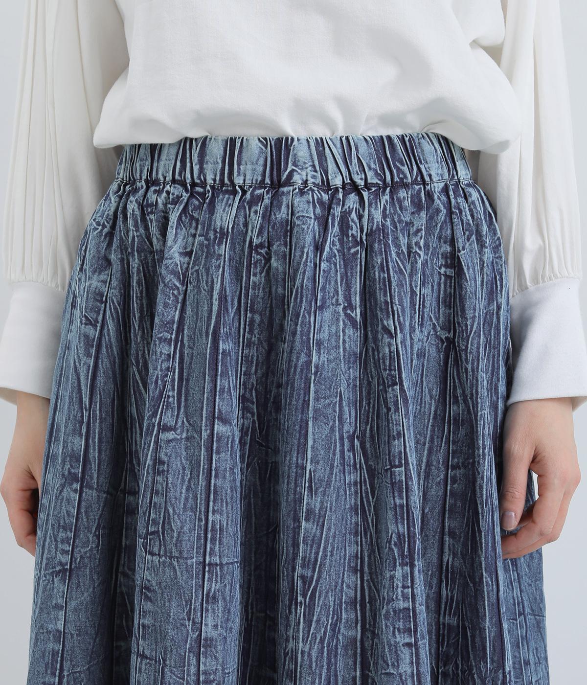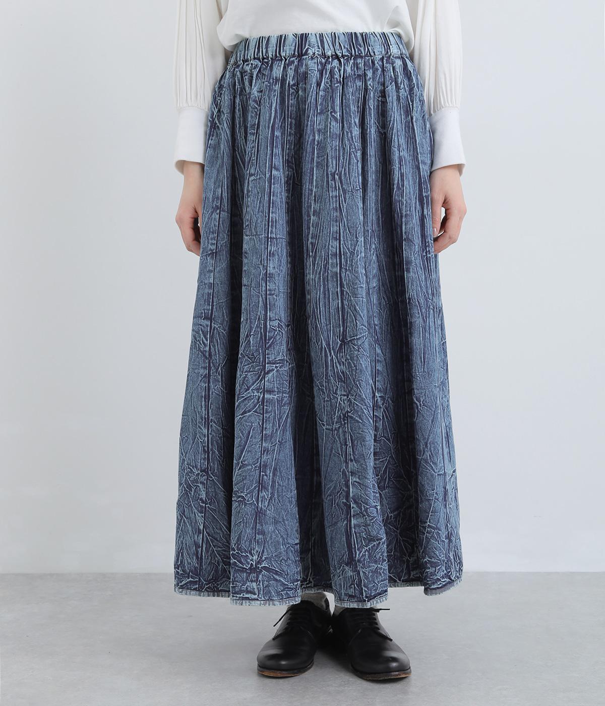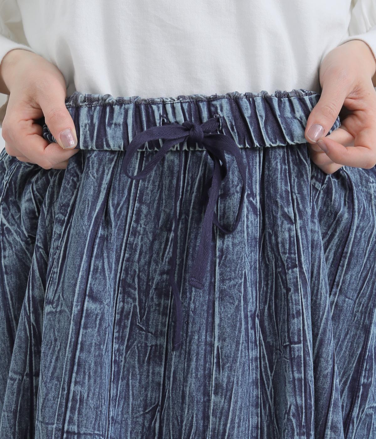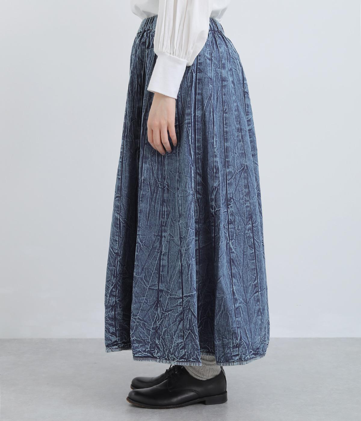 タテに細かくパーツを分けてきれいなフレアシルエットを描いた接ぎスカート。クラッシュデニムのハードな印象をやわらげつつも、女性の力強さも映し出してくれる一枚。ウエストは総ゴム&内紐入りのリラックスタイプです。