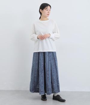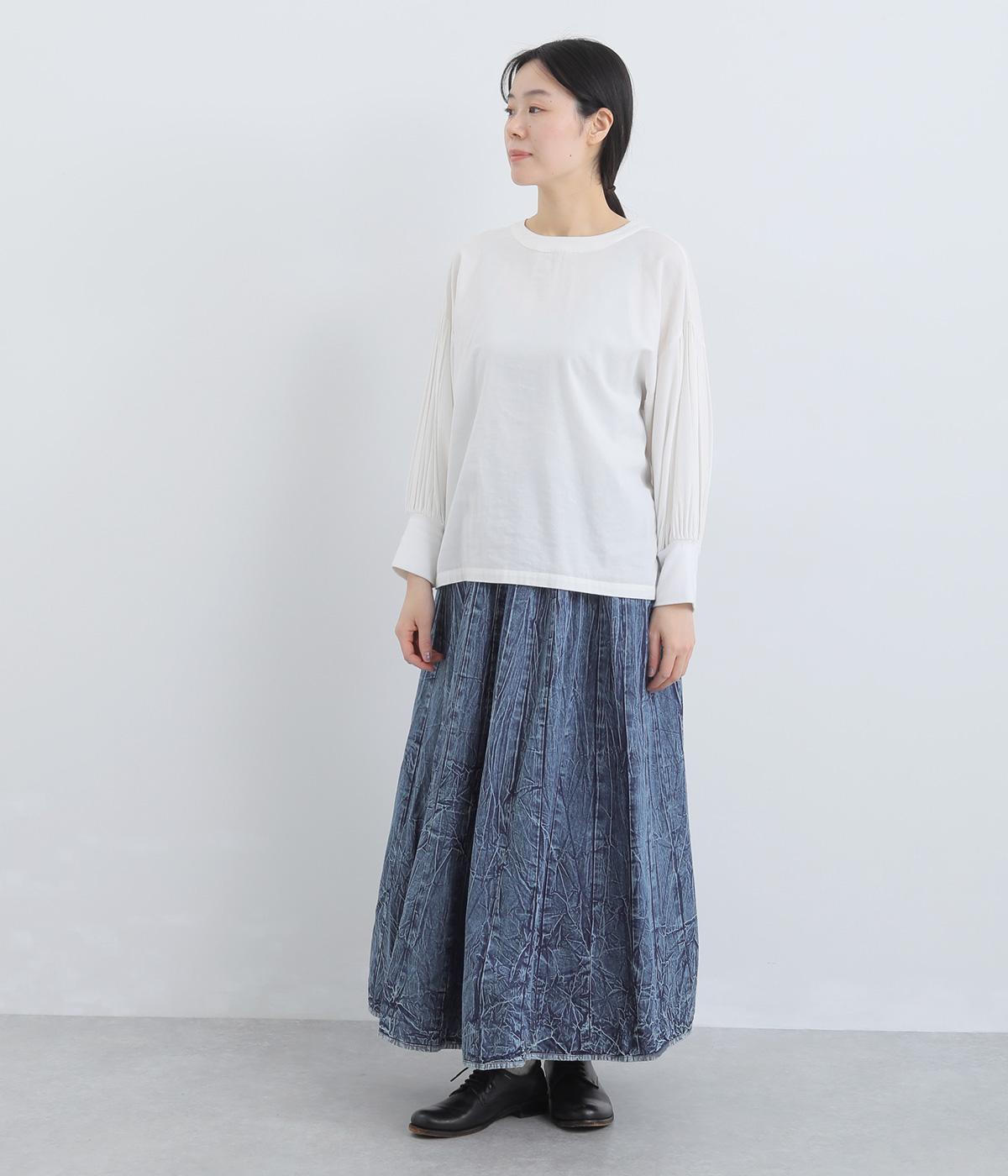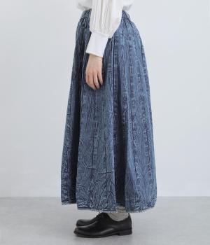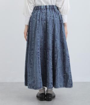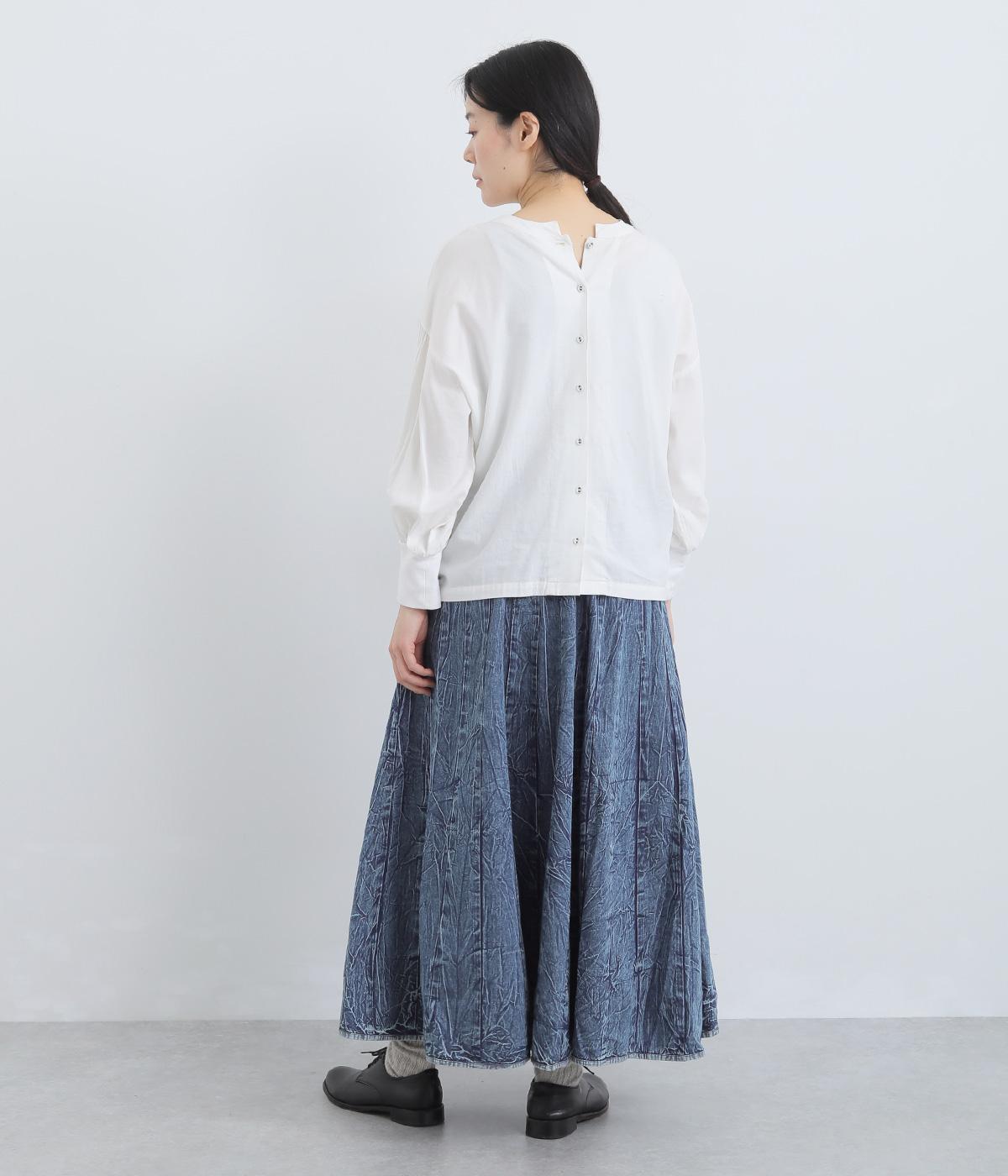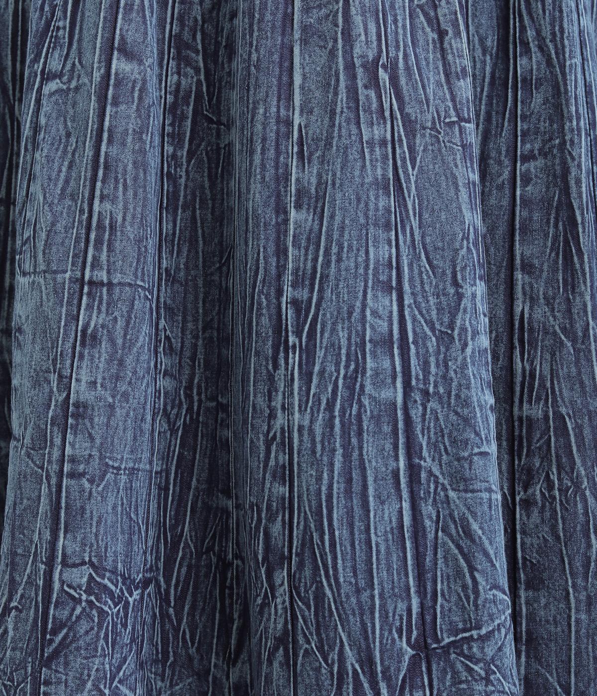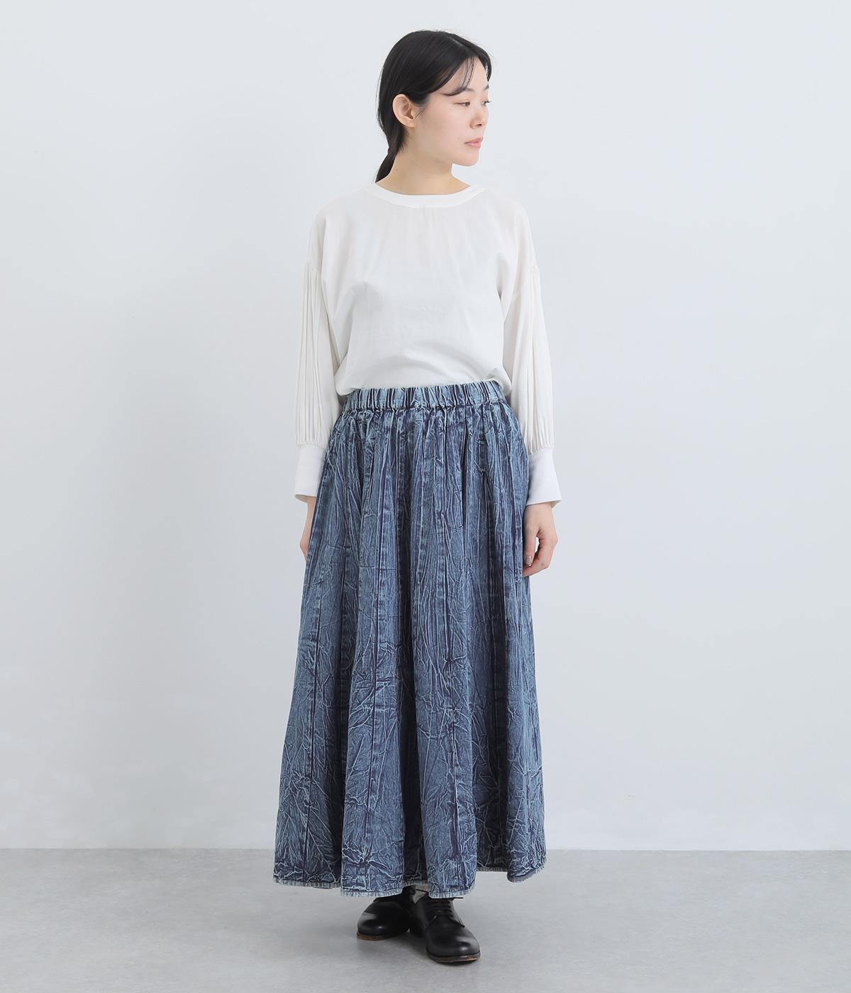 タテに細かくパーツを分けてきれいなフレアシルエットを描いた接ぎスカート。クラッシュデニムのハードな印象をやわらげつつも、女性の力強さも映し出してくれる一枚。ウエストは総ゴム&内紐入りのリラックスタイプです。