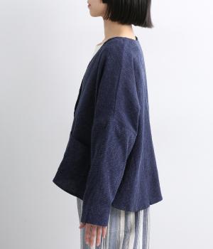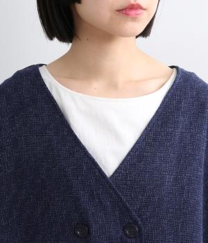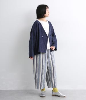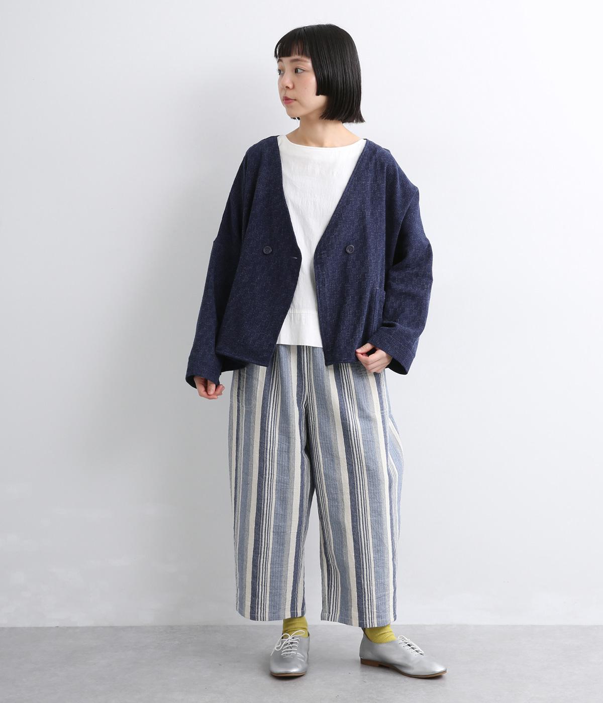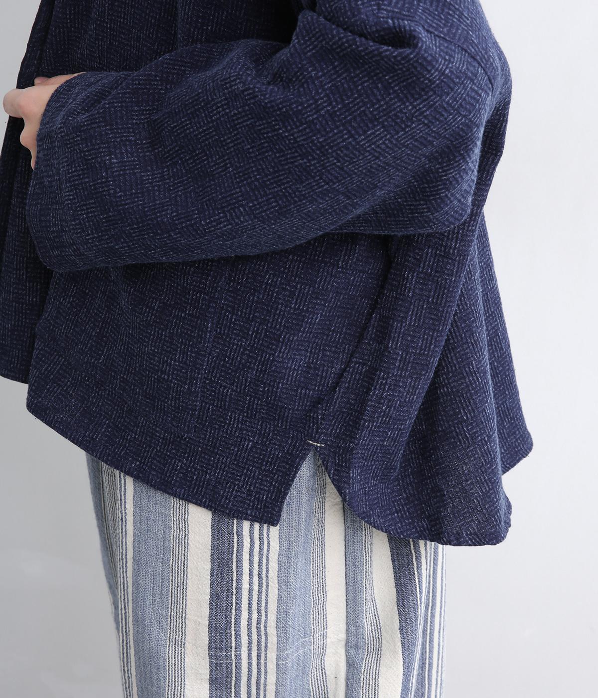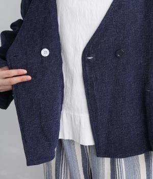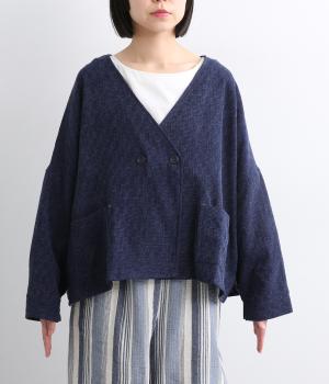 ラフに羽織るだけでもサマになる、インディゴの風合いが光るジャケットです。すっきりしたVネックにダブルボタンのモダンな一着。ワイドな身幅ながらバランスのいい着丈でボトム合わせも困りません。袖口を折り返して抜け感を持たせても◎。