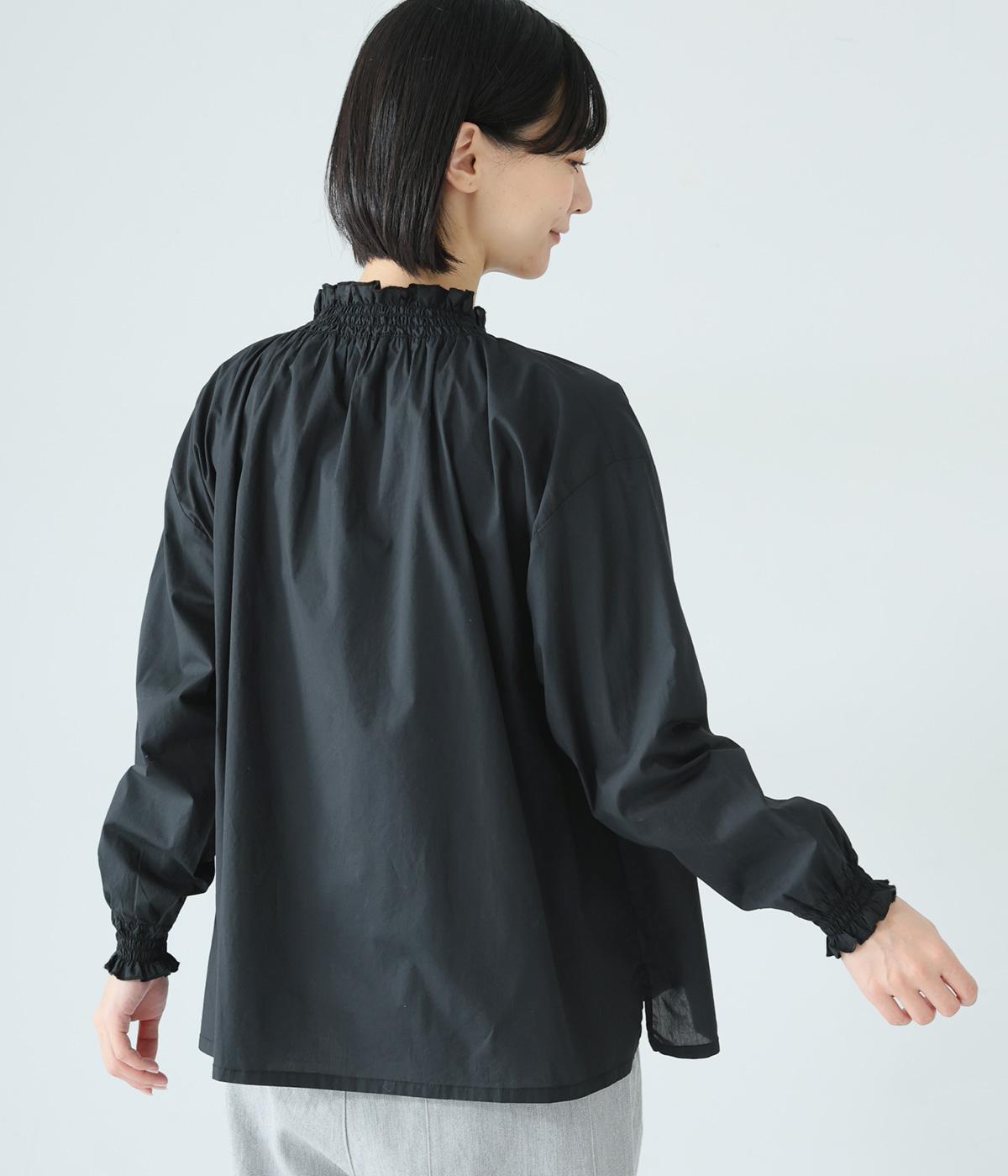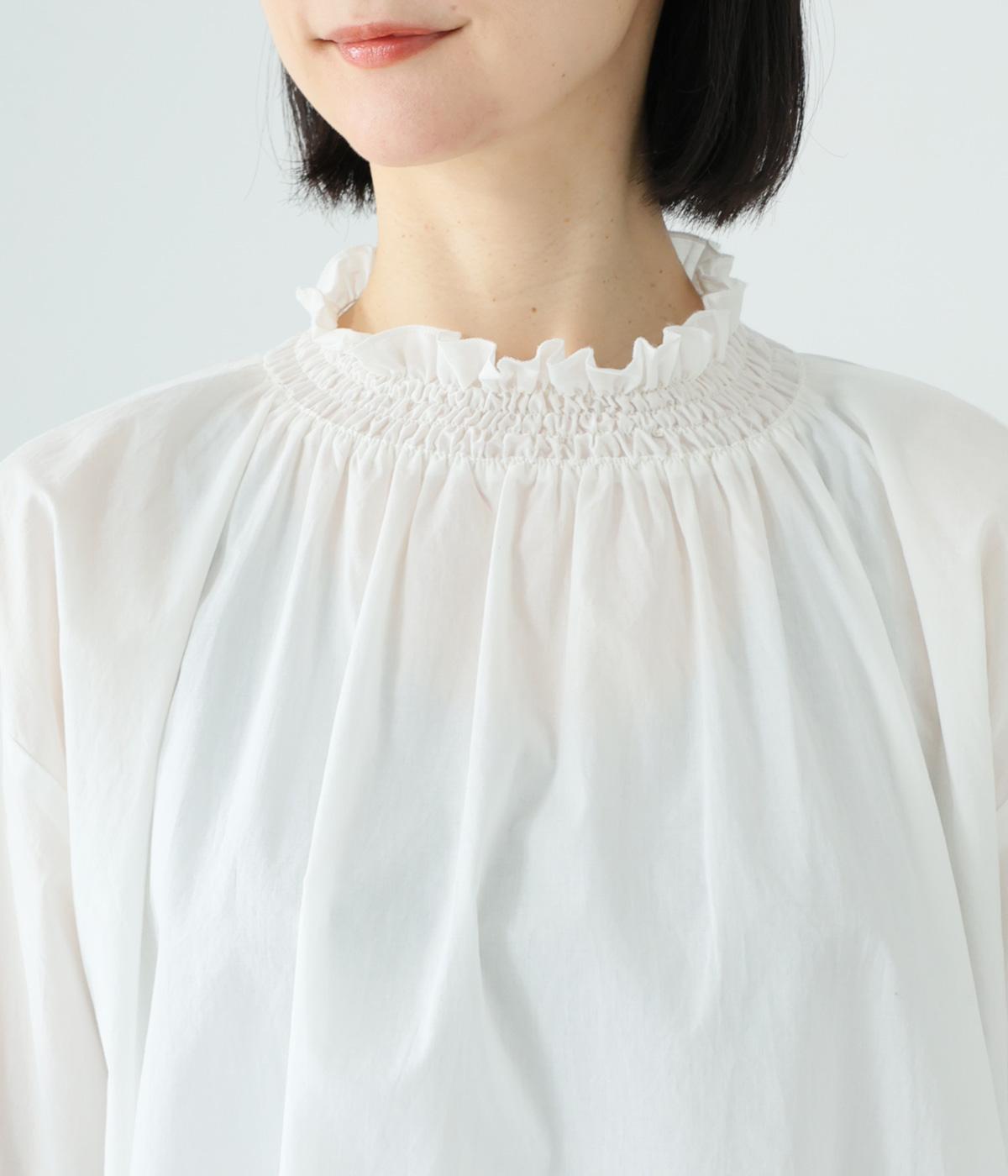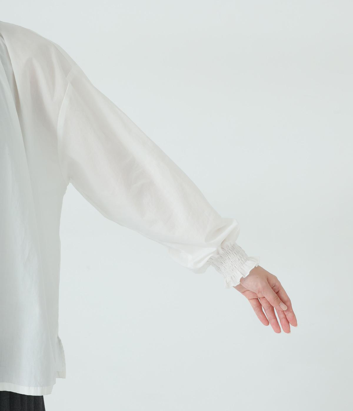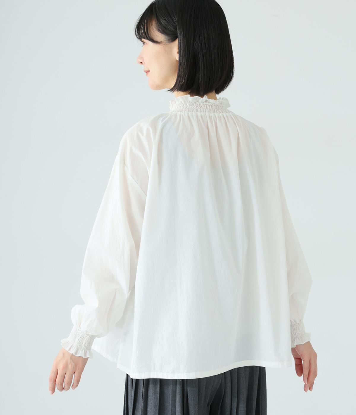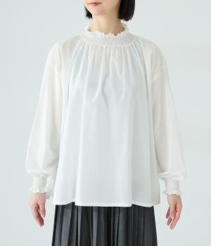 襟と袖口にゴムを入れたシャーリングデザインが大人かわいいブラウス。たっぷりのギャザーで、体のラインをカバーするゆとりのあるシルエットに仕上げています。裾両サイドのスリットが横姿に抜け感を演出。一枚でもインナーとしても活躍する着まわし力の高さも魅力です。