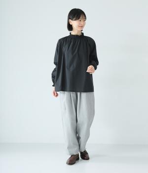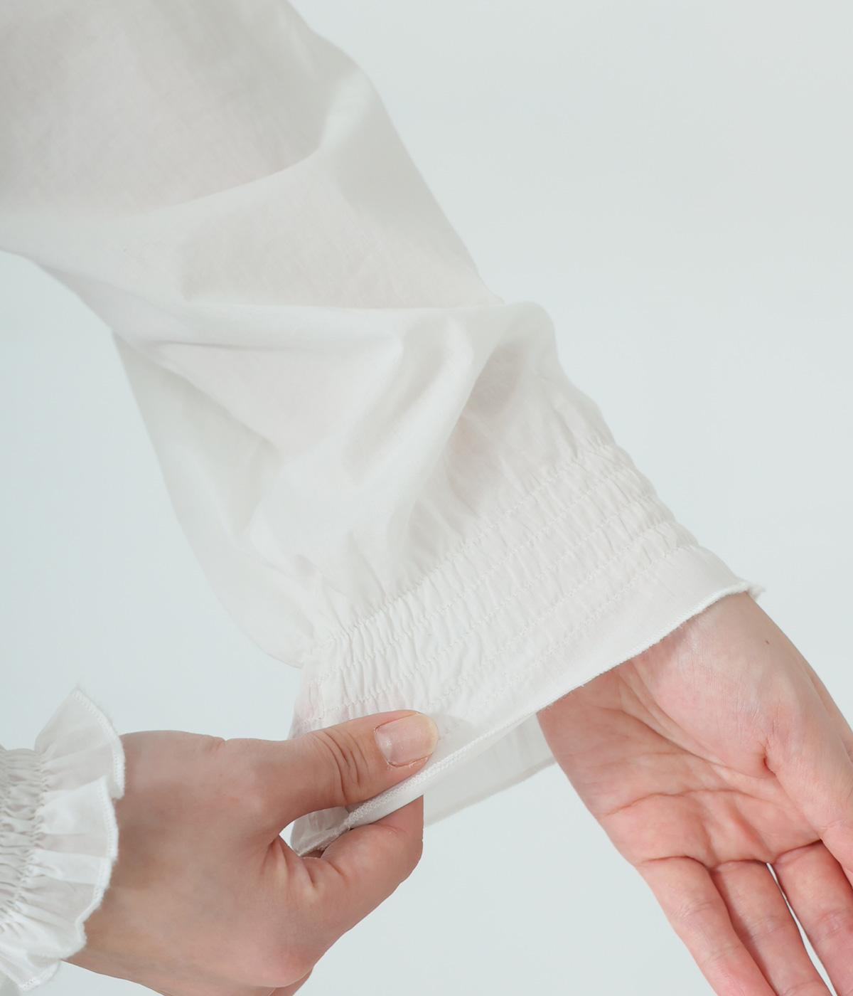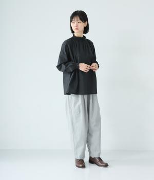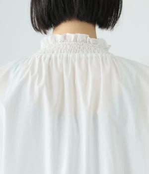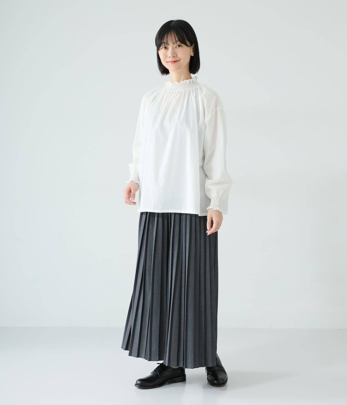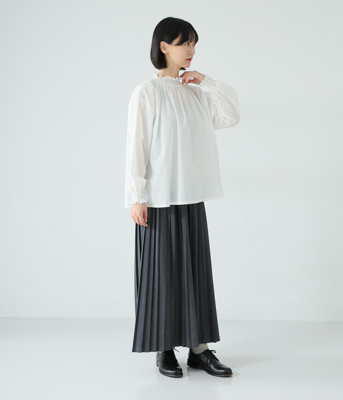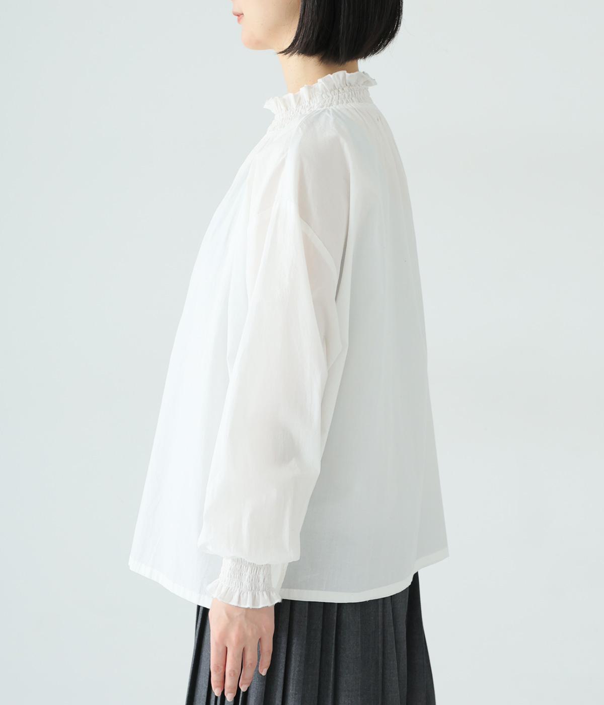 襟と袖口にゴムを入れたシャーリングデザインが大人かわいいブラウス。たっぷりのギャザーで、体のラインをカバーするゆとりのあるシルエットに仕上げています。裾両サイドのスリットが横姿に抜け感を演出。一枚でもインナーとしても活躍する着まわし力の高さも魅力です。