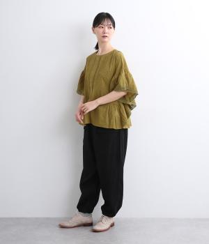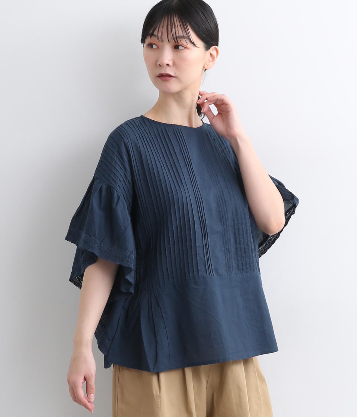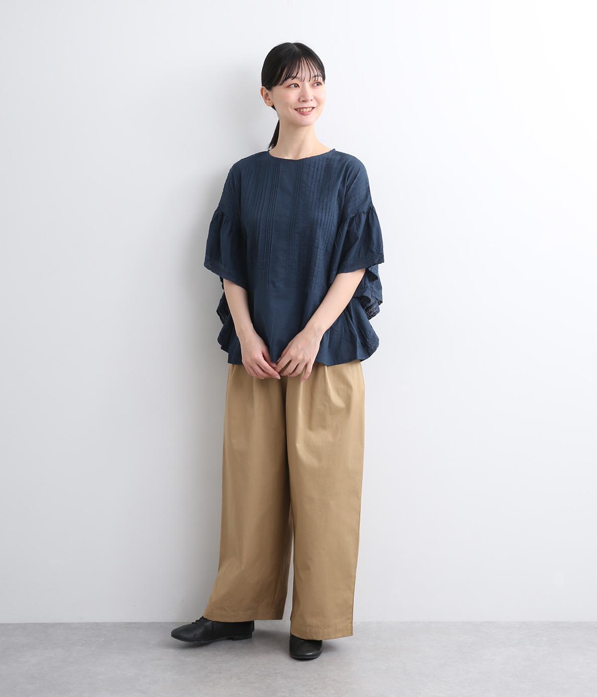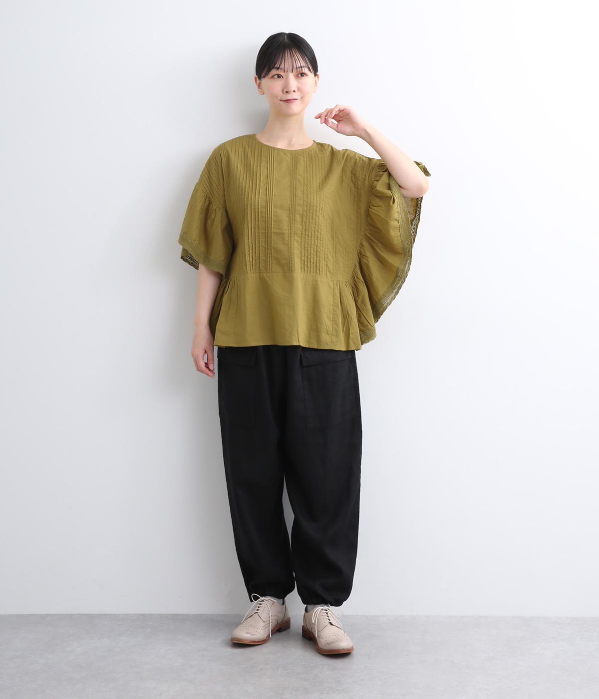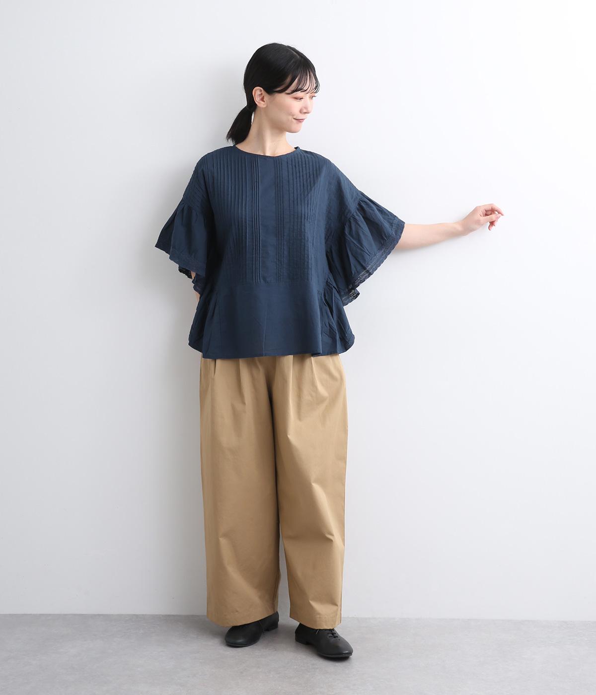 ふんだんにほどこしたピンタックやフリルスリーブ、レース使いでロマンティックなディテールを盛り込みました。ナチュラル素材で甘さをおさえているので着こなしやすく、パンツにもスカートにも合わせやすい着丈です。