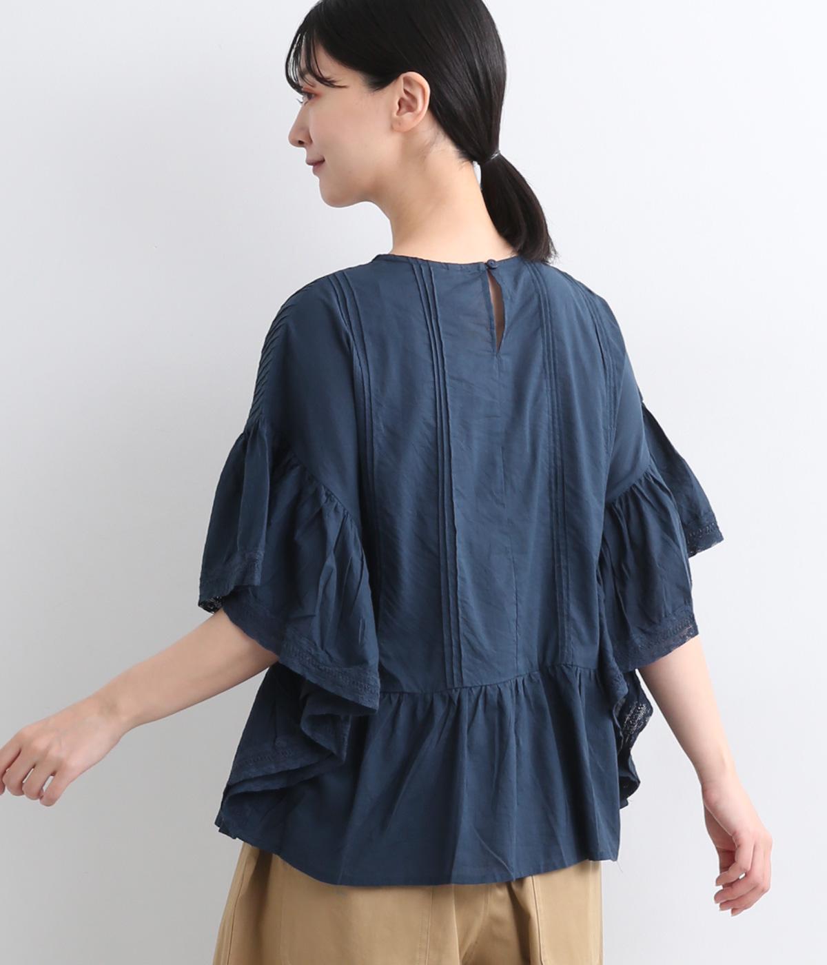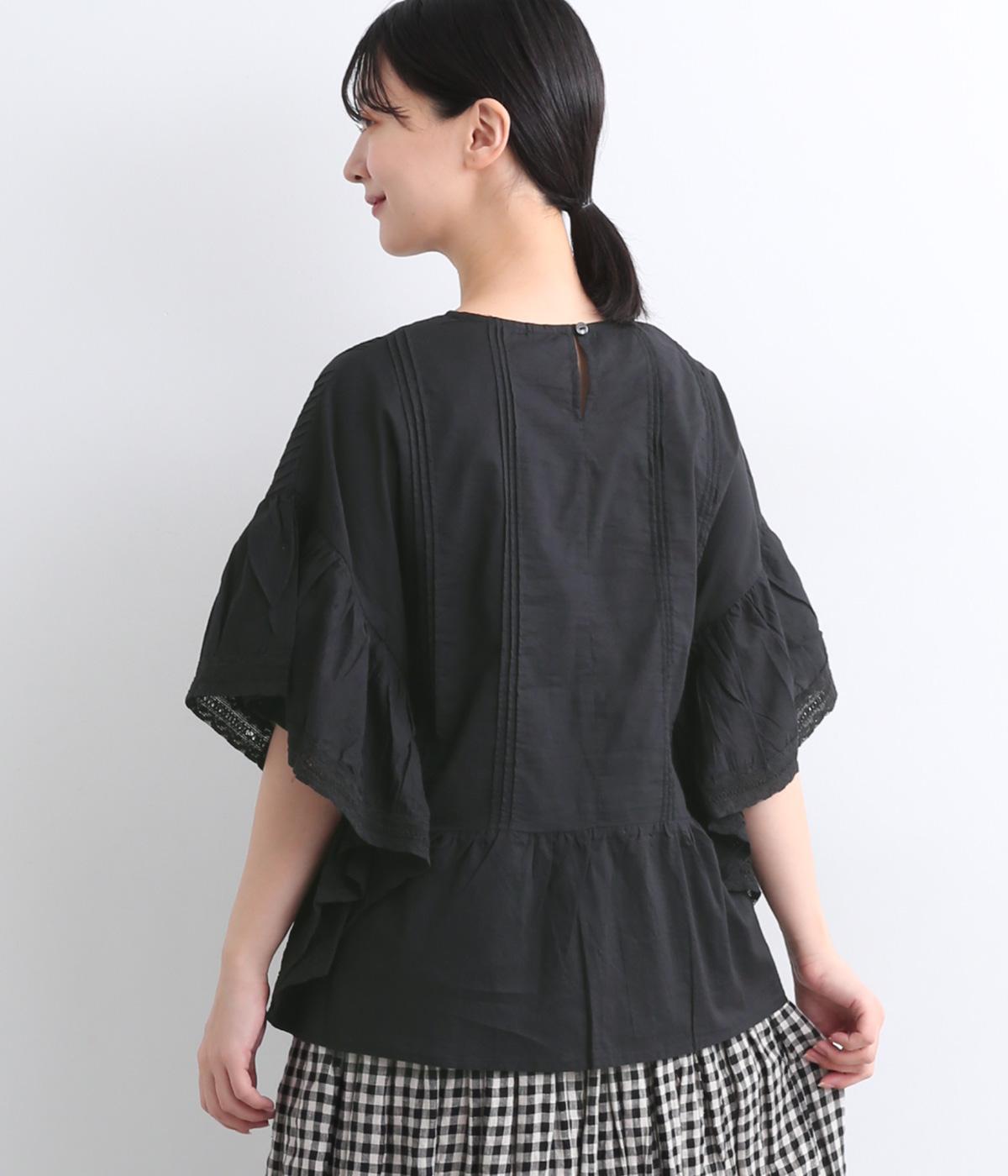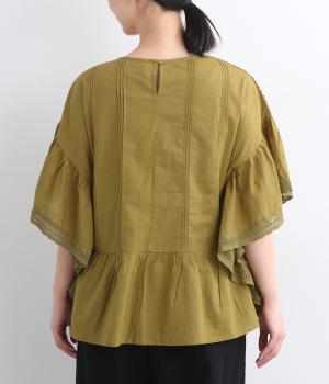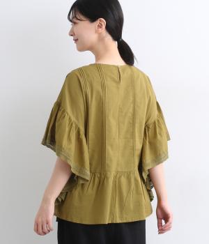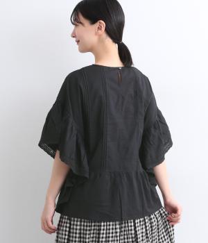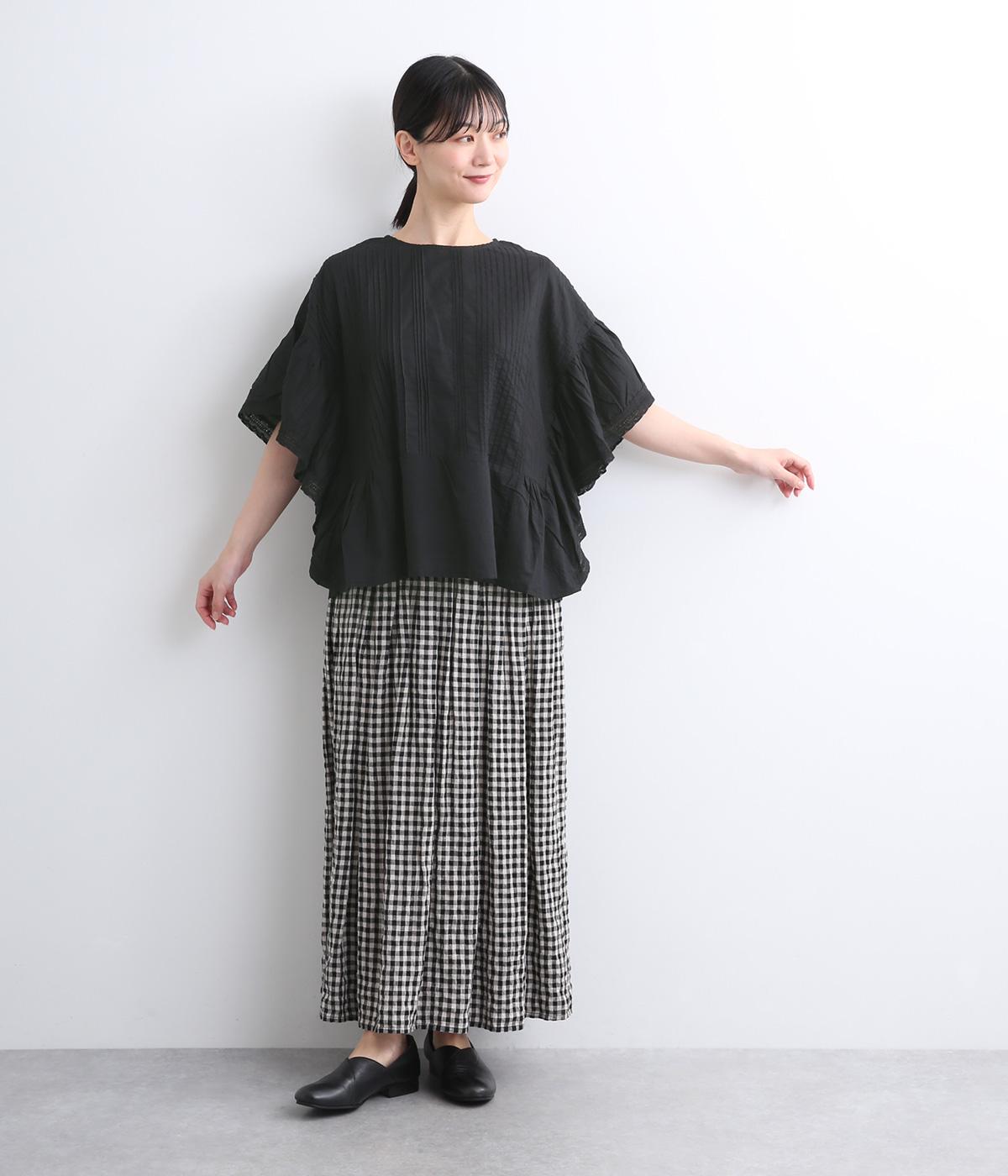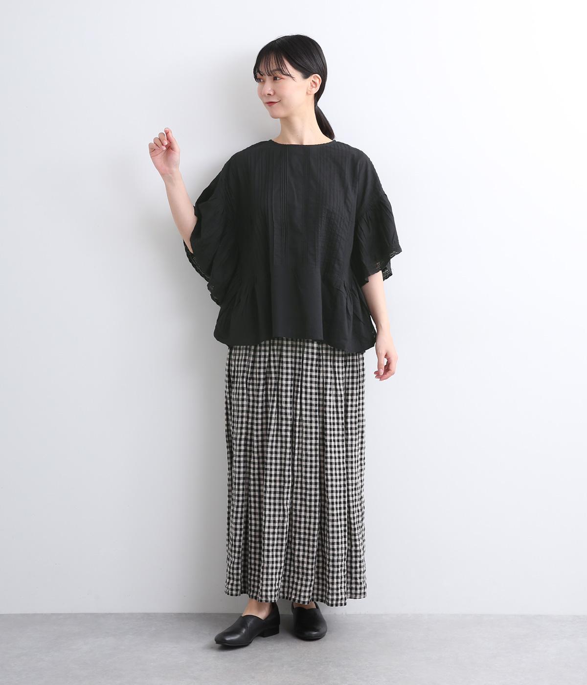 ふんだんにほどこしたピンタックやフリルスリーブ、レース使いでロマンティックなディテールを盛り込みました。ナチュラル素材で甘さをおさえているので着こなしやすく、パンツにもスカートにも合わせやすい着丈です。