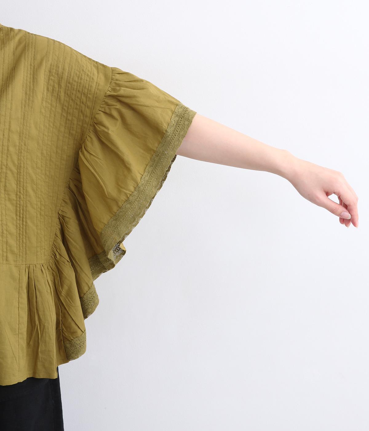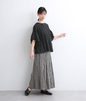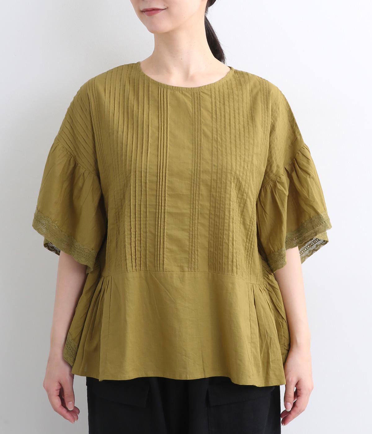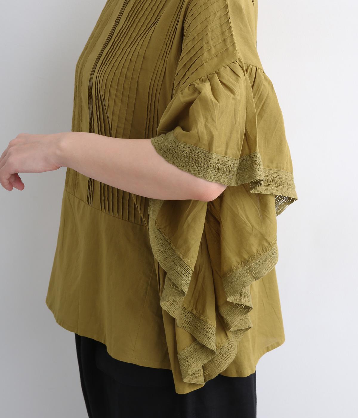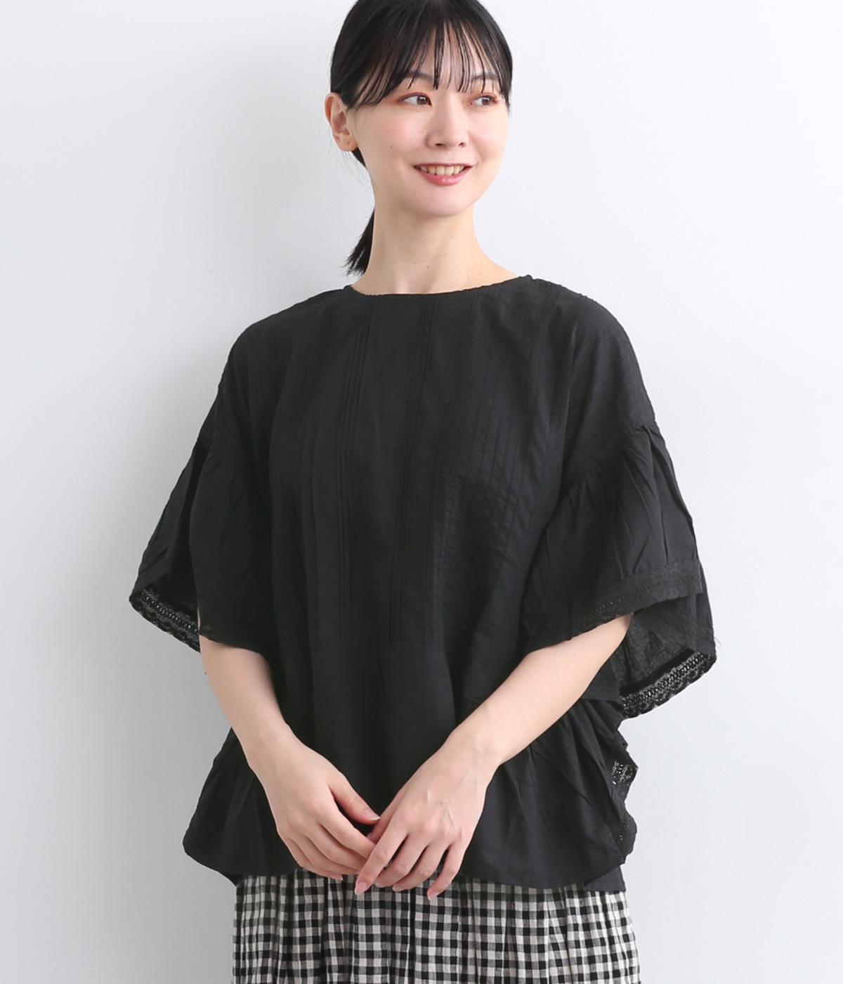 ふんだんにほどこしたピンタックやフリルスリーブ、レース使いでロマンティックなディテールを盛り込みました。ナチュラル素材で甘さをおさえているので着こなしやすく、パンツにもスカートにも合わせやすい着丈です。