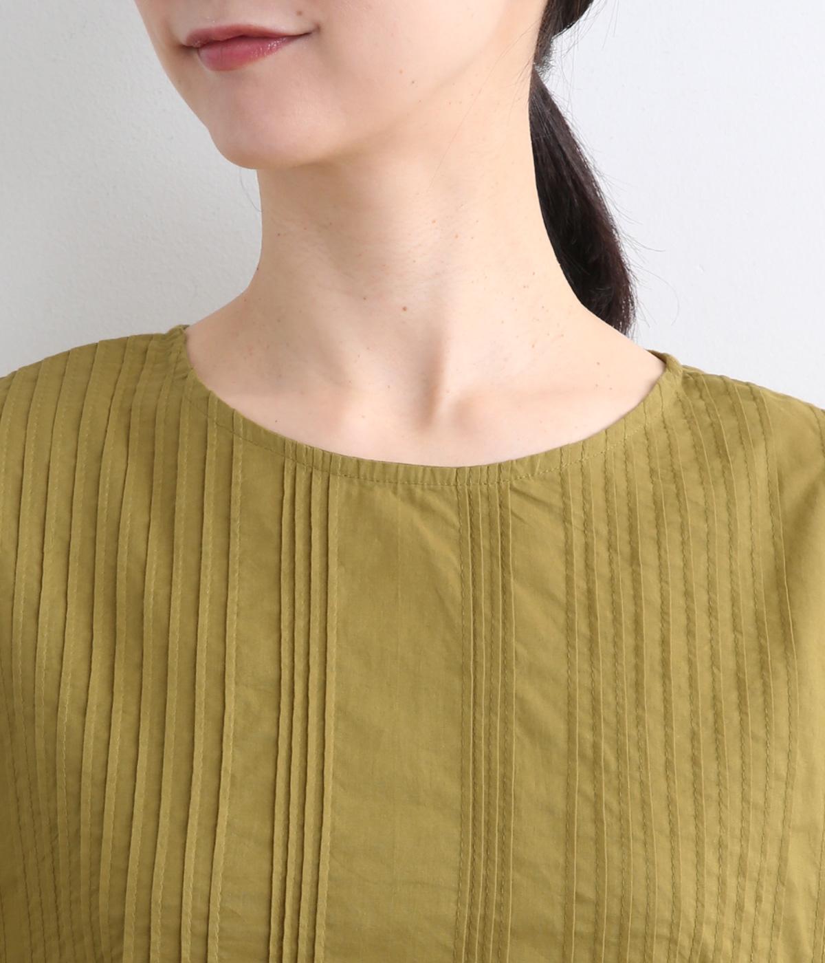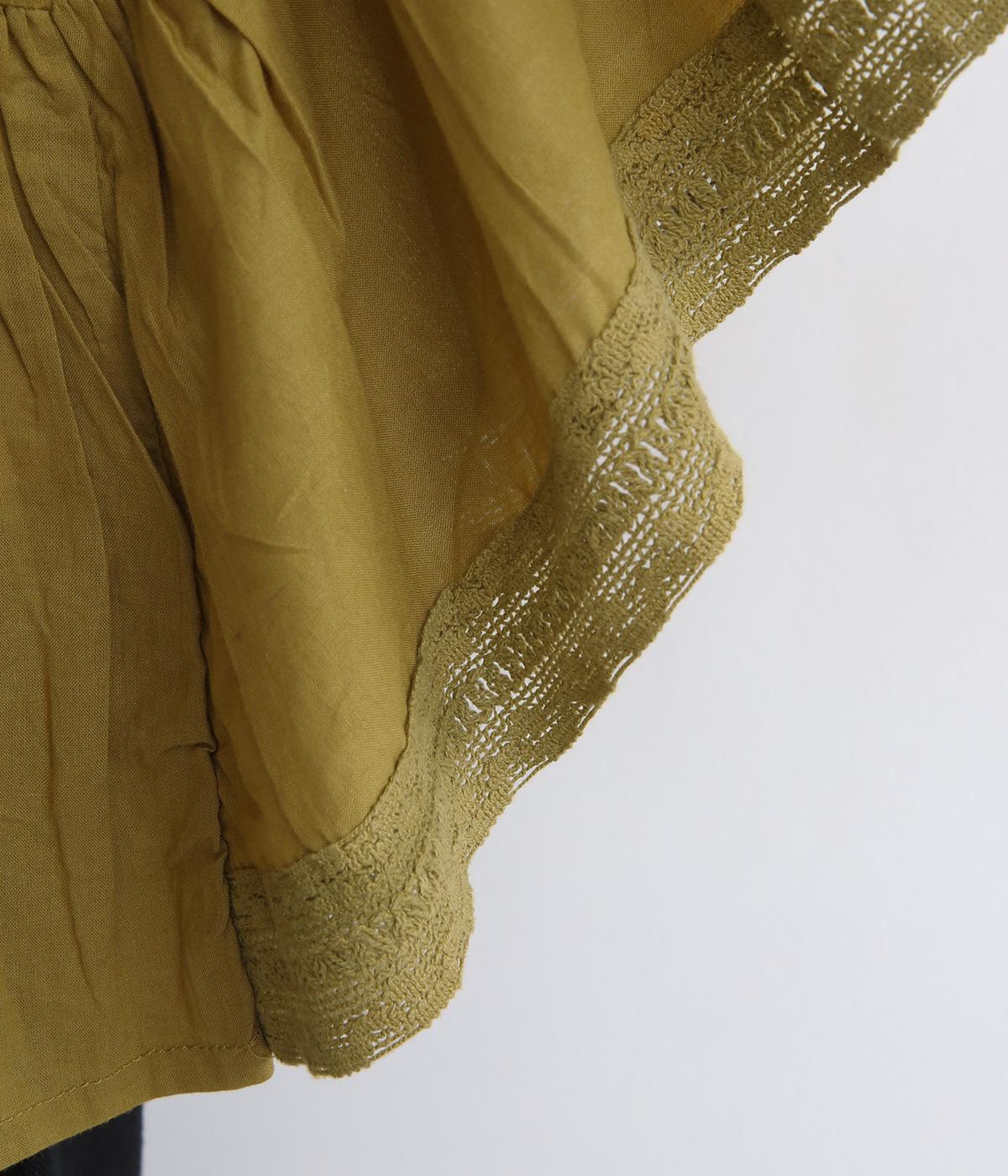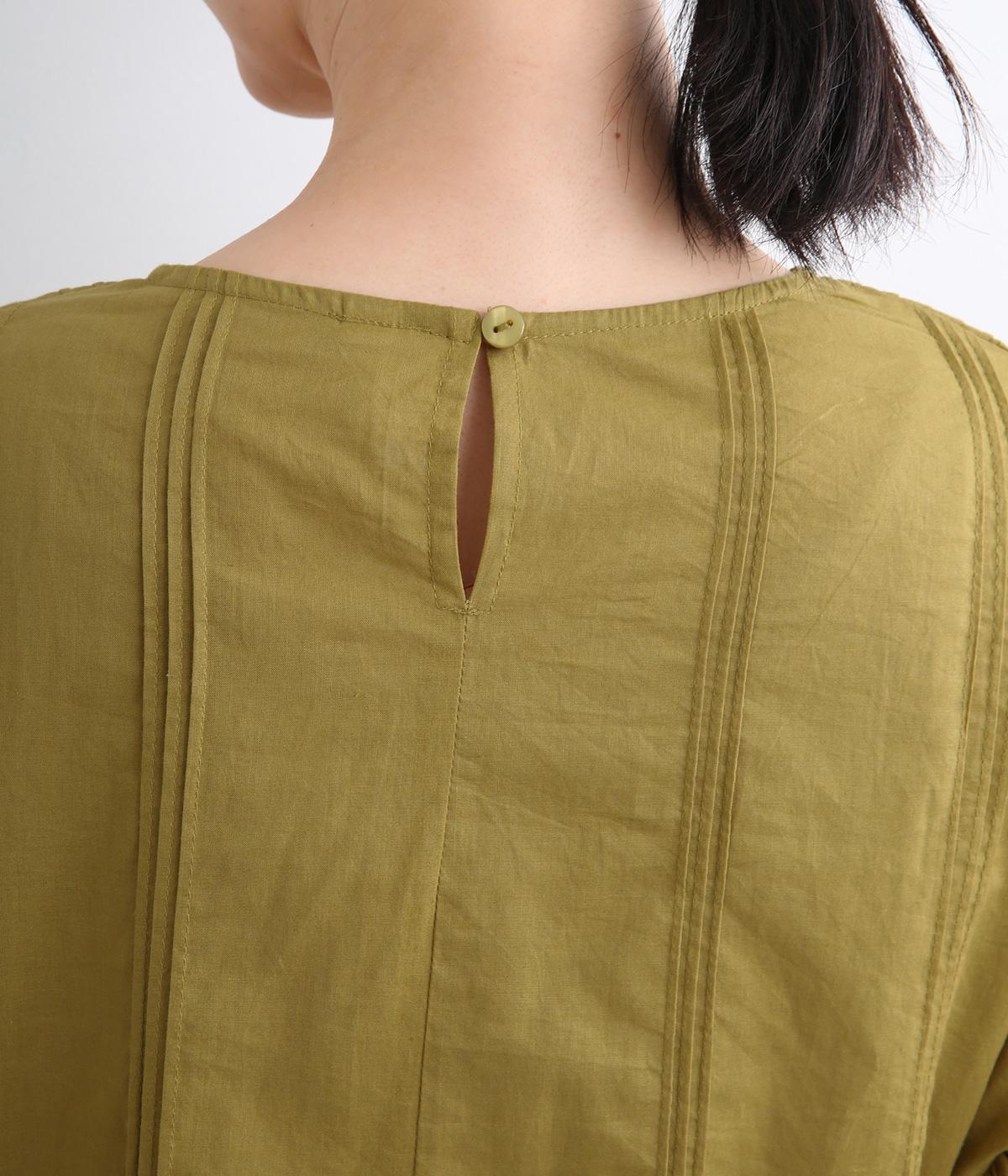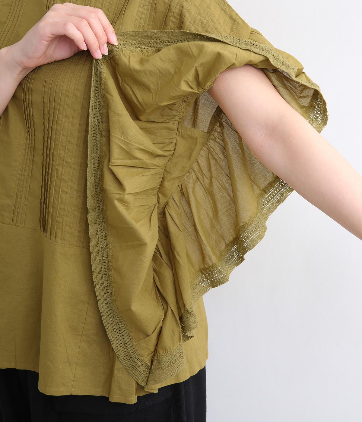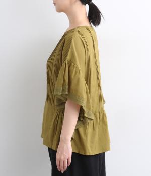 ふんだんにほどこしたピンタックやフリルスリーブ、レース使いでロマンティックなディテールを盛り込みました。ナチュラル素材で甘さをおさえているので着こなしやすく、パンツにもスカートにも合わせやすい着丈です。