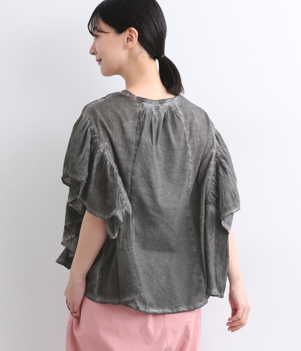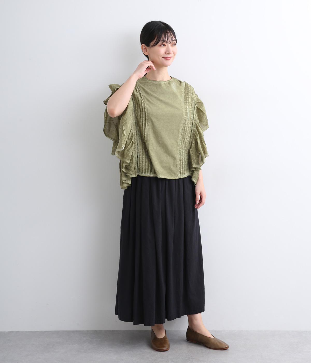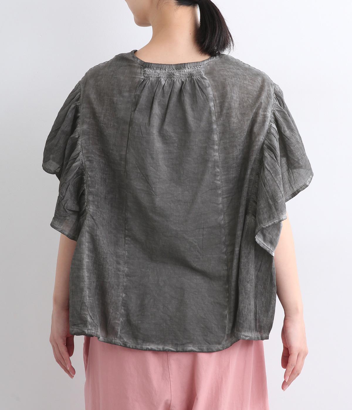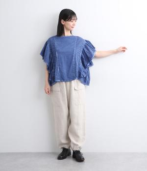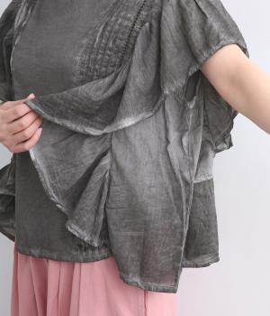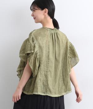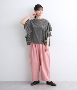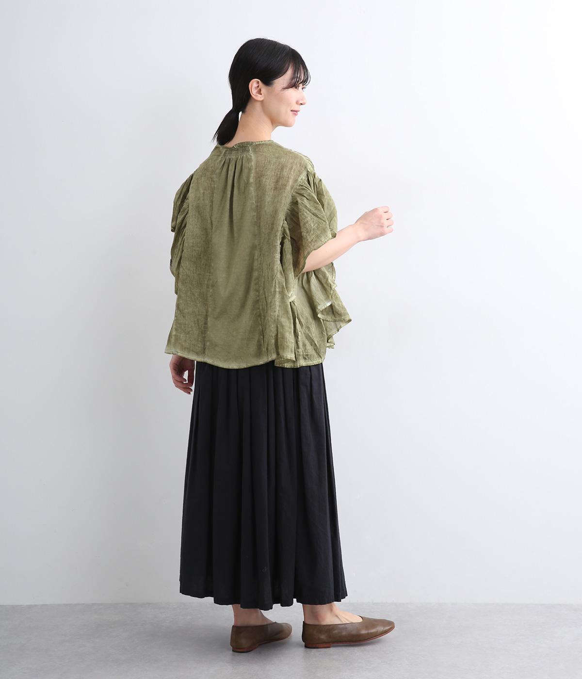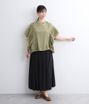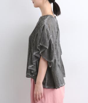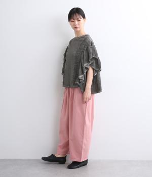 ガーリーテイストをふんだんに盛り込みつつ、雰囲気のいい生地でこなれ感ある一枚に仕上げました。身幅にゆとりがあるので着心地も良く、風通しの良さもポイント。後ろのゴムシャーリングが頭の通りをスムーズにしてくれます。