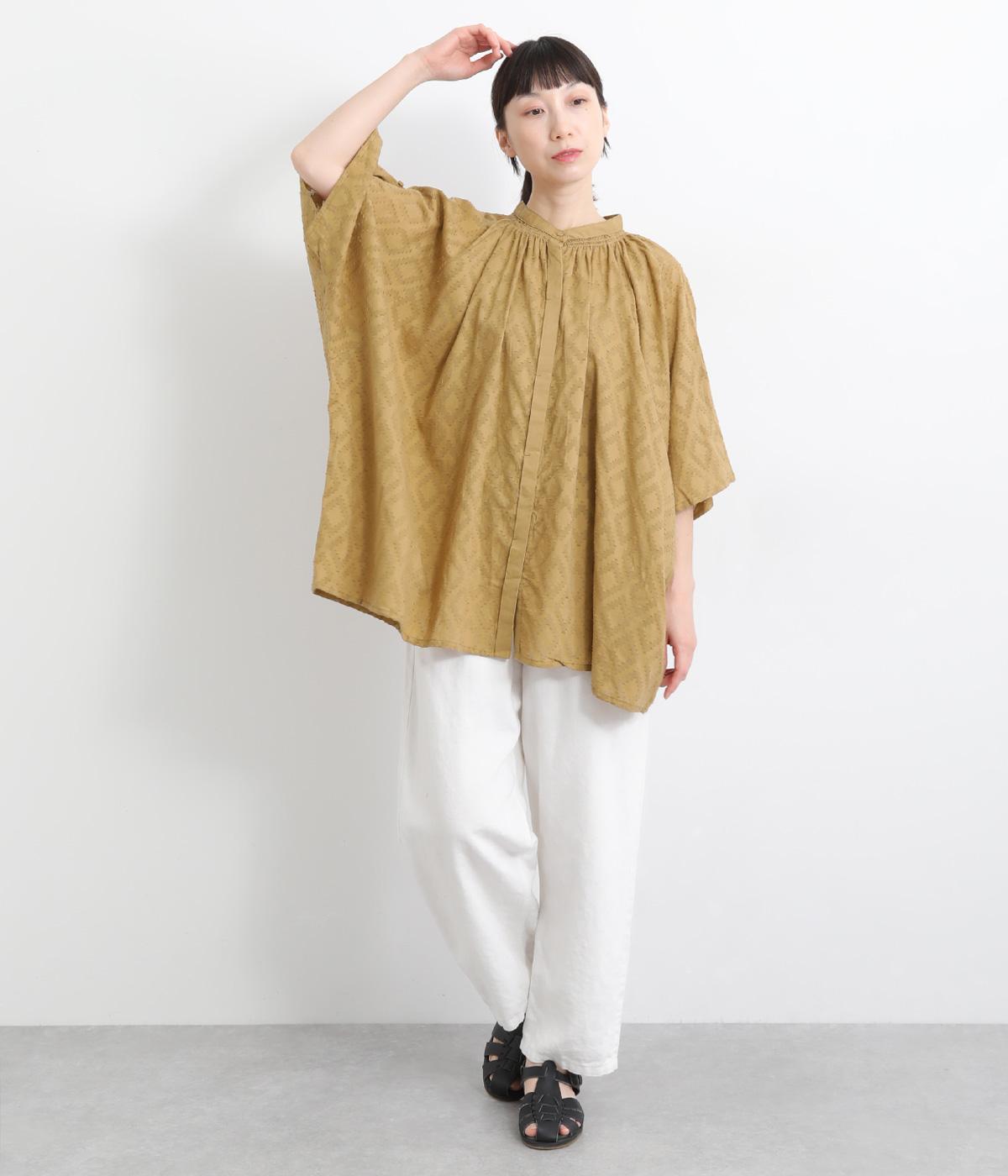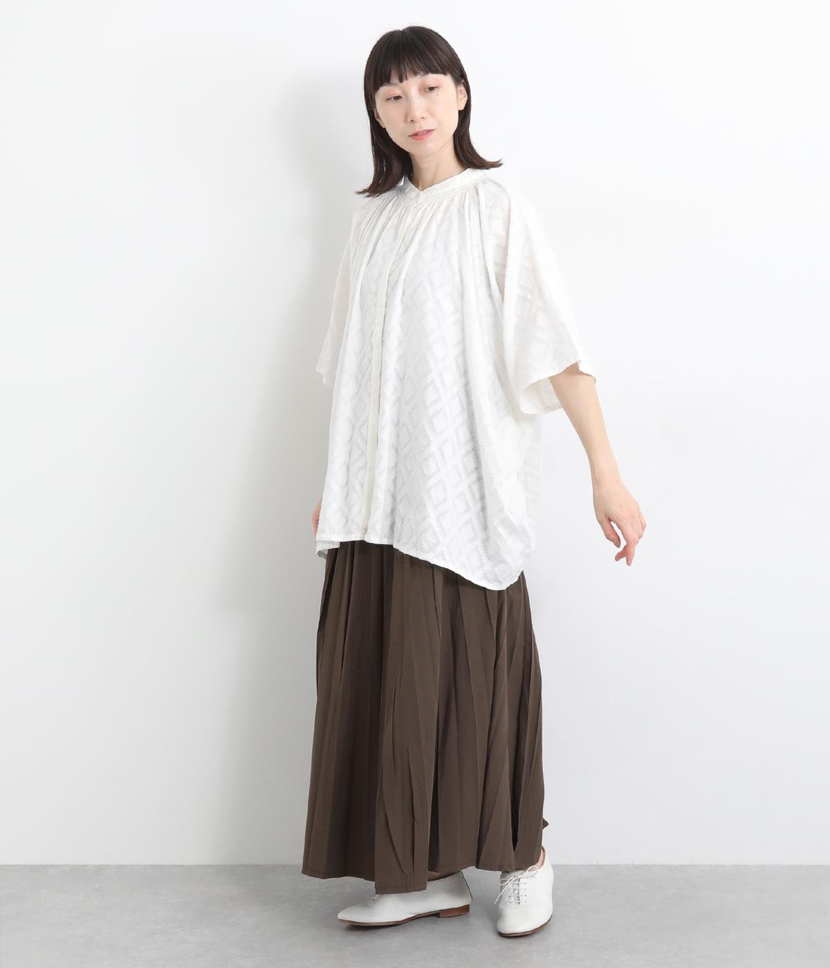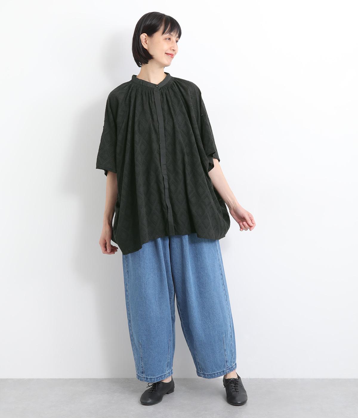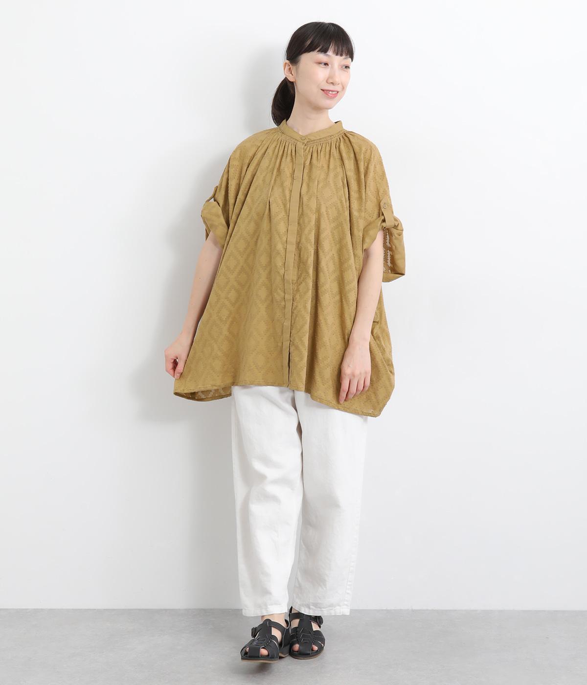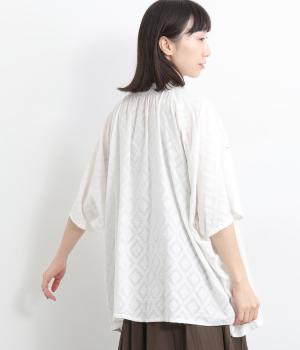 ベースの生地に糸を織りこむことで独特の凹凸が表現された、印象的なダイヤ柄のコットンドビー生地を採用。適度な凹凸感で肌にまとわりつきにくく、さらっと着用できるのがグッドポイント。