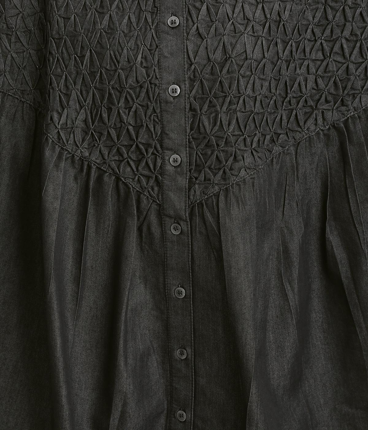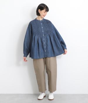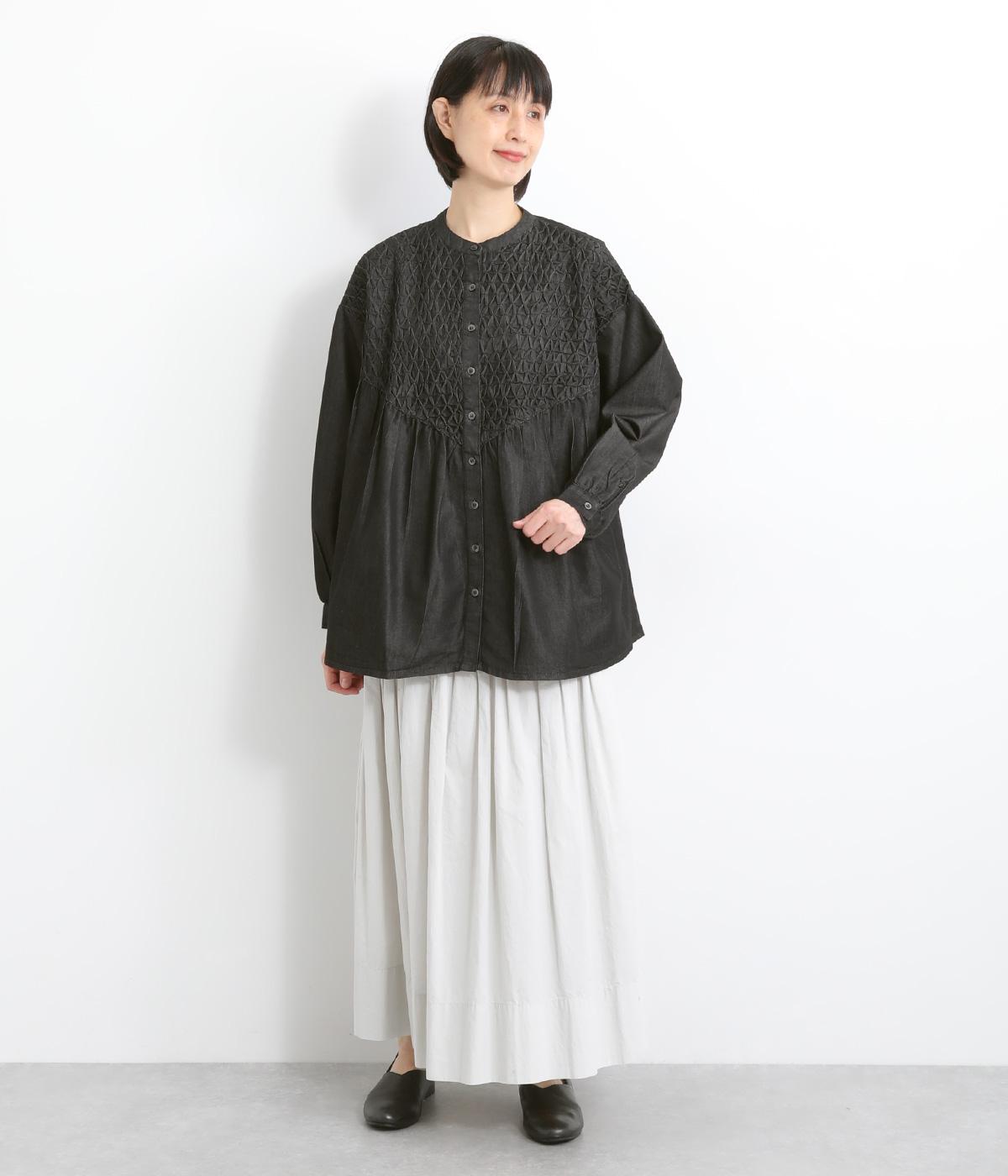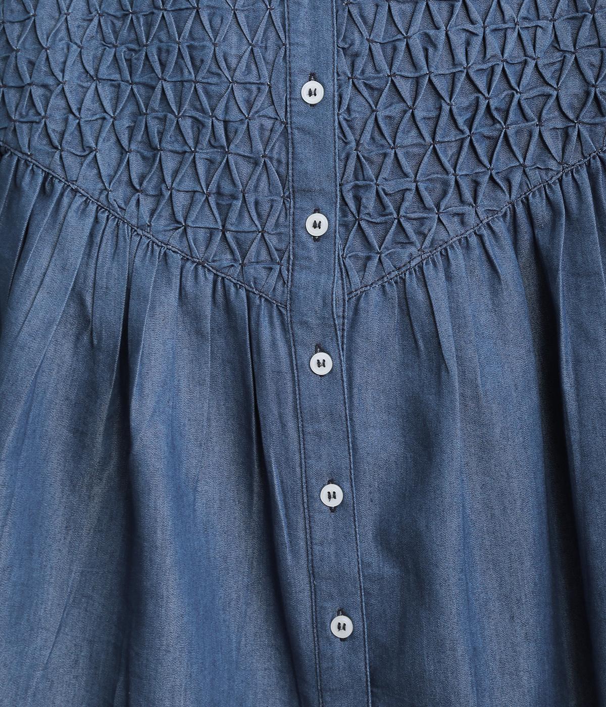 身頃上部のスモッキングディテールがアイキャッチになったデニムシャツです。フレアシルエットが着映えして、カジュアルな素材ながらフェミニンテイストに。袖口はギャザーを寄せてふわりとさせ、羽織りにもなる前あき仕様です。