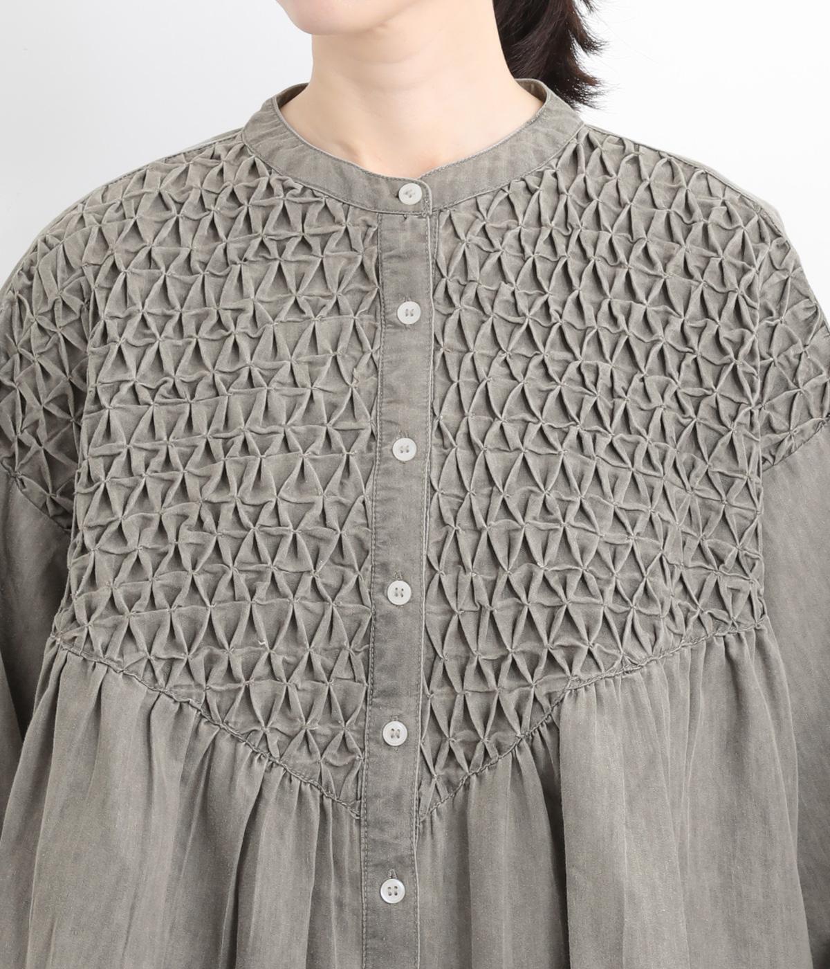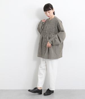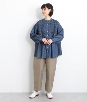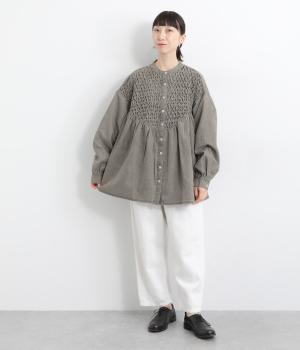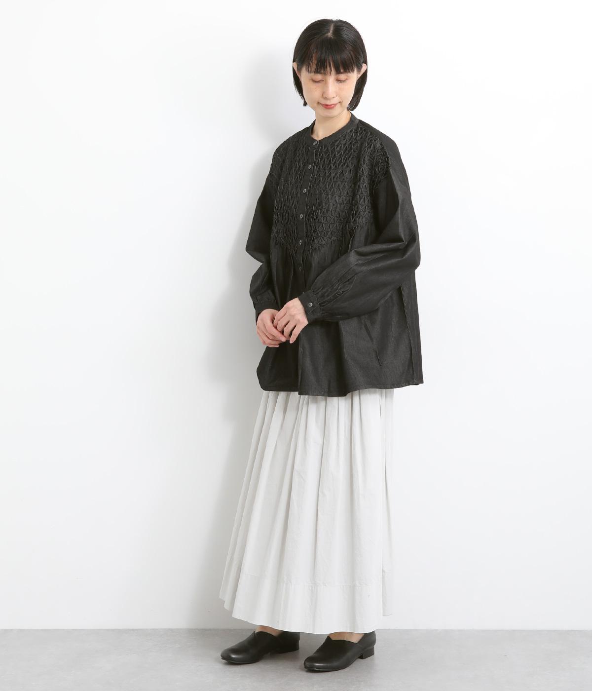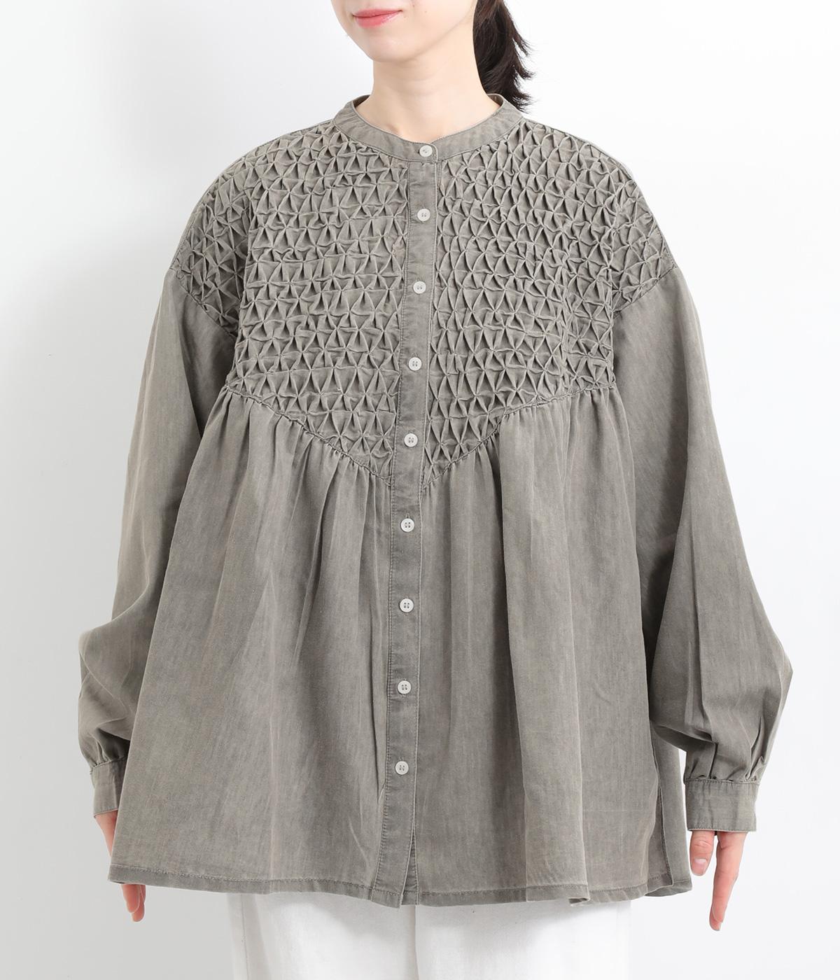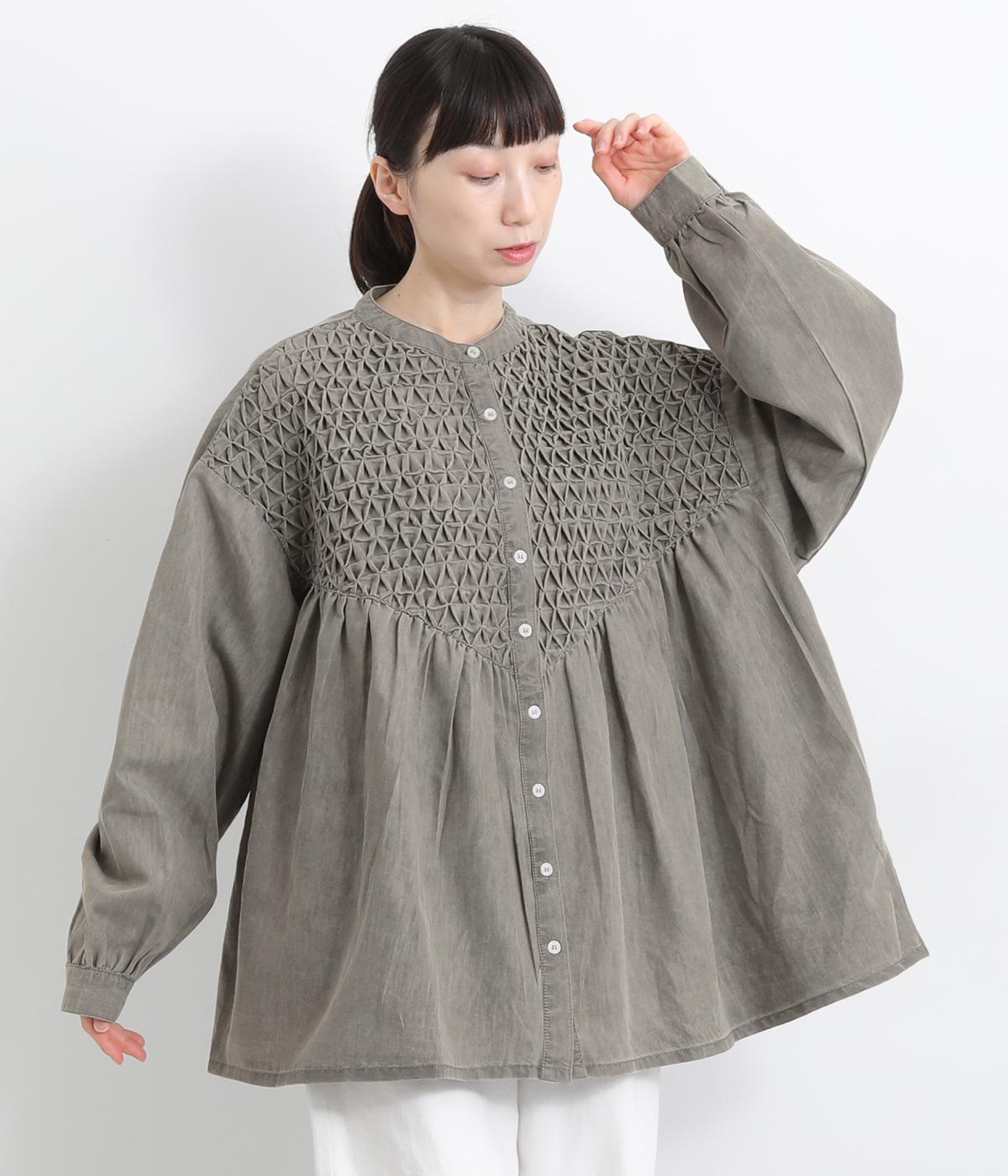 身頃上部のスモッキングディテールがアイキャッチになったデニムシャツです。フレアシルエットが着映えして、カジュアルな素材ながらフェミニンテイストに。袖口はギャザーを寄せてふわりとさせ、羽織りにもなる前あき仕様です。